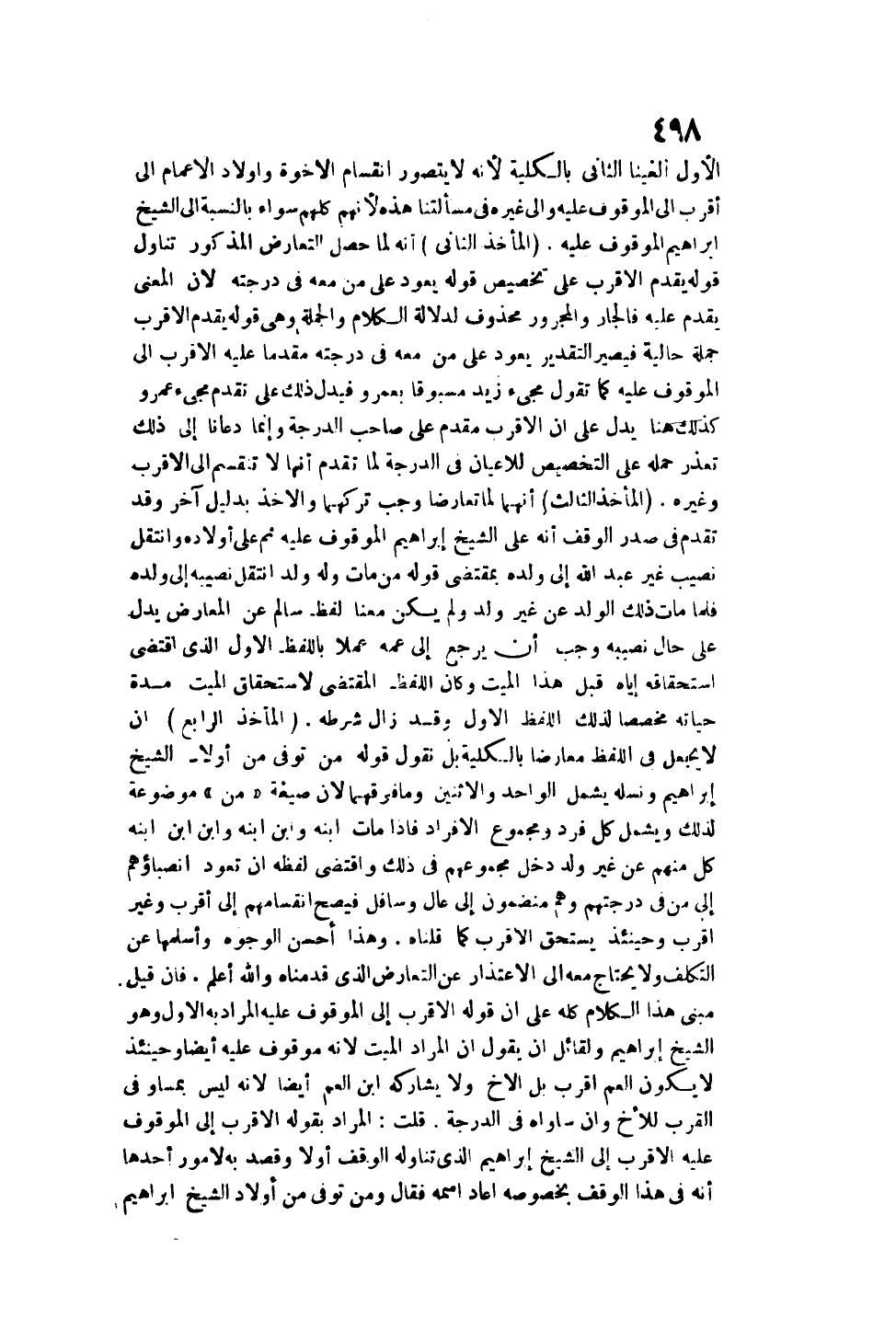 (الْمَأْخَذُ الثَّالِثُ) أَنَّهُمَا لَمَّا تَعَارَضَا وَجَبَ تَرْكُهُمَا وَالْأَخْذُ بِدَلِيلٍ آخَرَ وَقَدْ تَقَدَّمَ فِي صَدْرِ الْوَقْفِ أَنَّهُ عَلَى الشَّيْخِ إبْرَاهِيمَ الْمَوْقُوفِ عَلَيْهِ ثُمَّ عَلَى أَوْلَادِهِ وَانْتَقَلَ نَصِيبُ غَيْرِ عَبْدِ اللَّهِ إلَى وَلَدِهِ بِمُقْتَضَى قَوْلِهِ مَنْ مَاتَ وَلَهُ وَلَدٌ انْتَقَلَ نَصِيبُهُ إلَى وَلَدِهِ فَلَمَّا مَاتَ ذَلِكَ الْوَلَدُ عَنْ غَيْرِ وَلَدٍ وَلَمْ يَكُنْ مَعَنَا لَفْظٌ سَالِمٌ عَنْ الْمُعَارِضِ يَدُلُّ عَلَى حَالِ نَصِيبِهِ وَجَبَ أَنْ يَرْجِعَ إلَى عَمِّهِ عَمَلًا بِاللَّفْظِ الْأَوَّلِ الَّذِي اقْتَضَى اسْتِحْقَاقَهُ إيَّاهُ قَبْلَ هَذَا الْمَيِّتِ وَكَانَ اللَّفْظُ الْمُقْتَضِي لِاسْتِحْقَاقِ الْمَيِّتِ مُدَّةَ حَيَاتِهِ مُخَصَّصًا لِذَلِكَ اللَّفْظِ الْأَوَّلِ وَقَدْ زَالَ شَرْطُهُ.