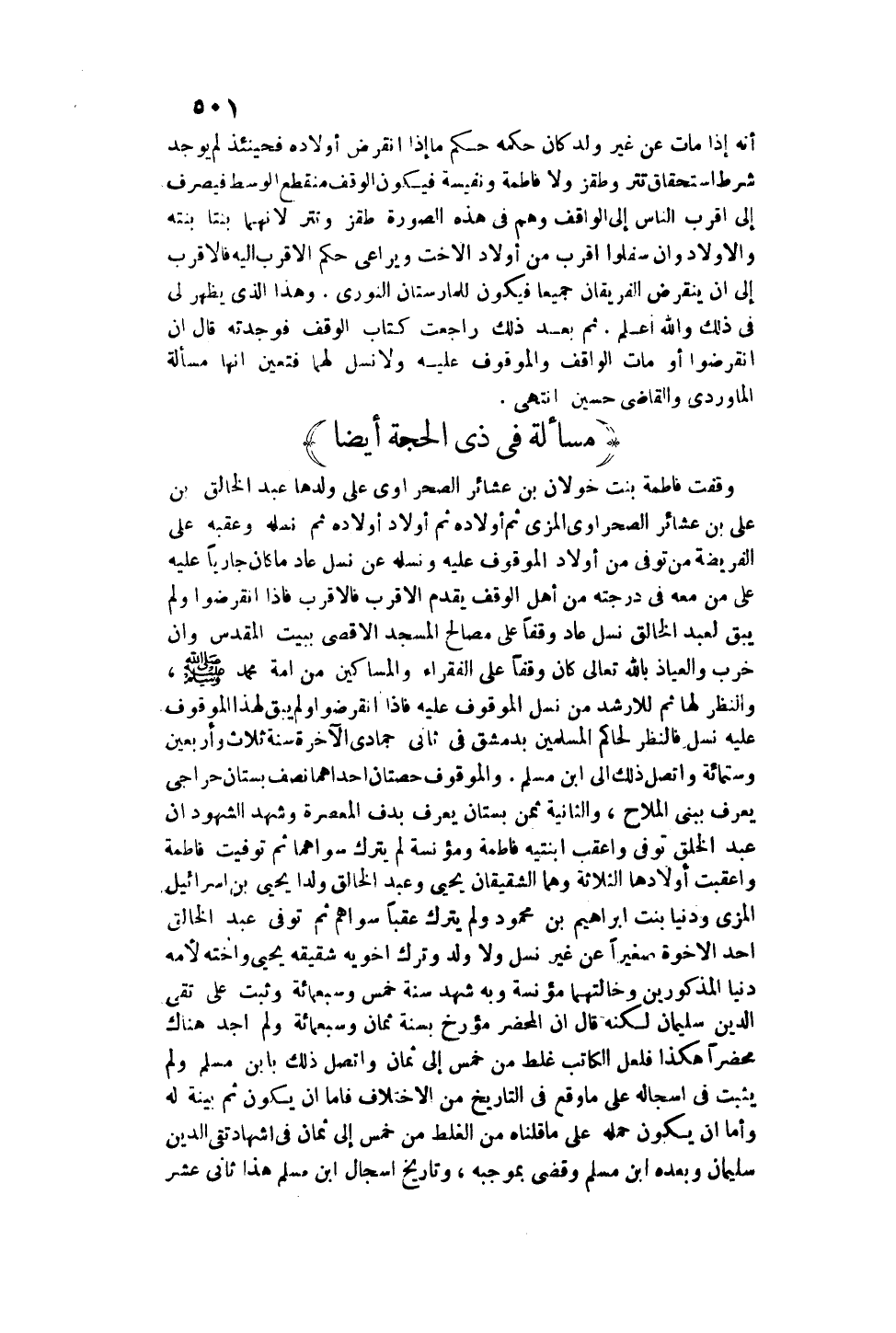 وَالْمَوْقُوفُ حِصَّتَانِ: إحْدَاهُمَا نِصْفُ بُسْتَانِ حِرَاجِي يُعْرَفُ بِبَنِي الْمِلَاحِ، وَالثَّانِيَةُ ثَمَنُ بُسْتَانٍ يُعْرَفُ بِدُفِّ الْمَعْصَرَةِ وَشَهِدَ الشُّهُودُ أَنَّ عَبْدَ الْخَالِقِ تُوُفِّيَ وَأَعْقَبَ ابْنَتَيْهِ فَاطِمَةَ وَمُؤْنِسَةَ لَمْ يَتْرُكْ سِوَاهُمَا ثُمَّ تُوُفِّيَتْ فَاطِمَةُ وَأَعْقَبَتْ أَوْلَادَهَا الثَّلَاثَةَ وَهُمَا الشَّقِيقَانِ يَحْيَى وَعَبْدُ الْخَالِقِ وَلَدَا يَحْيَى بْنِ إسْرَائِيلَ الْمُزَنِيِّ وَدُنْيَا بِنْتُ إبْرَاهِيمَ بْنِ مَحْمُودٍ وَلَمْ يَتْرُكْ عَقِبًا سِوَاهُمْ ثُمَّ تُوُفِّيَ عَبْدُ الْخَالِقِ أَحَدُ الْإِخْوَةِ صَغِيرًا عَنْ غَيْرِ نَسْلٍ وَلَا وَلَدَ وَتَرَكَ أَخَوَيْهِ شَقِيقَهُ يَحْيَى وَأُخْتَه لِأُمِّهِ دُنْيَا الْمَذْكُورَيْنِ وَخَالَتُهُمَا مُؤْنِسَةُ وَبِهِ شَهِدَ سَنَةَ خَمْسٍ وَسَبْعِمِائَةٍ وَثَبَتَ عَلَى تَقِيِّ الدِّينِ سُلَيْمَانَ لَكِنَّهُ قَالَ: إنَّ الْمَحْضَرَ مُؤَرَّخٌ بِسَنَةِ ثَمَانٍ وَسَبْعِمِائَةٍ وَلَمْ أَجِدْ هُنَاكَ مَحْضَرًا هَكَذَا فَلَعَلَّ الْكَاتِبَ غَلِطَ مِنْ خَمْسٍ إلَى ثَمَانٍ وَاتَّصَلَ ذَلِكَ بِابْنِ مُسْلِمٍ وَلَمْ يُثْبِتْ فِي أَسْجَالِهِ عَلَى مَا وَقَعَ فِي التَّارِيخِ مِنْ الِاخْتِلَافِ فَإِمَّا أَنْ يَكُونَ ثَمَّ بَيِّنَةٌ لَهُ وَإِمَّا أَنْ يَكُونَ حَمَلَهُ عَلَى مَا قُلْنَاهُ مِنْ الْغَلَطِ مِنْ خَمْسٍ إلَى ثَمَانٍ فِي إشْهَادِ تَقِيِّ الدِّينِ سُلَيْمَانَ وَبَعْدَهُ ابْنُ مُسْلِمٍ وَقَضَى بِمُوجِبِهِ.