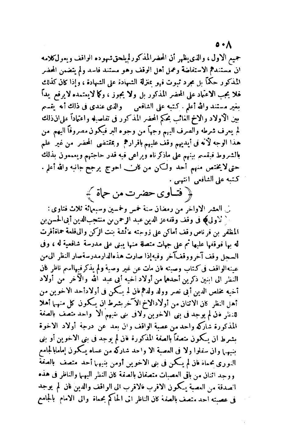 (الْأُولَى) فِي وَقْفٍ وَقَفَهُ عِزُّ الدِّينِ عَبْدُ الرَّحْمَنِ بْنِ مُنْتَجِبِ الدِّينِ أَبِي الْحَسَنِ بْنِ الْمُظَفَّرِ بْنِ فِرْنَاصَ وَقَفَ أَمَاكِنَ عَلَى زَوْجَتِهِ عَائِشَةَ بِنْتِ الرُّكْنِ وَالِي قَلْعَةِ حَمَاةَ أَقَرَّتْ لَهُ بِهَا فَوَقَفَهَا عَلَيْهَا ثُمَّ عَلَى جِهَاتٍ مُتَّصِلَةٍ مِنْهَا يَبْنِي عَلَيْهَا مَدْرَسَةً شَافِعِيَّةً لَهُ، وَفِي السِّجِلِّ وَقْفٌ آخَرُ وَوَقْفٌ آخَرُ وَفِيهِ إذَا صَارَتْ هَذِهِ الدَّارُ مَدْرَسَةً صَارَ النَّظَرُ إلَى مَنْ عَيَّنَهُ الْوَاقِفُ فِي كِتَابِ وَصِيَّتِهِ، فَإِنْ مَاتَ عَنْ غَيْرِ وَصِيَّةٍ وَلَمْ يَذْكُرْ فِيهَا اسْمَ نَاظِرٍ كَانَ النَّظَرُ إلَى ابْنَيْنِ ذَكَرَيْنِ: أَحَدُهُمَا مِنْ أَوْلَادِ أَخِيهِ أَبِي عَبْدِ اللَّهِ وَالْآخَرِ مِنْ أَوْلَادِ أَخِيهِ مُخْلِصِ الدِّينِ أَبِي نَصْرٍ وَوَلَدِهِ وَلَدهُمْ، فَإِنْ لَمْ يَكُنْ فِي أَوْلَادِ أَحَدِ الْأَخَوَيْنِ مِنْ أَهْلِ النَّظَرِ كَانَ الِاثْنَانِ مِنْ أَوْلَادِ الْأَخِ الْآخَرِ بِشَرْطِ أَنْ يَكُونَ كُلٌّ مِنْهُمَا أَهْلًا لِلنَّظَرِ، فَإِنْ لَمْ يُوجَدْ فِي بَنِي الْأَخَوَيْنِ وَلَا فِي بَنِي بَنِيهِمْ إلَّا وَاحِدٌ مُتَّصِفٌ بِالصِّفَةِ الْمَذْكُورَةِ شَارَكَهُ وَاحِدٌ مِنْ عَصَبَةِ الْوَاقِفِ وَإِنْ بَعُدَ عَنْ دَرَجَةِ أَوْلَادِ الْإِخْوَةِ بِشَرْطِ أَنْ يَكُونَ مُتَّصِفًا بِالصِّفَةِ الْمَذْكُورَةِ، فَإِنْ لَمْ يُوجَدْ فِي بَنِي الْأَخَوَيْنِ أَوْ بَنِي بَنِيهِمَا وَإِنْ سَفَلُوا وَلَا فِي الْعَصَبَةِ إلَّا وَاحِدٌ شَارَكَهُ مَنْ عَسَاهُ يَكُونُ إمَامًا بِالْجَامِعِ النَّوَوِيِّ بِحَمَاةِ، فَإِنْ لَمْ يَكُنْ فِي بَنِي الْأَخَوَيْنِ أَوْ مِنْ بَنِيهِمَا أَحَدٌ مُتَّصِفٌ بِالصِّفَةِ وَوُجِدَ اثْنَانِ مِنْ بَاقِي الْعَصَبَاتِ مُتَّصِفَانِ بِالصِّفَةِ كَانَ النَّظَرُ إلَيْهِمَا وَالنَّاظِرُ فِي هَذِهِ الصَّدَقَةِ مِنْ الْعَصَبَةِ يَكُونُ الْأَقْرَبُ فَالْأَقْرَبُ إلَى الْوَاقِفِ وَالدَّيْنِ، فَإِنْ لَمْ يُوجَدْ فِي عَصَبَتِهِ أَحَدٌ مُتَّصِفٌ بِالصِّفَةِ كَانَ النَّاظِرُ إلَى الْحَاكِمِ بِحَمَاةِ وَإِلَى الْإِمَامِ بِالْجَامِعِ