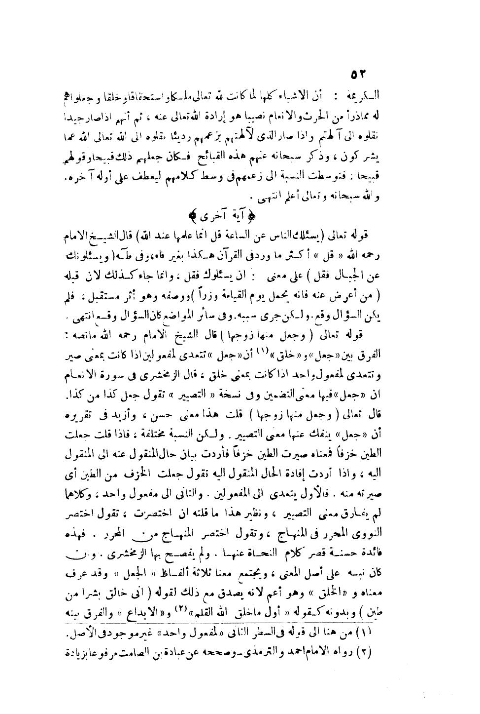 قَالَ تَعَالَى {وَجَعَلَ مِنْهَا زَوْجَهَا} [الأعراف: 189] قُلْت هَذَا مَعْنًى حَسَنٌ، وَأَزِيدُ فِي تَقْرِيرِهِ أَنَّ " جَعَلَ " يَنْفَكُّ عَنْهَا مَعْنَى التَّصْيِيرِ. وَلَكِنَّ النِّسْبَةَ مُخْتَلِفَةٌ، فَإِذَا قُلْت جَعَلْت الطِّينَ خَزَفًا فَمَعْنَاهُ صَيَّرْت الطِّينَ خَزَفًا فَأَرَدْت بَيَانَ حَالِ الْمَنْقُولِ عَنْهُ إلَى الْمَنْقُولِ إلَيْهِ، وَإِذَا أَرَدْت إفَادَةَ الْحَالِ الْمَنْقُولِ إلَيْهِ تَقُولُ جَعَلْت الْخَزَفَ مِنْ الطِّينِ أَيْ صَيَّرْته مِنْهُ. فَالْأَوَّلُ يَتَعَدَّى إلَى الْمَفْعُولَيْنِ. وَالثَّانِي إلَى مَفْعُولٍ وَاحِدٍ، وَكِلَاهُمَا لَمْ يُفَارِقْ مَعْنَى التَّصْيِيرِ، وَنَظِيرُ هَذَا مَا قُلْته إنْ اخْتَصَرْت، تَقُولُ اخْتَصَرَ النَّوَوِيُّ الْمُحَرَّرَ فِي الْمِنْهَاجِ، وَتَقُولُ اخْتَصَرَ الْمِنْهَاجَ مِنْ الْمُحَرَّرِ. فَهَذِهِ فَائِدَةٌ حَسَنَةٌ قَصُرَ كَلَامُ النُّحَاةِ عَنْهَا. وَلَمْ يُفْصِحْ بِهَا الزَّمَخْشَرِيُّ. وَإِنْ كَانَ نَبَّهَ عَلَى أَصْلِ الْمَعْنَى، وَيَجْتَمِعُ مَعَنَا ثَلَاثَةُ أَلْفَاظٍ " الْجَعْلُ " وَقَدْ عُرِفَ مَعْنَاهُ وَ " الْخَلْقُ " وَهُوَ أَعَمُّ لِأَنَّهُ يَصْدُقُ مَعَ ذَلِكَ لِقَوْلِهِ {إِنِّي خَالِقٌ بَشَرًا مِنْ طِينٍ} [ص: 71] وَبِدُونِهِ كَقَوْلِهِ «أَوَّلُ مَا خَلَقَ اللَّهُ الْقَلَمَ» وَ " الْإِبْدَاعُ " وَالْفَرْقُ بَيْنَهُ