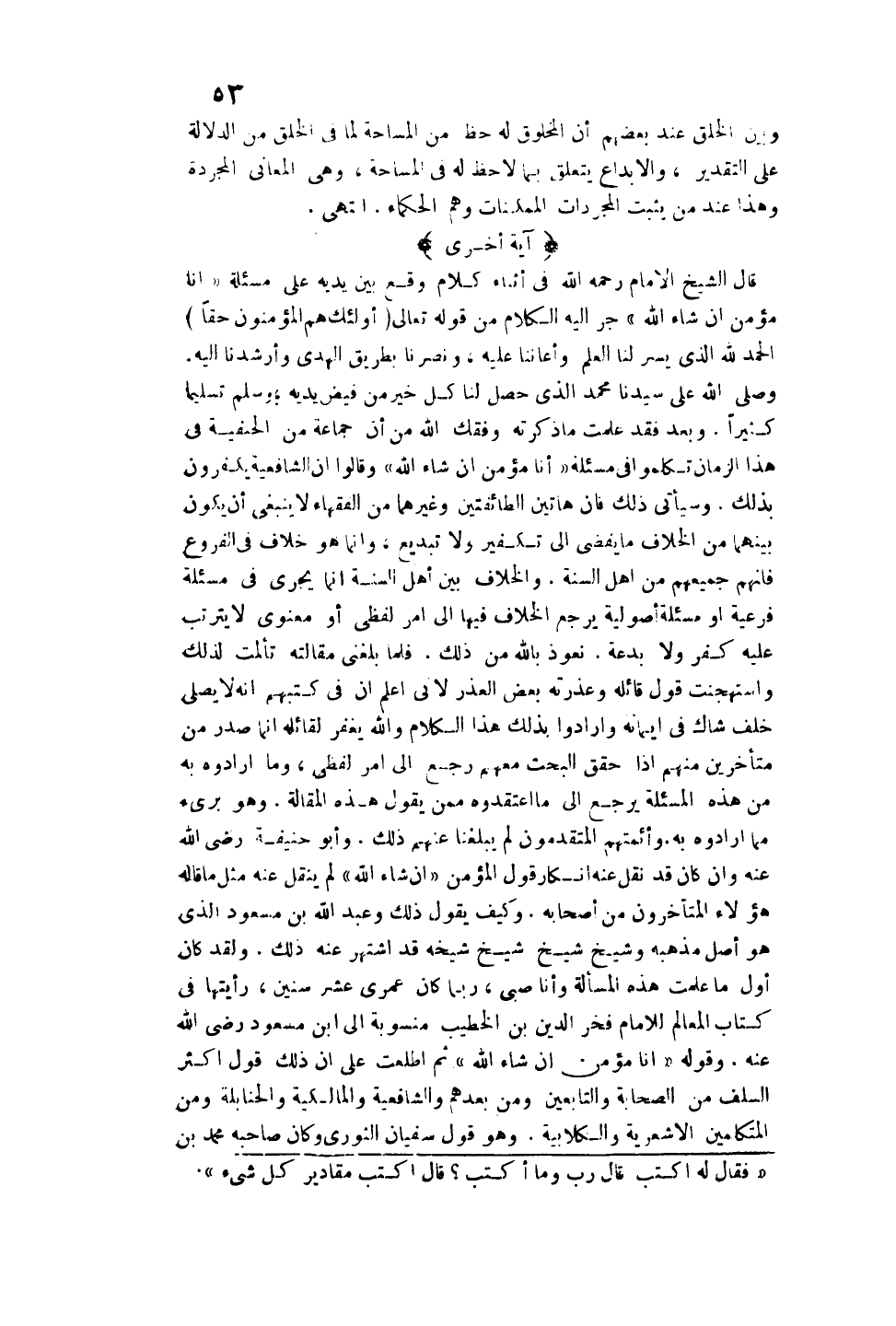 وَصَلَّى اللَّهُ عَلَى سَيِّدِنَا مُحَمَّدٍ الَّذِي حَصَّلَ لَنَا كُلَّ خَيْرٍ مِنْ فَيْضِ يَدَيْهِ؛ وَسَلَّمَ تَسْلِيمًا كَثِيرًا. وَبَعْدُ فَقَدْ عَلِمْت مَا ذَكَرْته وَفَّقَكَ اللَّهُ مِنْ أَنَّ جَمَاعَةً مِنْ الْحَنَفِيَّةِ فِي هَذَا الزَّمَانِ تَكَلَّمُوا فِي مَسْأَلَةِ " أَنَا مُؤْمِنٌ إنْ شَاءَ اللَّهُ " وَقَالُوا إنَّ الشَّافِعِيَّةَ يُكَفِّرُونَ بِذَلِكَ. وَسَيَأْتِي ذَلِكَ فَإِنَّ هَاتَيْنِ الطَّائِفَتَيْنِ وَغَيْرُهُمَا مِنْ الْفُقَهَاءِ لَا يَنْبَغِي أَنْ يَكُونَ بَيْنَهُمَا مِنْ الْخِلَافِ مَا يُفْضِي إلَى تَكْفِيرٍ وَلَا تَبْدِيعٍ، وَإِنَّمَا هُوَ خِلَافٌ فِي الْفُرُوعِ فَإِنَّهُمْ جَمِيعُهُمْ مِنْ أَهْلِ السُّنَّةِ. وَالْخِلَافُ بَيْنَ أَهْلِ السُّنَّةِ إنَّمَا يَجْرِي فِي مَسْأَلَةٍ فَرْعِيَّةٍ أَوْ مَسْأَلَةٍ أُصُولِيَّةٍ يَرْجِعُ الْخِلَافُ فِيهَا إلَى أَمْرٍ لَفْظِيٍّ أَوْ مَعْنَوِيٍّ لَا يَتَرَتَّبُ عَلَيْهِ كُفْرٌ وَلَا بِدْعَةٌ. نَعُوذُ بِاَللَّهِ مِنْ ذَلِكَ. فَلَمَّا بَلَغَنِي مَقَالَتَهُ تَأَلَّمْت لِذَلِكَ وَاسْتَهْجَنْت قَوْلَ قَائِلِهِ وَعَذَرْته بَعْضَ الْعُذْرِ لِأَنِّي أَعْلَمُ أَنَّ فِي كُتُبِهِمْ أَنَّهُ لَا يُصَلَّى خَلْفَ شَاكٍّ فِي إيمَانِهِ وَأَرَادُوا بِذَلِكَ هَذَا الْكَلَامَ وَاَللَّهُ يَغْفِرُ لِقَائِلِهِ إنَّمَا صَدَرَ مِنْ مُتَأَخِّرِينَ مِنْهُمْ إذَا حَقَّقَ الْبَحْثَ مَعَهُمْ رَجَعَ إلَى أَمْرٍ لَفْظِيٍّ، وَمَا أَرَادُوهُ بِهِ مِنْ هَذِهِ الْمَسْأَلَةِ يَرْجِعُ إلَى مَا اعْتَقَدُوهُ مِمَّنْ يَقُولُ هَذِهِ الْمَقَالَةَ. وَهُوَ بَرِيءٌ مِمَّا أَرَادُوهُ بِهِ. وَأَئِمَّتُهُمْ الْمُتَقَدِّمُونَ لَمْ يَبْلُغْنَا عَنْهُمْ ذَلِكَ. وَأَبُو حَنِيفَةَ - رَضِيَ اللَّهُ عَنْهُ - وَإِنْ كَانَ قَدْ نُقِلَ عَنْهُ إنْكَارُ قَوْلِ الْمُؤْمِنِ " إنْ شَاءَ اللَّهُ " لَمْ يُنْقَلْ عَنْهُ مِثْلُ مَا قَالَهُ هَؤُلَاءِ الْمُتَأَخِّرُونَ مِنْ أَصْحَابِهِ. وَكَيْفَ يَقُولُ ذَلِكَ وَعَبْدُ اللَّهِ بْنُ مَسْعُودٍ الَّذِي هُوَ أَصْلُ مَذْهَبِهِ وَشَيْخُ شَيْخِ شَيْخِ شَيْخِهِ قَدْ اُشْتُهِرَ عَنْهُ ذَلِكَ. وَلَقَدْ كَانَ أَوَّلُ مَا عَلِمْت هَذِهِ الْمَسْأَلَةَ وَأَنَا صَبِيٌّ، رُبَّمَا كَانَ عُمْرِي عَشْرَ سِنِينَ، رَأَيْتهَا فِي كِتَابِ الْمَعَالِمِ لِلْإِمَامِ فَخْرِ الدِّينِ بْنِ الْخَطِيبِ مَنْسُوبَةً إلَى ابْنِ مَسْعُودٍ - رَضِيَ اللَّهُ عَنْهُ - وَقَوْلُهُ " أَنَا مُؤْمِنٌ إنْ شَاءَ اللَّهُ " ثُمَّ اطَّلَعْت عَلَى أَنَّ ذَلِكَ قَوْلُ أَكْثَرِ السَّلَفِ مِنْ الصَّحَابَةِ وَالتَّابِعِينَ وَمَنْ بَعْدَهُمْ وَالشَّافِعِيَّةُ وَالْمَالِكِيَّةُ وَالْحَنَابِلَةُ وَمِنْ الْمُتَكَلِّمِينَ الْأَشْعَرِيَّةُ وَالْكُلَّابِيَّةُ. وَهُوَ قَوْلُ سُفْيَانَ الثَّوْرِيِّ وَكَانَ صَاحِبُهُ مُحَمَّدَ بْنَ يُوسُفَ الْفِرْيَابِيَّ