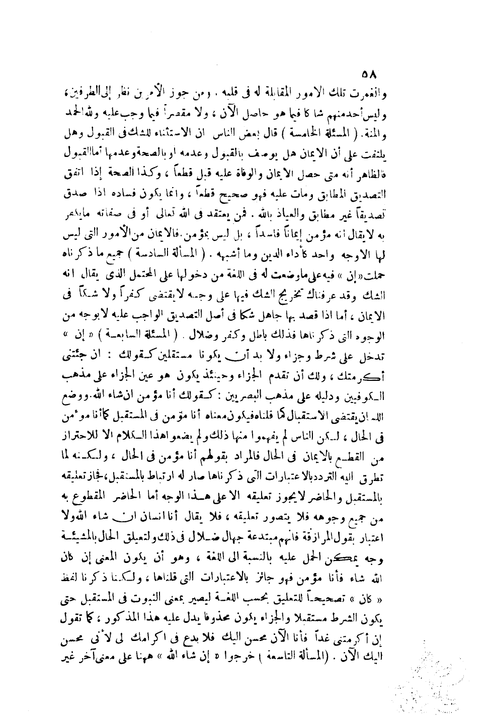 (الْمَسْأَلَةُ السَّادِسَةُ) جَمِيعُ مَا ذَكَرْنَاهُ حُمِلَتْ " إنْ " فِيهِ عَلَى مَا وُضِعَتْ لَهُ فِي اللُّغَةِ مِنْ دُخُولِهَا عَلَى الْمُحْتَمَلِ الَّذِي يُقَالُ إنَّهُ الشَّكُّ وَقَدْ عَرَّفْنَاك تَخْرِيجَ الشَّكِّ فِيهَا عَلَى وَجْهٍ لَا يَقْتَضِي كُفْرًا وَلَا شَكًّا فِي الْإِيمَانِ، أَمَّا إذَا قَصَدَ بِهَا جَاهِلٌ شَكًّا فِي أَصْلِ التَّصْدِيقِ الْوَاجِبِ عَلَيْهِ لَا بِوَجْهٍ مِنْ الْوُجُوهِ الَّتِي ذَكَرْنَاهَا فَذَلِكَ بَاطِلٌ وَكُفْرٌ وَضَلَالٌ.
