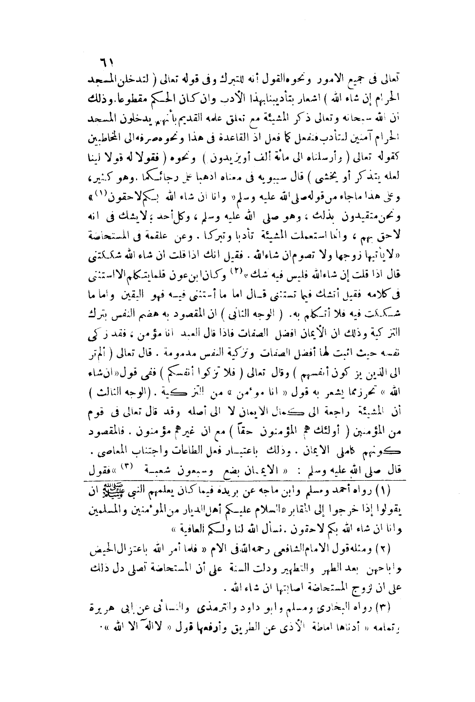 تَعَالَى فِي جَمِيعِ الْأُمُورِ وَنَحْوُهُ الْقَوْلُ إنَّهُ لِلتَّبَرُّكِ وَفِي قَوْله تَعَالَى {لَتَدْخُلُنَّ الْمَسْجِدَ الْحَرَامَ إِنْ شَاءَ اللَّهُ} [الفتح: 27] إشْعَارٌ بِتَأْدِيبِنَا بِهَذَا وَإِنْ كَانَ الْحُكْمُ مَقْطُوعًا. وَذَلِكَ أَنَّ اللَّهَ سُبْحَانَهُ وَتَعَالَى ذَكَرَ الْمَشِيئَةَ مَعَ تَعَلُّقِ عِلْمِهِ الْقَدِيمِ بِأَنَّهُمْ يَدْخُلُونَ الْمَسْجِدَ الْحَرَامَ آمَنِينَ لِنَتَأَدَّبَ فَنَفْعَلَ كَمَا فَعَلَ إذْ الْقَاعِدَةُ فِي هَذَا وَنَحْوِهِ صَرْفُهُ إلَى الْمُخَاطَبِينَ كَقَوْلِهِ تَعَالَى {وَأَرْسَلْنَاهُ إِلَى مِائَةِ أَلْفٍ أَوْ يَزِيدُونَ} [الصافات: 147] وَنَحْوُهُ {فَقُولا لَهُ قَوْلا لَيِّنًا لَعَلَّهُ يَتَذَكَّرُ أَوْ يَخْشَى} [طه: 44] قَالَ سِيبَوَيْهِ فِي مَعْنَاهُ اذْهَبَا عَلَى رَجَائِكُمَا. وَهُوَ كَثِيرٌ، وَعَلَى هَذَا مَا جَاءَ مِنْ قَوْلِهِ - صَلَّى اللَّهُ عَلَيْهِ وَسَلَّمَ - «وَإِنَّا إنْ شَاءَ اللَّهُ بِكُمْ لَاحِقُونَ» وَنَحْنُ مُتَقَيِّدُونَ بِذَلِكَ، وَهُوَ - صَلَّى اللَّهُ عَلَيْهِ وَسَلَّمَ - وَكُلُّ أَحَدٍ؛ لَا يَشُكُّ فِي أَنَّهُ لَاحِقٌ بِهِمْ، وَإِنَّمَا اُسْتُعْمِلَتْ الْمَشِيئَةُ تَأَدُّبًا وَتَبَرُّكًا. وَعَنْ عَلْقَمَةَ فِي الْمُسْتَحَاضَةِ " لَا يَأْتِيهَا زَوْجُهَا وَلَا تَصُومُ إنْ شَاءَ اللَّهُ. فَقِيلَ إنَّك إذَا قُلْت إنْ شَاءَ اللَّهُ شَكَّكْتَنِي قَالَ إذَا قُلْت إنْ شَاءَ اللَّهُ فَلَيْسَ فِيهِ شَكٌّ " وَكَانَ ابْنُ عَوْنٍ قَلَّمَا يَتَكَلَّمُ إلَّا اسْتَثْنَى فِي كَلَامِهِ فَقِيلَ أَتَشُكُّ فِيمَا تَسْتَثْنِي قَالَ أَمَّا مَا أَسْتَثْنِي فِيهِ فَهُوَ الْيَقِينُ وَإِمَّا مَا شَكَكْت فِيهِ فَلَا أَتَكَلَّمُ بِهِ. (الْوَجْهُ الثَّانِي) أَنَّ الْمَقْصُودَ بِهِ هَضْمُ النَّفْسِ بِتَرْكِ التَّزْكِيَةِ وَذَلِكَ أَنَّ الْإِيمَانَ أَفْضَلُ الصِّفَاتِ فَإِذَا قَالَ الْعَبْدُ أَنَا مُؤْمِنٌ، فَقَدْ زَكَّى نَفْسَهُ حَيْثُ أَثْبَتَ لَهَا أَفْضَلَ الصِّفَاتِ وَتَزْكِيَةُ النَّفْسِ مَدْمُومَةٌ.