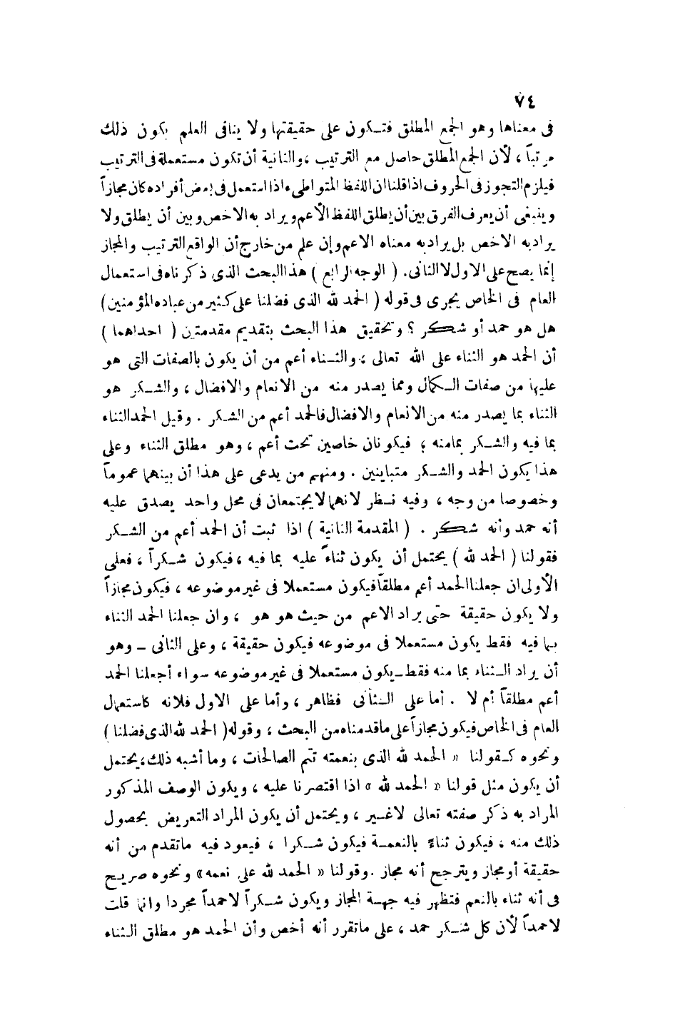 (الْوَجْهُ الرَّابِعُ) هَذَا الْبَحْثُ الَّذِي ذَكَرْنَاهُ فِي اسْتِعْمَالِ الْعَامِّ فِي الْخَاصِّ يَجْرِي فِي قَوْلِهِ {الْحَمْدُ لِلَّهِ الَّذِي فَضَّلَنَا عَلَى كَثِيرٍ مِنْ عِبَادِهِ الْمُؤْمِنِينَ} [النمل: 15] هَلْ هُوَ حَمْدٌ أَوْ شُكْرٌ؟ وَتَحْقِيقُ هَذَا الْبَحْثِ بِتَقْدِيمِ مُقَدِّمَتَيْنِ (أَحَدَاهُمَا) أَنَّ الْحَمْدَ هُوَ الثَّنَاءُ عَلَى اللَّهِ تَعَالَى وَالثَّنَاءُ أَعَمُّ مِنْ أَنْ يَكُونَ بِالصِّفَاتِ الَّتِي هُوَ عَلَيْهَا مِنْ صِفَاتِ الْكَمَالِ وَمِمَّا يَصْدُرُ مِنْهُ مِنْ الْإِنْعَامِ وَالْإِفْضَالِ، وَالشُّكْرُ هُوَ الثَّنَاءُ بِمَا يَصْدُرُ مِنْهُ مِنْ الْإِنْعَامِ وَالْإِفْضَالِ فَالْحَمْدُ أَعَمُّ مِنْ الشُّكْرِ. وَقِيلَ الْحَمْدُ الثَّنَاءُ بِمَا فِيهِ وَالشُّكْرُ بِمَا مِنْهُ؛ فَيَكُونَانِ خَاصَّيْنِ تَحْتَ أَعَمِّ، وَهُوَ مُطْلَقُ الثَّنَاءِ وَعَلَى هَذَا يَكُونُ الْحَمْدُ وَالشُّكْرُ مُتَبَايِنَيْنِ.