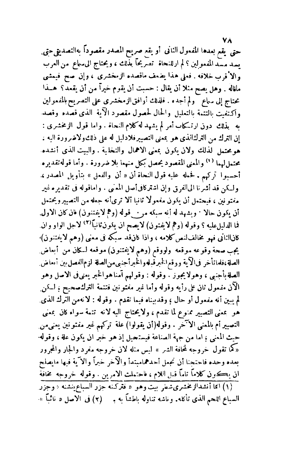وَأَمَّا قَوْلُ الزَّمَخْشَرِيِّ: إنَّ التَّرْكَ مِنْ التَّرْكِ الَّذِي هُوَ بِمَعْنَى التَّصْيِيرِ فَلَا دَلِيلَ لَهُ عَلَى ذَلِكَ وَلَا ضَرُورَةَ إلَيْهِ، هُوَ مُحْتَمِلٌ لِذَلِكَ وَلَأَنْ يَكُونَ بِمَعْنَى الْإِهْمَالِ وَالتَّخْلِيَةِ. وَالْبَيْتُ الَّذِي أَنْشَدَهُ مُحْتَمِلٌ لَهُمَا وَالْمَعْنَى الْمَقْصُودُ يَحْصُلُ بِكُلٍّ مِنْهُمَا بِلَا ضَرُورَةٍ. وَأَمَّا قَوْلُهُ تَقْدِيرُهُ أَحَسِبُوا تَرَكَهُمْ. فَحَمَلَهُ عَلَيْهِ قَوْلُ النُّحَاةِ أَنَّ " أَنْ وَالْفِعْلَ " بِتَأْوِيلِ الْمَصْدَرِ، وَلَكِنْ قَدْ أَشَرْنَا إلَى الْفَرْقِ وَإِنْ اشْتَرَكَا فِي أَصْلِ الْمَعْنَى.