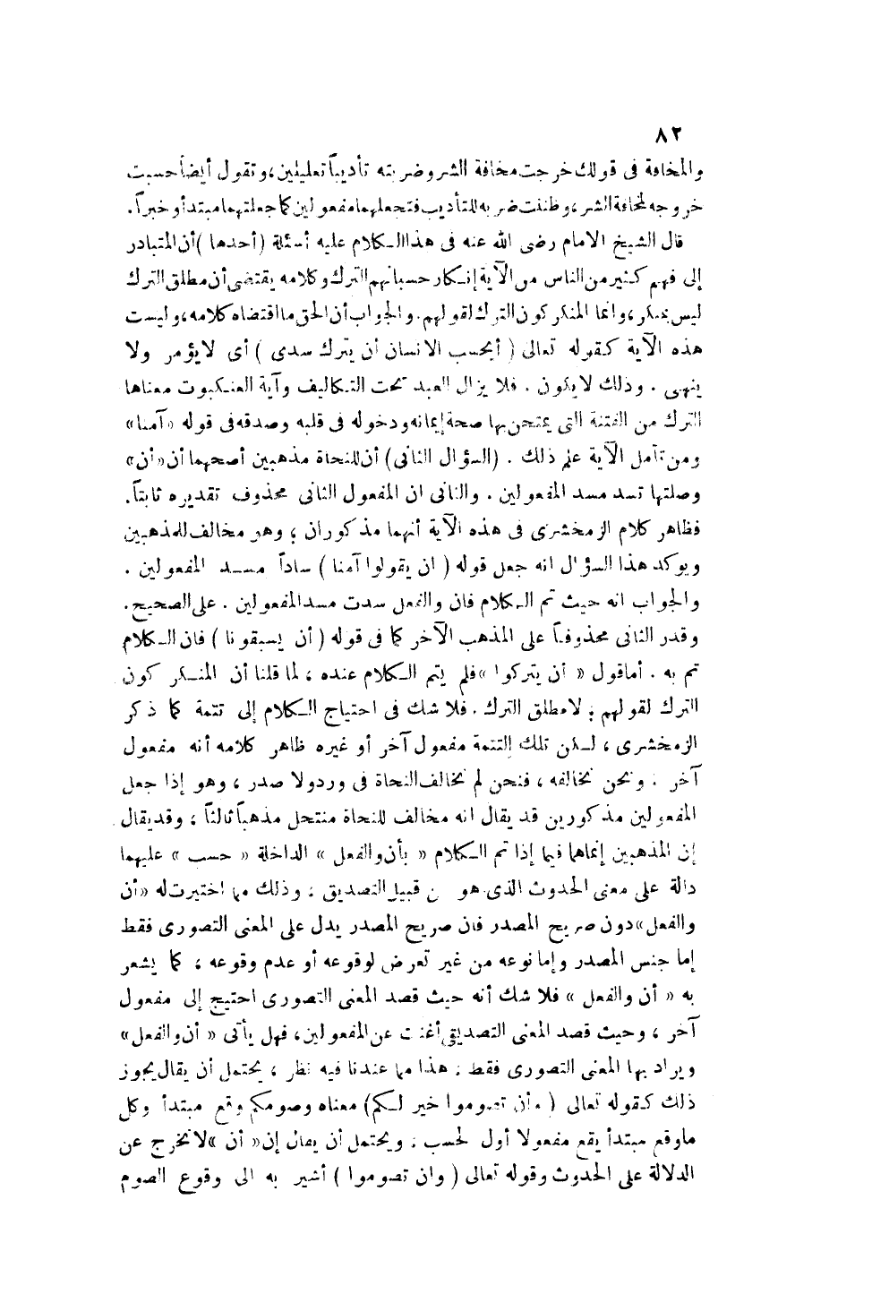 وَنَحْنُ نُخَالِفُهُ، فَنَحْنُ لَمْ نُخَالِفْ النُّحَاةَ فِي وِرْدٍ وَلَا صَدْرٍ، وَهُوَ إذَا جَعَلَ الْمَفْعُولَيْنِ مَذْكُورَيْنِ قَدْ يُقَالُ إنَّهُ مُخَالِفٌ لِلنُّحَاةِ مُنْتَحِلٌ مَذْهَبًا ثَالِثًا، وَقَدْ يُقَالُ إنَّ الْمَذْهَبَيْنِ إنَّمَا هُمَا فِيمَا إذَا تَمَّ الْكَلَامُ " بِأَنْ وَالْفِعْلِ " الدَّاخِلَةِ " حَسِبَ " عَلَيْهِمَا دَالَّةٌ عَلَى مَعْنَى الْحُدُوثِ الَّذِي هُوَ مِنْ قَبِيلِ التَّصْدِيقِ، وَذَلِكَ مِمَّا اُخْتِيرَتْ لَهُ " أَنْ وَالْفِعْلُ " دُونَ صَرِيحِ الْمَصْدَرِ فَإِنَّ صَرِيحَ الْمَصْدَرِ يَدُلُّ عَلَى الْمَعْنَى التَّصَوُّرِيِّ فَقَطْ إمَّا جِنْسُ الْمَصْدَرِ وَإِمَّا نَوْعُهُ مِنْ غَيْرِ تَعَرُّضٍ لِوُقُوعِهِ أَوْ عَدَمِ وُقُوعِهِ، كَمَا يُشْعِرُ بِهِ " أَنْ وَالْفِعْلُ " فَلَا شَكَّ أَنَّهُ حَيْثُ قَصَدَ الْمَعْنَى التَّصَوُّرِيَّ اُحْتِيجَ إلَى مَفْعُولٍ آخَرَ، وَحَيْثُ قَصَدَ الْمَعْنَى التَّصْدِيقِيَّ أَغْنَتْ عَنْ الْمَفْعُولَيْنِ، فَهَلْ يَأْتِي " أَنْ وَالْفِعْلُ " وَيُرَادُ بِهَا الْمَعْنَى التَّصَوُّرِيُّ فَقَطْ: هَذَا مِمَّا عِنْدَنَا فِيهِ نَظَرٌ، يُحْتَمَلُ أَنْ يُقَالُ يَجُوزُ ذَلِكَ كَقَوْلِهِ تَعَالَى {وَأَنْ تَصُومُوا خَيْرٌ لَكُمْ} [البقرة: 184] مَعْنَاهُ وَصَوْمُكُمْ وَقَعَ مُبْتَدَأً وَكُلُّ مَا وَقَعَ مُبْتَدَأً يَقَعُ مَفْعُولًا أَوَّلَ لِحَسِبَ.