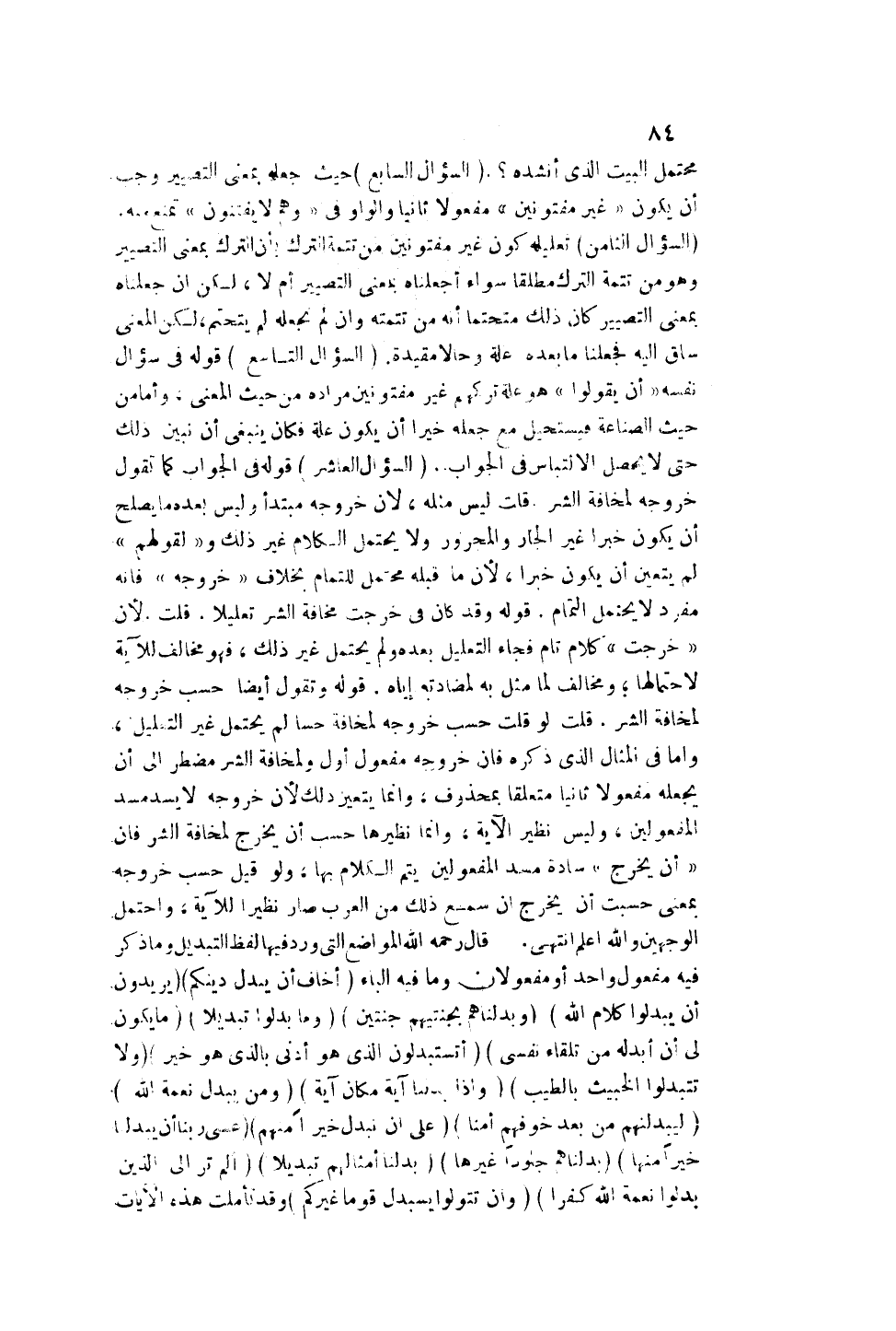 (السُّؤَالُ الثَّامِنُ) تَعْلِيلُهُ كَوْنَ غَيْرَ مَفْتُونِينَ مِنْ تَتِمَّةِ التَّرْكِ بِأَنَّ التَّرْكَ بِمَعْنَى التَّصْيِيرِ وَهُوَ مِنْ تَتِمَّةِ التَّرْكِ مُطْلَقًا سَوَاءٌ أَجَعَلْنَاهُ بِمَعْنَى التَّصْيِيرِ أَمْ لَا، لَكِنْ إنْ جَعَلْنَاهُ بِمَعْنَى التَّصْيِيرِ كَانَ ذَلِكَ مُتَحَتِّمًا أَنَّهُ مِنْ تَتِمَّتِهِ وَإِنْ لَمْ نَجْعَلْهُ لَمْ يَتَحَتَّمْ، لَكِنَّ الْمَعْنَى سَاقَ إلَيْهِ فَجَعَلْنَا مَا بَعْدَهُ عِلَّةً وَحَالًا مُقَيَّدَةً. (السُّؤَالُ التَّاسِعُ) قَوْلُهُ فِي سُؤَالِ نَفْسِهِ " أَنْ يَقُولُوا " هُوَ عِلَّةُ تَرْكِهِمْ غَيْرَ مَفْتُونِينَ مُرَادُهُ مِنْ حَيْثُ الْمَعْنَى، وَأَمَّا مِنْ حَيْثُ الصِّنَاعَةُ فَيَسْتَحِيلُ مَعَ جَعْلِهِ خَبَرًا أَنْ يَكُونَ عِلَّةً فَكَانَ يَنْبَغِي أَنْ نُبَيِّنَ ذَلِكَ حَتَّى لَا يَحْصُلُ الِالْتِبَاسُ فِي الْجَوَابِ. (السُّؤَالُ الْعَاشِرُ) قَوْلُهُ فِي الْجَوَابِ كَمَا تَقُولُ خُرُوجُهُ لِمَخَافَةِ الشَّرِّ. قُلْت لَيْسَ مِثْلَهُ، لِأَنَّ خُرُوجَهُ مُبْتَدَأٌ وَلَيْسَ بَعْدَهُ مَا يَصْلُحُ أَنْ يَكُونَ خَبَرًا غَيْرَ الْجَارِّ وَالْمَجْرُورِ وَلَا يَحْتَمِلُ الْكَلَامُ غَيْرَ ذَلِكَ وَ " لِقَوْلِهِمْ " لَمْ يَتَعَيَّنْ أَنْ يَكُونَ خَبَرًا، لِأَنَّ مَا قَبْلَهُ مُحْتَمِلٌ لِلتَّمَامِ بِخِلَافِ " خُرُوجِهِ " فَإِنَّهُ مُفْرَدٌ لَا يَحْتَمِلُ التَّمَامَ. قَوْلُهُ وَقَدْ كَانَ فِي خَرَجْت مَخَافَةَ الشَّرِّ تَعْلِيلًا. قُلْت: لِأَنَّ " خَرَجْت " كَلَامٌ تَامٌّ فَجَاءَ التَّعْلِيلُ بَعْدَهُ وَلَمْ يَحْتَمِلْ غَيْرَ ذَلِكَ، فَهُوَ مُخَالِفٌ لِلْآيَةِ لِاحْتِمَالِهَا؛ وَمُخَالِفٌ لِمَا مَثَّلَ بِهِ لِمُضَادَّتِهِ إيَّاهُ. قَوْلُهُ وَتَقُولُ أَيْضًا حَسِبَ خُرُوجَهُ لِمَخَافَةِ الشَّرِّ. قُلْت لَوْ قُلْت حَسِبَ خُرُوجَهُ لِمَخَافَةِ الشَّرِّ حِسًّا لَمْ يَحْتَمِلْ غَيْرَ التَّعْلِيلِ، وَأَمَّا فِي الْمِثَالِ الَّذِي ذَكَرَهُ فَإِنَّ خُرُوجَهُ مَفْعُولٌ أَوَّلٌ وَلِمَخَافَةِ الشَّرِّ مُضْطَرٌّ إلَى أَنْ يَجْعَلَهُ مَفْعُولًا ثَانِيًا مُتَعَلِّقًا بِمَحْذُوفٍ، وَإِنَّمَا يَتَعَيَّنُ ذَلِكَ لِأَنَّ خُرُوجَهُ لَا يَسُدُّ مَسَدَّ الْمَفْعُولَيْنِ، وَلَيْسَ نَظِيرَ الْآيَةِ، وَإِنَّمَا نَظِيرُهَا حَسِبَ أَنْ يَخْرُجَ لِمَخَافَةِ الشَّرِّ فَإِنَّ " أَنْ يَخْرُجَ " سَادَّةٌ مَسَدَّ الْمَفْعُولَيْنِ يَتِمُّ الْكَلَامُ بِهَا، وَلَوْ قِيلَ حَسِبَ خُرُوجَهُ بِمَعْنَى حَسِبْت أَنْ يَخْرُجَ إنْ سُمِعَ ذَلِكَ مِنْ الْعَرَبِ صَارَ نَظِيرًا لِلْآيَةِ، وَاحْتَمَلَ الْوَجْهَيْنِ وَاَللَّهُ أَعْلَمُ انْتَهَى.