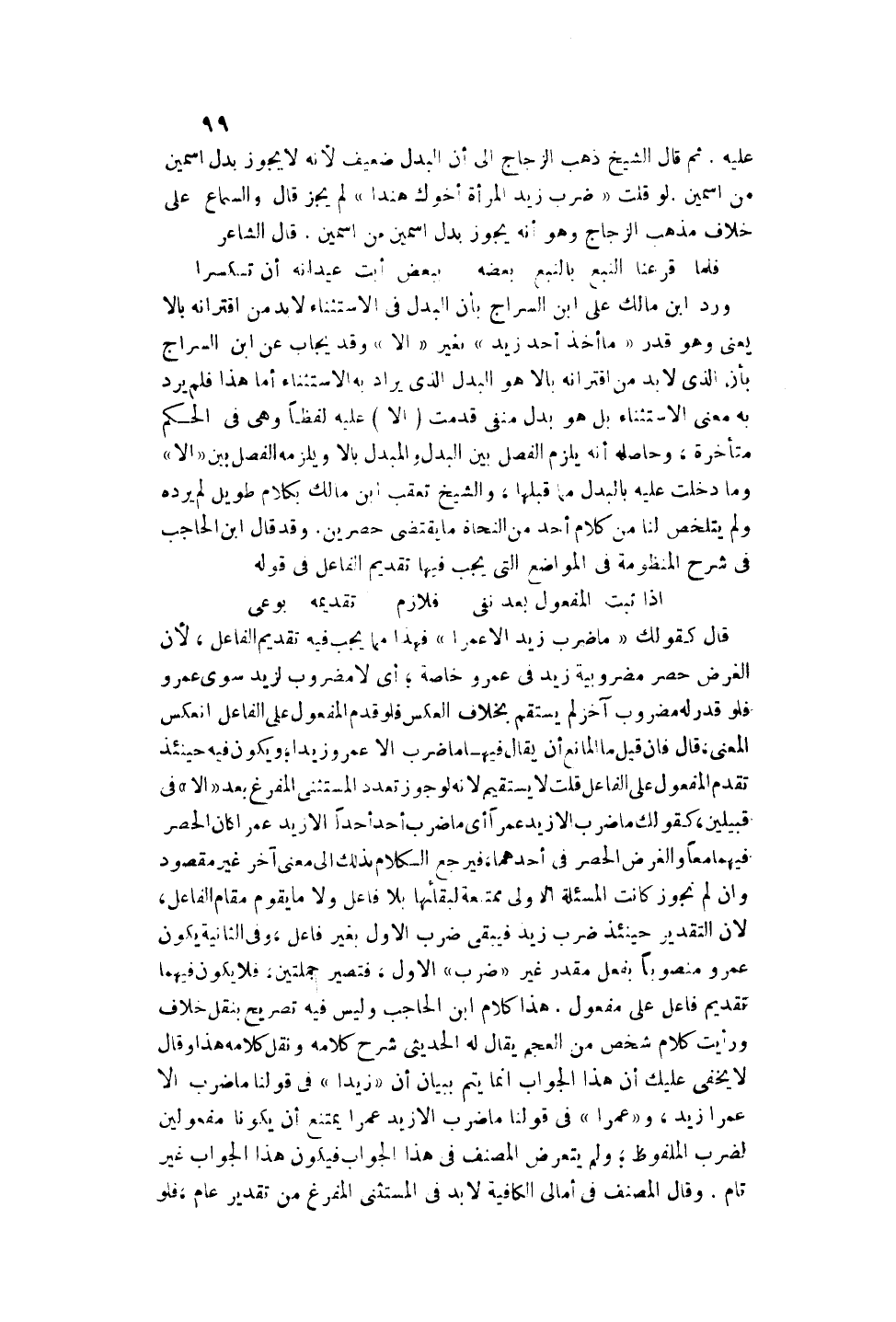 هَذَا كَلَامُ ابْنِ الْحَاجِبِ وَلَيْسَ فِيهِ تَصْرِيحٌ بِنَقْلِ خِلَافٍ وَرَأَيْت كَلَامَ شَخْصٍ مِنْ الْعَجَمِ يُقَالُ لَهُ الْحَدِيثِي شَرَحَ كَلَامَهُ وَنَقَلَ كَلَامَهُ هَذَا وَقَالَ لَا يَخْفَى عَلَيْك أَنَّ هَذَا الْجَوَابَ إنَّمَا يَتِمُّ بِبَيَانِ أَنَّ " زَيْدًا " فِي قَوْلِنَا مَا ضَرَبَ إلَّا عَمْرًا زَيْدٌ، وَ " عَمْرًا " فِي قَوْلِنَا مَا ضَرَبَ إلَّا زَيْدٌ عَمْرًا يَمْتَنِعُ أَنْ يَكُونَا مَفْعُولَيْنِ لِضَرَبَ الْمَلْفُوظِ؛ وَلَمْ يَتَعَرَّضْ الْمُصَنِّفُ فِي هَذَا الْجَوَابِ فَيَكُونُ هَذَا الْجَوَابُ غَيْرَ تَامٍّ.