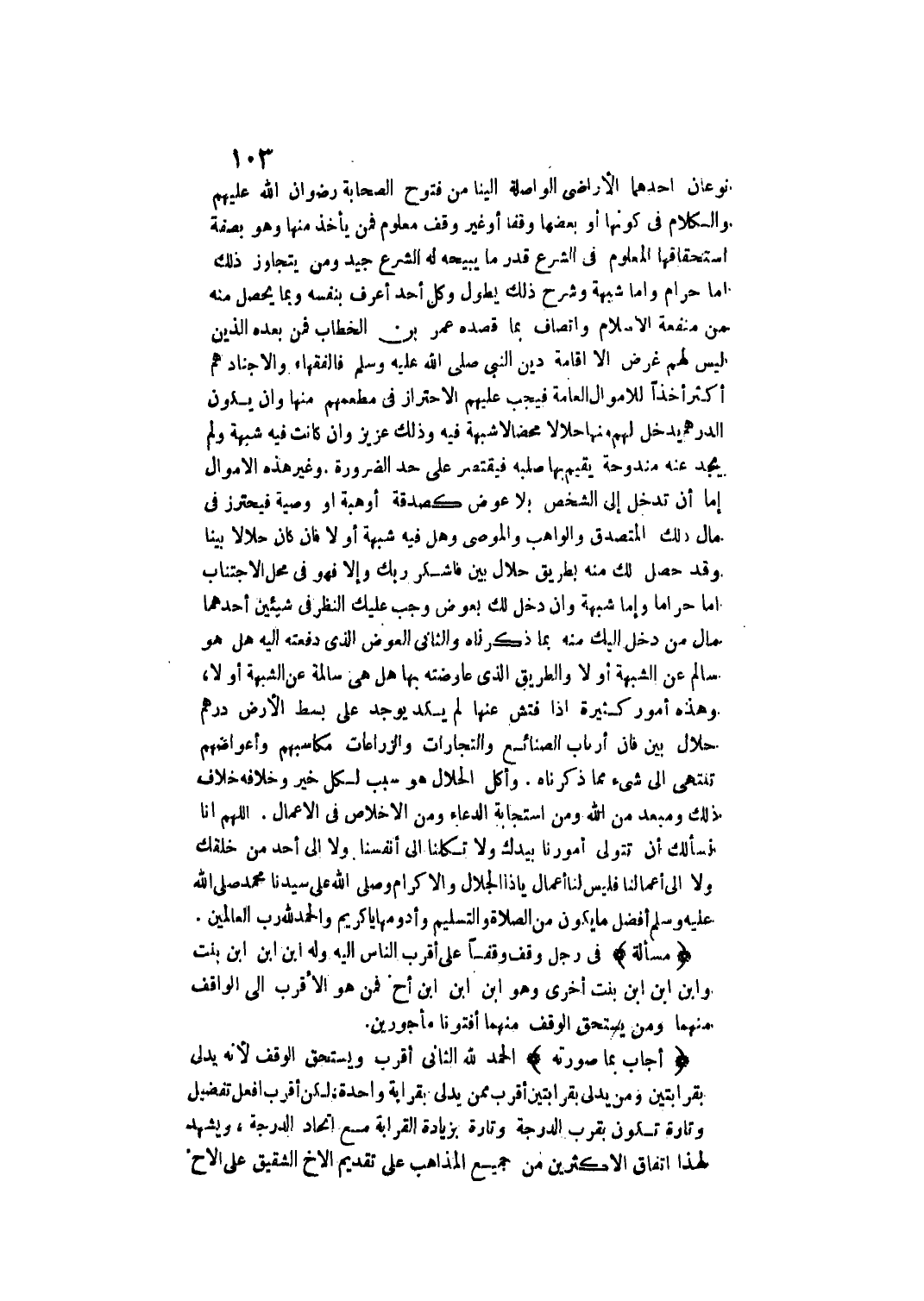 نَوْعَانِ أَحَدُهُمَا الْأَرَاضِي الْوَاصِلَةُ إلَيْنَا مِنْ فُتُوحِ الصَّحَابَةِ - رِضْوَانُ اللَّهِ عَلَيْهِمْ - وَالْكَلَامُ فِي كَوْنِهَا، أَوْ بَعْضِهَا وَقْفًا، أَوْ غَيْرَ وَقْفٍ مَعْلُومٌ فَمَنْ يَأْخُذُ مِنْهَا، وَهُوَ بِصِفَةِ اسْتِحْقَاقِهَا الْمَعْلُومِ فِي الشَّرْعِ قَدْرَ مَا يُبِيحُهُ لَهُ الشَّرْعُ جَيِّدٌ وَمَنْ يَتَجَاوَزُ ذَلِكَ إمَّا حَرَامٌ وَإِمَّا شُبْهَةٌ وَشَرْحُ ذَلِكَ يَطُولُ وَكُلُّ أَحَدٍ أَعْرَفُ بِنَفْسِهِ وَبِمَا يَحْصُلُ مِنْهُ مِنْ مَنْفَعَةِ الْإِسْلَامِ وَاتِّصَافٍ بِمَا قَصَدَهُ عُمَرُ بْنُ الْخَطَّابِ فَمَنْ بَعْدِهِ الَّذِينَ لَيْسَ لَهُمْ غَرَضٌ إلَّا إقَامَةُ دِينِ النَّبِيِّ - صَلَّى اللَّهُ عَلَيْهِ وَسَلَّمَ - فَالْفُقَهَاءُ وَالْأَجْنَادُ هُمْ أَكْثَرُ أَخْذًا لِلْأَمْوَالِ الْعَامَّةِ فَيَجِبُ عَلَيْهِمْ الِاحْتِرَازُ فِي مَطْعَمِهِمْ مِنْهَا وَأَنْ يَكُونَ الدِّرْهَمُ يَدْخُلُ لَهُمْ مِنْهَا حَلَالًا مَحْضًا لَا شُبْهَةَ فِيهِ وَذَلِكَ عَزِيزٌ، وَإِنْ كَانَتْ فِيهِ شُبْهَةٌ، وَلَمْ يَجِدْ عَنْهُ مَنْدُوحَةً يُقِيمُ بِهَا صُلْبَهُ فَيَقْتَصِرُ عَلَى حَدِّ الضَّرُورَةِ، وَغَيْرُ هَذِهِ الْأَمْوَالِ إمَّا أَنْ تَدْخُلَ إلَى الشَّخْصِ بِلَا عِوَضٍ كَصَدَقَةٍ، أَوْ هِبَةٍ، أَوْ وَصِيَّةٍ فَيُحْتَرَزُ فِي مَالِ ذَلِكَ الْمُتَصَدِّقِ وَالْوَاهِبِ وَالْمُوصِي وَهَلْ فِيهِ شُبْهَةٌ، أَوْ لَا، فَإِنْ كَانَ حَلَالًا بَيِّنًا وَقَدْ حَصَلَ لَك مِنْهُ بِطَرِيقٍ حَلَالٍ بَيِّنٍ فَاشْكُرْ رَبَّكَ وَإِلَّا، فَهُوَ فِي مَحَلِّ الِاجْتِنَابِ إمَّا حَرَامٌ وَإِمَّا شُبْهَةٌ، وَإِنْ دَخَلَ لَك بِعِوَضٍ وَجَبَ عَلَيْك النَّظَرُ فِي شَيْئَيْنِ أَحَدُهُمَا مَالُ مَنْ دَخَلَ إلَيْك مِنْهُ بِمَا ذَكَرْنَاهُ وَالثَّانِي الْعِوَضُ الَّذِي دَفَعْتَهُ إلَيْهِ هَلْ هُوَ سَالِمٌ عَنْ الشُّبْهَةِ، أَوْ لَا وَالطَّرِيقُ الَّذِي عَاوَضْتَهُ بِهَا هَلْ هِيَ سَالِمَةٌ عَنْ الشُّبْهَةِ، أَوْ لَا، وَهَذِهِ أُمُورٌ كَثِيرَةٌ إذَا فَتَّشَ عَنْهَا لَمْ يَكَدْ يُوجَدُ عَلَى بُسُطِ الْأَرْضِ دِرْهَمٌ حَلَالٌ بَيِّنٌ فَإِنَّ أَرْبَابَ الصَّنَائِعِ وَالتِّجَارَاتِ وَالزِّرَاعَاتِ مَكَاسِبُهُمْ وَأَعْوَاضُهُمْ تَنْتَهِي إلَى شَيْءٍ مِمَّا ذَكَرْنَاهُ. وَأَكْلُ الْحَلَالِ هُوَ سَبَبٌ لِكُلِّ خَيْرٍ وَخِلَافُهُ خِلَافُ ذَلِكَ وَمُبْعَدٌ مِنْ اللَّهِ وَمِنْ اسْتِجَابَةِ الدُّعَاءِ وَمِنْ الْإِخْلَاصِ فِي الْأَعْمَالِ.