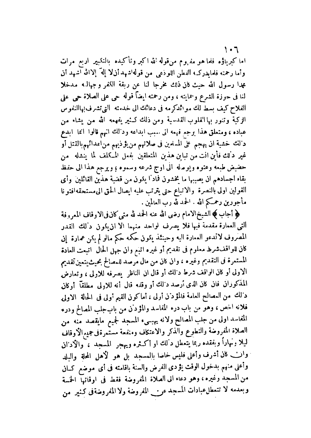 {أَجَابَ} الشَّيْخُ الْإِمَامُ - رَضِيَ اللَّهُ عَنْهُ -: الْحَمْدُ لِلَّهِ مَتَى كَانَ فِي الْأَوْقَافِ الْمَعْرُوفَةِ الَّتِي الْعِمَارَةُ مُقَدَّمَةٌ فِيهَا فَلَا يُصْرَفُ لِوَاحِدٍ مِنْهُمَا إلَّا أَنْ يَكُونَ ذَلِكَ الْقَدْرُ الْمَصْرُوفُ لَا تَدْعُو الْعِمَارَةُ إلَيْهِ وَحِينَئِذٍ يَكُونُ حُكْمُهُ حُكْمَ مَا لَوْ لَمْ يَكُنْ عِمَارَةً إنْ كَانَ لِلْوَاقِفِ شَرْطٌ مَعْلُومٌ فِي تَقْدِيمٍ، أَوْ غَيْرِهِ اتَّبَعَ، وَإِنْ جُهِلَ الْحَالُ اتَّبَعْتَ الْعَادَةَ الْمُسْتَمِرَّةَ فِي التَّقْدِيمِ وَغَيْرِهِ.