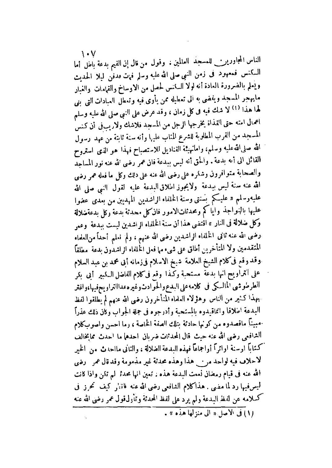«وَقَدْ عُرِضَ عَلَى النَّبِيِّ - صَلَّى اللَّهُ عَلَيْهِ وَسَلَّمَ - أَعْمَالُ أُمَّتِهِ حَتَّى الْقَذَاةِ يُخْرِجُهَا الرَّجُلُ مِنْ الْمَسْجِدِ» فَلَا شَكَّ، وَلَا رَيْبَ فِي أَنَّ كَنْسَ الْمَسْجِدِ مِنْ الْقُرَبِ الْمَطْلُوبَةِ لِلشَّرْعِ الْمُثَابِ عَلَيْهَا وَأَنَّهُ سُنَّةٌ ثَابِتَةٌ مِنْ عَهْدِ رَسُولِ اللَّهِ - صَلَّى اللَّهُ عَلَيْهِ وَسَلَّمَ -، وَأَمَّا تَهْيِئَةُ الْقَنَادِيلِ لِلِاسْتِصْبَاحِ فَهَذَا هُوَ الَّذِي اسْتَرْوَحَ الْقَائِلَ إلَى أَنَّهُ بِدْعَةٌ، وَالْحَقُّ أَنَّهُ لَيْسَ بِبِدْعَةٍ فَإِنَّ عُمَرَ - رَضِيَ اللَّهُ عَنْهُ - نَوَّرَ الْمَسَاجِدَ وَالصَّحَابَةُ مُتَوَافِرُونَ وَشَكَرَهُ عَلِيٌّ - رَضِيَ اللَّهُ عَنْهُ - عَلَى ذَلِكَ وَكُلُّ مَا فَعَلَهُ عُمَرُ - رَضِيَ اللَّهُ عَنْهُ - سُنَّةٌ لَيْسَ بِبِدْعَةٍ، وَلَا يَجُوزُ إطْلَاقُ الْبِدْعَةِ عَلَيْهِ لِقَوْلِ النَّبِيِّ - صَلَّى اللَّهُ عَلَيْهِ وَسَلَّمَ - «عَلَيْكُمْ بِسُنَّتِي وَسُنَّةِ الْخُلَفَاءِ الرَّاشِدِينَ الْمَهْدِيِّينَ مِنْ بَعْدِي عَضُّوا عَلَيْهَا بِالنَّوَاجِذِ وَإِيَّاكُمْ وَمُحْدَثَاتِ الْأُمُورِ، فَإِنَّ كُلَّ مُحْدَثَةٍ بِدْعَةٌ وَكُلَّ بِدْعَةٍ ضَلَالَةٌ وَكُلَّ ضَلَالَةٍ فِي النَّارِ» .