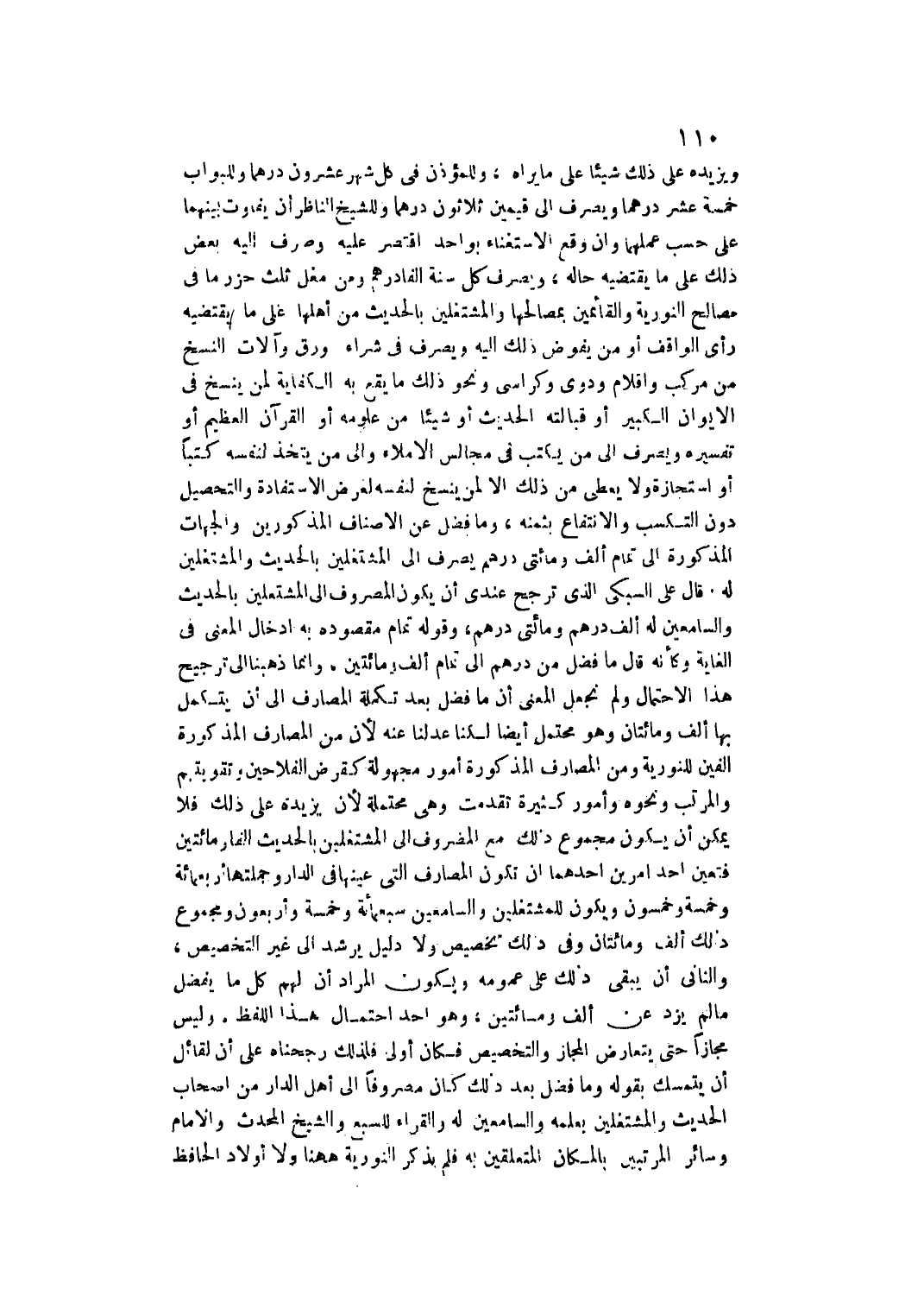 قَالَ عَلِيٌّ السُّبْكِيُّ الَّذِي تَرَجَّحَ عِنْدِي أَنْ يَكُونَ الْمَصْرُوفُ إلَى الْمُشْتَغِلِينَ بِالْحَدِيثِ وَالسَّامِعِينَ لَهُ أَلْفَ دِرْهَمٍ وَمِائَتَيْ دِرْهَمٍ، وَقَوْلُهُ تَمَامٌ مَقْصُودُهُ بِهِ إدْخَالُ الْمَعْنَى فِي الْغَايَةِ وَكَأَنَّهُ قَالَ مَا فَضَلَ مِنْ دِرْهَمٍ إلَى تَمَامِ أَلْفٍ وَمِائَتَيْنِ، وَإِنَّمَا ذَهَبْنَا إلَى تَرْجِيحِ هَذَا الِاحْتِمَالِ، وَلَمْ نَجْعَلْ الْمَعْنَى أَنَّ مَا فَضُلَ بَعْدَ تَكْمِلَةِ الْمَصَارِفِ إلَى أَنْ يَتَكَمَّلَ بِهَا أَلْفٌ وَمِائَتَانِ، وَهُوَ مُحْتَمَلٌ أَيْضًا لَكِنَّا عَدَلْنَا عَنْهُ؛ لِأَنَّ مِنْ الْمَصَارِفِ الْمَذْكُورَةِ أَلْفَيْنِ لِلنُّورِيَّةِ، وَمِنْ الْمَصَارِفِ الْمَذْكُورَةِ أُمُورٌ مَجْهُولَةٌ كَقَرْضِ الْفَلَّاحِينَ وَتَقْوِيَتِهِمْ وَالْمُرَتَّبِ وَنَحْوِهِ وَأُمُورٍ كَثِيرَةٍ تَقَدَّمَتْ وَهِيَ مُحْتَمَلَةٌ؛ لَأَنْ يَزِيدَهُ عَلَى ذَلِكَ فَلَا يُمْكِنُ أَنْ يَكُونَ مَجْمُوعَ ذَلِكَ مَعَ الْمَصْرُوفِ إلَى الْمُشْتَغِلِينَ بِالْحَدِيثِ أَلْفًا وَمِائَتَيْنِ فَتَعَيَّنَ أَحَدُ أَمْرَيْنِ أَحَدُهُمَا أَنْ يَكُونَ الْمَصَارِفُ الَّتِي عَيَّنَهَا فِي الدَّارِ وَجُمْلَتُهَا أَرْبَعُمِائَةٍ وَخَمْسَةٌ وَخَمْسُونَ، وَيَكُونُ لِلْمُشْتَغِلِينَ وَالسَّامِعِينَ سَبْعُمِائَةِ وَخَمْسَةٌ وَأَرْبَعُونَ وَمَجْمُوعُ ذَلِكَ أَلْفٌ وَمِائَتَانِ، وَفِي ذَلِكَ تَخْصِيصٌ، وَلَا دَلِيلَ يُرْشِدُ إلَى غَيْرِ التَّخْصِيصِ.