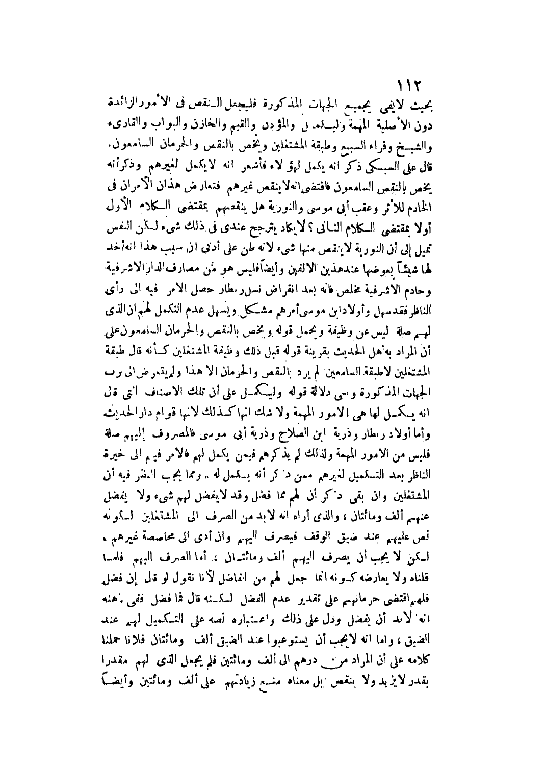فَقَدْ سَهَّلَ وَأَوْلَادُ ابْنِ مُوسَى أَمْرُهُمْ مُشْكِلٌ وَيَسْهُلُ عَدَمُ التَّكَمُّلِ لَهُمْ أَنَّ الَّذِي لَهُمْ صِلَةٌ لَيْسَ عَنْ وَظِيفَةٍ وَيُحْمَلُ قَوْلُهُ وَيُخَصُّ بِالنَّقْصِ وَالْحِرْمَانِ السَّامِعُونَ عَلَى أَنَّ الْمُرَادَ بِهِ أَهْلُ الْحَدِيثِ بِقَرِينَةِ قَوْلِهِ قَبْلَ ذَلِكَ وَظِيفَةُ الْمُشْتَغِلِينَ كَأَنَّهُ قَالَ: طَبَقَةُ الْمُشْتَغِلِينَ لَا طَبَقَةَ السَّامِعِينَ لَمْ يُرِدْ بِالنَّقْصِ وَالْحِرْمَانِ إلَّا هَذَا، وَلَمْ يَتَعَرَّضْ إلَى رَبِّ الْجِهَاتِ الْمَذْكُورَةِ، وَفِي دَلَالَةِ قَوْلِهِ: وَلْيُكْمِلْ عَلَى أَنَّ تِلْكَ الْأَصْنَافِ الَّتِي قَالَ: إنَّهُ يُكْمِلُ لَهَا هِيَ الْأُمُورُ الْمُهِمَّةُ.