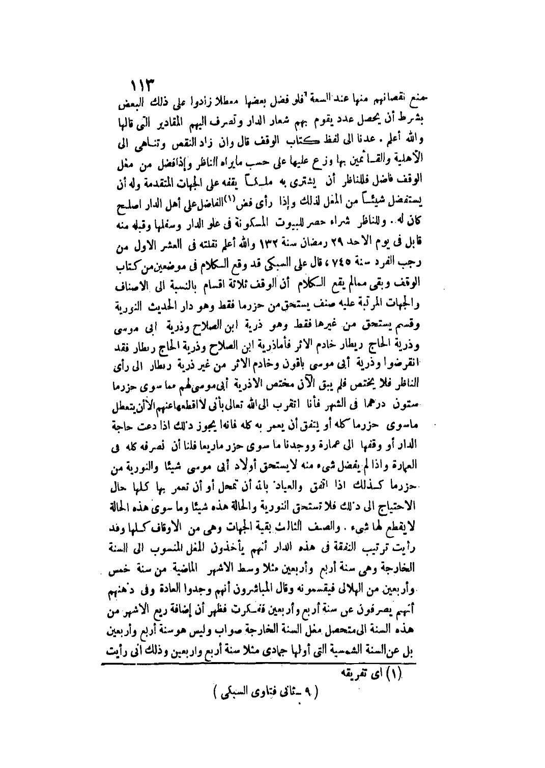 قَالَ عَلِيٌّ السُّبْكِيُّ قَدْ وَقَعَ الْكَلَامُ فِي مَوْضِعَيْنِ مِنْ كِتَابِ الْوَقْفِ وَبَقِيَ مِمَّا لَمْ يَقَعْ الْكَلَامُ أَنَّ الْوَقْفَ ثَلَاثَةُ أَقْسَامٍ بِالنِّسْبَةِ إلَى الْأَصْنَافِ وَالْجِهَاتِ الْمُرَتَّبَةِ عَلَيْهِ صِنْفٌ يَسْتَحِقُّ مِنْ حِرْزٍ مَا فَقَطْ، وَهُوَ دَارُ الْحَدِيثِ النُّورِيَّةُ وَقِسْمٌ يَسْتَحِقُّ مِنْ غَيْرِهَا فَقَطْ، وَهُوَ ذُرِّيَّةُ ابْنِ الصَّلَاحِ وَذُرِّيَّةُ أَبِي مُوسَى وَذُرِّيَّةُ الْحَاجِّ رَيْطَارٍ خَادِمِ الْأَثَرِ فَأَمَّا ذُرِّيَّةُ ابْنِ الصَّلَاحِ وَذُرِّيَّةُ الْحَاجِّ رَيْطَارٍ فَقَدْ انْقَرَضُوا وَذُرِّيَّةُ أَبِي مُوسَى بَاقُونَ وَخَادِمُ الْأَثَرِ مِنْ غَيْرِ ذُرِّيَّةِ رَيْطَارٍ إلَى رَأْيِ النَّاظِرِ فَلَا يَخْتَصُّ فَلَمْ يَبْقَ الْآنَ مُخْتَصٌّ إلَّا ذُرِّيَّةُ أَبِي مُوسَى لَهُمْ مِمَّا سِوَى حَزْرَمٍ سِتُّونَ دِرْهَمًا فِي الشَّهْرِ.