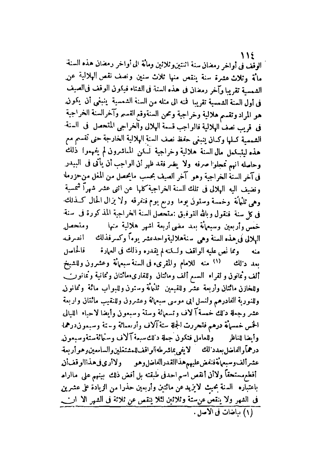 الْوَقْفَ فِي أَوَاخِرِ رَمَضَانَ سَنَةَ اثْنَتَيْنِ وَثَلَاثِينَ وَمِائَةٍ إلَى أَوَاخِرِ رَمَضَانَ هَذِهِ السَّنَةَ مِائَةً وَثَلَاثَ عَشْرَةَ سَنَةً يَنْقُصُ مِنْهَا ثَلَاثَ سِنِينَ وَنِصْفَ نَقْصِ الْهِلَالِيَّةِ عَنْ الشَّمْسِيَّةِ تَقْرِيبًا وَآخِرُ رَمَضَانَ فِي هَذِهِ السَّنَةِ فِي الشِّتَاءِ، فَيَكُونُ الْوَقْفُ فِي الصَّيْفِ فِي أَوَّلِ السَّنَةِ الشَّمْسِيَّةِ تَقْرِيبًا فَمِنْهُ إلَى مِثْلِهِ مِنْ السَّنَةِ الشَّمْسِيَّةِ يَنْبَغِي أَنْ يَكُونَ هُوَ الْمُرَادَ وَتُقْسَمُ هِلَالِيَّةٌ وَخَرَاجِيَّةٌ وَنَحْوُ السَّنَةِ وَقَعَ الْقَسْمُ وَآخِرُ السَّنَةِ الْخَرَاجِيَّةِ فِي قَرِيبِ نِصْفِ الْهِلَالِيَّةِ فَالْوَاجِبُ قِسْمَةُ الْهِلَالِيِّ وَالْخَرَاجِيِّ الْمُتَحَصِّلِ فِي السَّنَةِ الشَّمْسِيَّةِ كُلِّهَا وَكَانَ يَنْبَغِي حِفْظُ نِصْفِ السَّنَةِ الْهِلَالِيَّةِ الْخَارِجَةِ حَتَّى تُقْسَمَ مَعَ هَذِهِ لِيَكْتَمِلَ مَالُ السَّنَةِ هِلَالِيَّةٌ وَخَرَاجِيَّةٌ لَكِنْ الْمُبَاشِرُونَ لَمْ يَفْهَمُوا ذَلِكَ وَحَاصِلُهُ أَنَّهُمْ تَمَحَّلُوا صَرْفَهُ، وَلَا يَضُرُّ فَقَدْ ظَهَرَ أَنَّ الْوَاجِبَ أَنْ يَأْتِيَ فِي الْبَيْدَرِ فِي آخِرِ السَّنَةِ الْخَرَاجِيَّةِ.