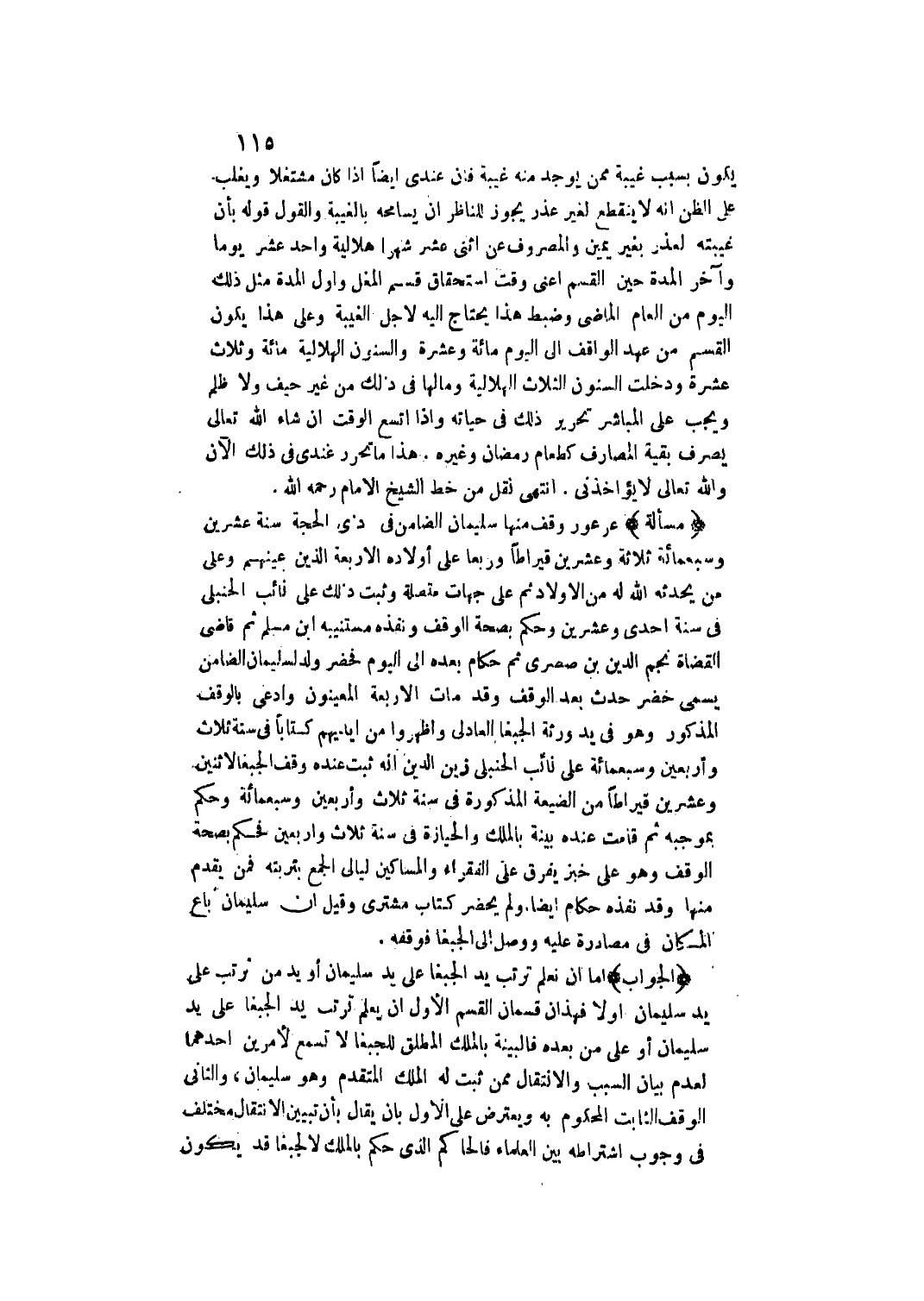 {الْجَوَابُ} أَمَّا أَنْ نَعْلَمَ تَرَتُّبَ يَدَ الْجَبْغَا عَلَى يَدِ سُلَيْمَانَ، أَوْ يَدَ مَنْ تَرَتَّبَ عَلَى يَدِ سُلَيْمَانَ أَوَّلًا فَهَذَانِ قِسْمَانِ الْقِسْمُ الْأَوَّلُ أَنْ يَعْلَمَ تَرَتُّبَ يَدَ الْجَبْغَا عَلَى يَدِ سُلَيْمَانَ، أَوْ عَلَى مَنْ بَعْدَهُ فَالْبَيِّنَةُ بِالْمِلْكِ الْمُطْلَقِ لِلْجَبْغَا لَا تُسْمَعُ لِأَمْرَيْنِ أَحَدُهُمَا لِعَدَمِ بَيَانِ السَّبَبِ وَالِانْتِقَالِ مِمَّنْ ثَبَتَ لَهُ الْمِلْكُ الْمُتَقَدِّمُ، وَهُوَ سُلَيْمَانُ، وَالثَّانِي الْوَقْفُ الثَّابِتُ الْمَحْكُومُ بِهِ وَيُعْتَرَضُ عَلَى الْأَوَّلِ بِأَنْ يُقَالَ بِأَنَّ تَبْيِينَ الِانْتِقَالِ مُخْتَلَفٌ فِي وُجُوبِ اشْتِرَاطِهِ بَيْنَ الْعُلَمَاءِ فَالْحَاكِمُ الَّذِي حَكَمَ بِالْمِلْكِ لَا لِجَبْغَا قَدْ يَكُونُ