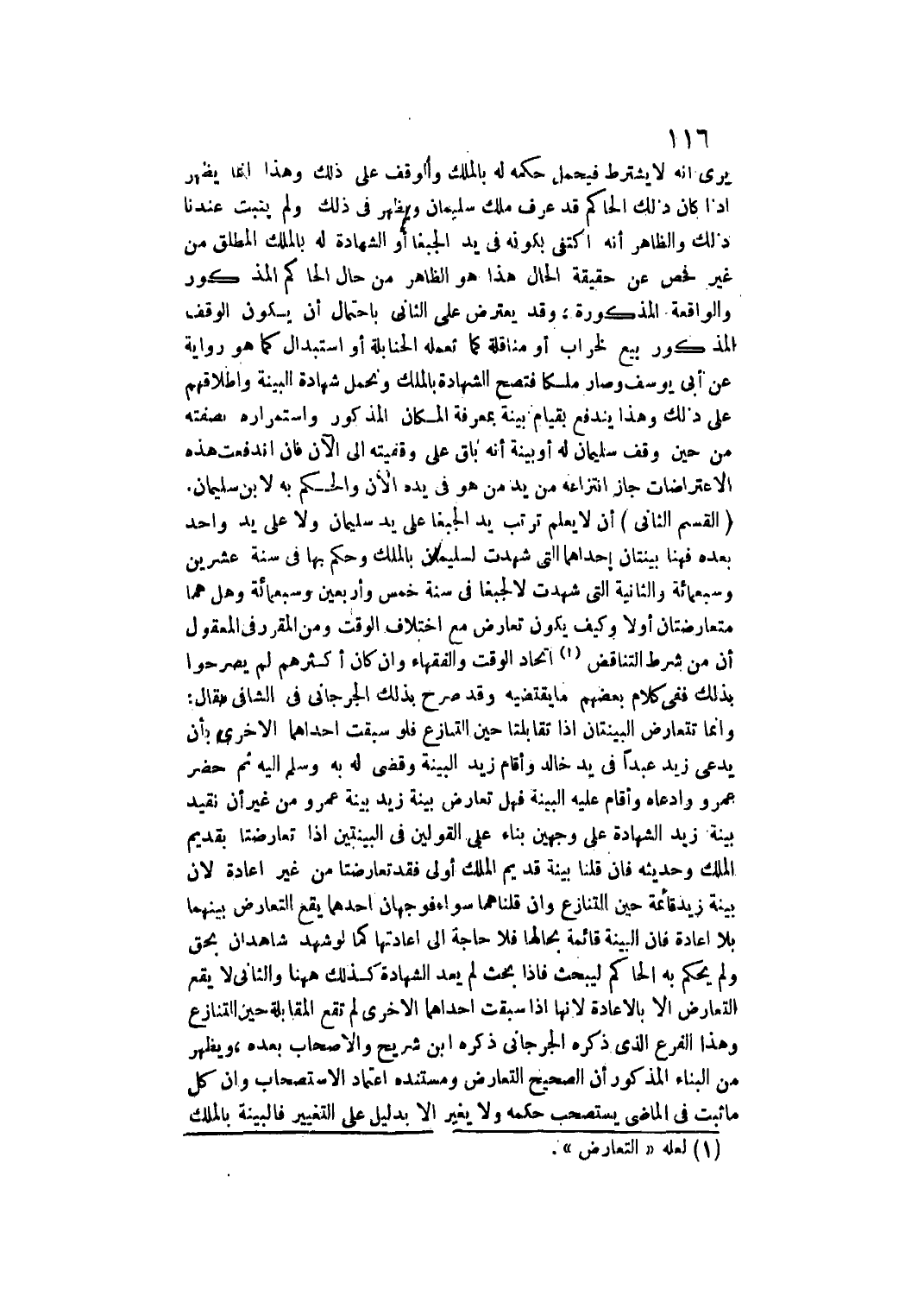 (الْقِسْمُ الثَّانِي) أَنْ لَا يَعْلَمَ تَرَتُّبَ يَدِ الْجَبْغَا عَلَى يَدِ سُلَيْمَانَ، وَلَا عَلَى يَدِ وَاحِدٍ بَعْدَهُ فَهُنَا بَيِّنَتَانِ إحْدَاهُمَا الَّتِي شَهِدَتْ لِسُلَيْمَانَ بِالْمِلْكِ وَحَكَمَ بِهَا فِي سَنَةِ عِشْرِينَ وَسَبْعِمِائَةٍ وَالثَّانِيَةُ الَّتِي شَهِدَتْ لَا لِجَبْغَا فِي سَنَةِ خَمْسٍ وَأَرْبَعِينَ وَسَبْعِمِائَةٍ وَهَلْ هُمَا مُتَعَارِضَتَانِ، أَوْ لَا؟ وَكَيْفَ يَكُونُ تَعَارُضٌ مَعَ اخْتِلَافِ الْوَقْتِ وَمِنْ الْمُقَرَّرِ فِي الْمَعْقُولِ أَنَّ مِنْ شَرْطِ التَّنَاقُضِ اتِّحَادَ الْوَقْتِ.