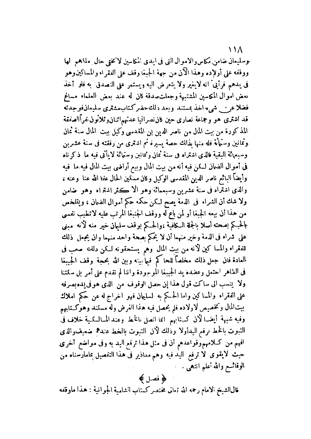 {فَصْلٌ} قَالَ الشَّيْخُ الْإِمَامُ - رَحِمَهُ اللَّهُ تَعَالَى - مُخْتَصِرُ كِتَابِ الشَّامِيَّةِ الْجَوَّانِيَّةِ: هَذَا مَا وَقَفَهُ