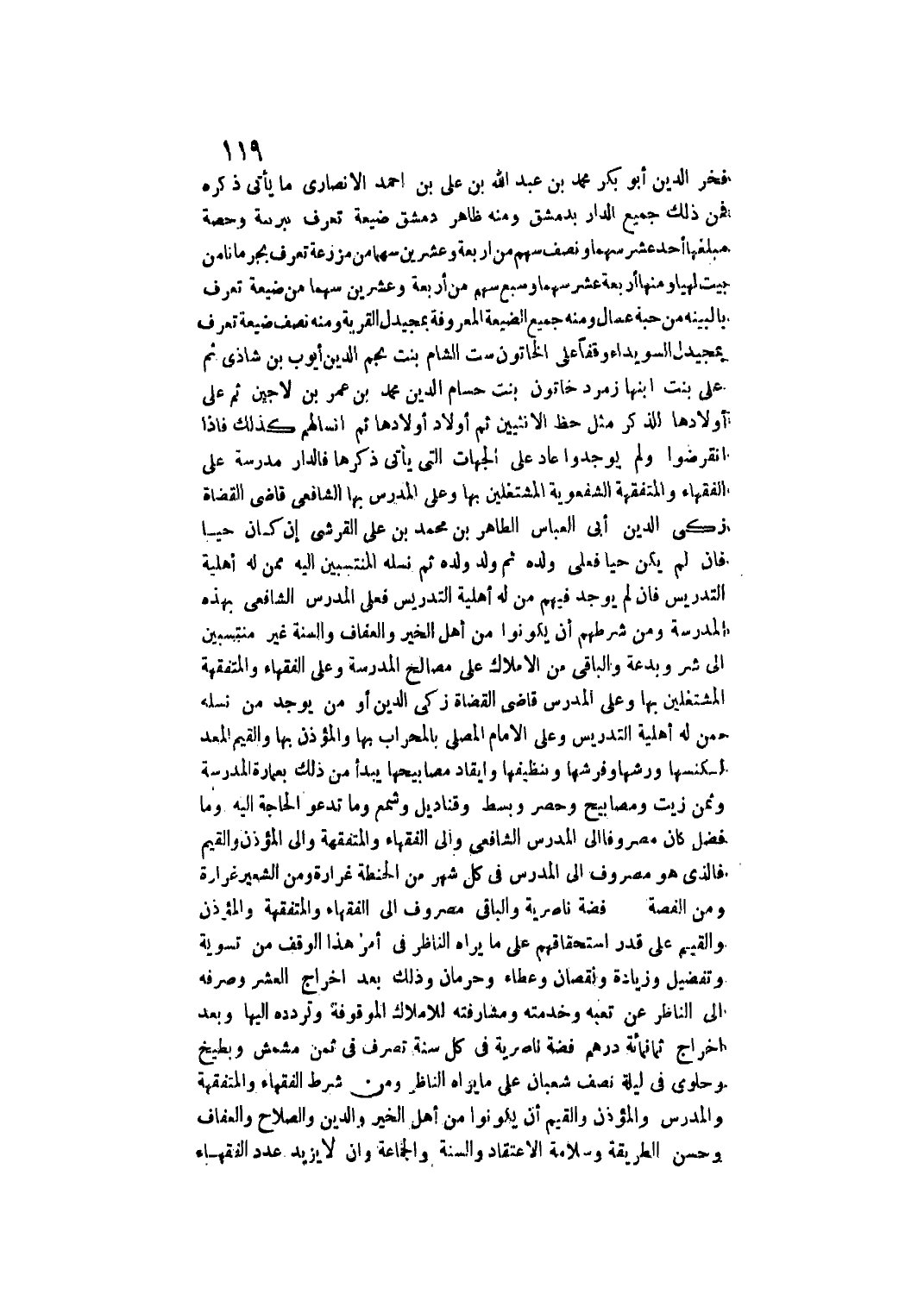 فَخْرُ الدِّينِ أَبُو بَكْرٍ مُحَمَّدُ بْنُ عَبْدِ اللَّهِ بْنِ عَلِيِّ بْنِ أَحْمَدَ الْأَنْصَارِيُّ مَا يَأْتِي ذِكْرُهُ فَمِنْ ذَلِكَ جَمِيعُ الدَّارِ بِدِمَشْقَ وَمِنْهُ ظَاهِرُ دِمَشْقَ ضَيْعَةٌ تُعْرَفُ بِبِرْصَة وَحِصَّةٌ مَبْلَغُهَا أَحَدَ عَشَرَ سَهْمًا وَنِصْفُ سَهْمٍ مِنْ أَرْبَعَةٍ وَعِشْرِينَ سَهْمًا مِنْ مَزْرَعَةٍ تُعْرَفُ بِجَرْمَانَا مِنْ بَيْتِ لَهْيَا وَمِنْهَا أَرْبَعَةَ عَشَرَ سَهْمًا وَسُبْعُ سَهْمٍ مِنْ أَرْبَعَةٍ وَعِشْرِينَ سَهْمًا مِنْ ضَيْعَةٍ تُعْرَفُ بِالْبَيِّنَةِ مِنْ حَبَّةِ عِصَالٍ وَمِنْهُ جَمِيعُ الضَّيْعَةِ الْمَعْرُوفَةِ بِمُجَيْدَلِ الْقَرْيَةِ وَمِنْهُ نِصْفُ ضَيْعَةٍ تُعْرَفُ بِمُجَيْدَلِ السُّوَيْدَاءِ وَقْفًا عَلَى الْخَاتُونِ سِتِّ الشَّامِ بِنْتِ نَجْمِ الدِّينِ أَيُّوبَ بْنِ شَاذِي ثُمَّ عَلَى بِنْتِ ابْنِهَا زُمُرَّدَ خَاتُونَ بِنْتِ حُسَامِ الدِّينِ مُحَمَّدِ بْنِ عُمَرَ بْنِ لَاجِينٍ ثُمَّ عَلَى أَوْلَادِهَا الذَّكَرُ مِثْلُ حَظِّ الْأُنْثَيَيْنِ ثُمَّ أَوْلَادِ أَوْلَادِهَا ثُمَّ أَنْسَالِهِمْ كَذَلِكَ، فَإِذَا انْقَرَضُوا، وَلَمْ يُوجَدُوا عَادَ عَلَى الْجِهَاتِ الَّتِي يَأْتِي ذِكْرُهَا.
