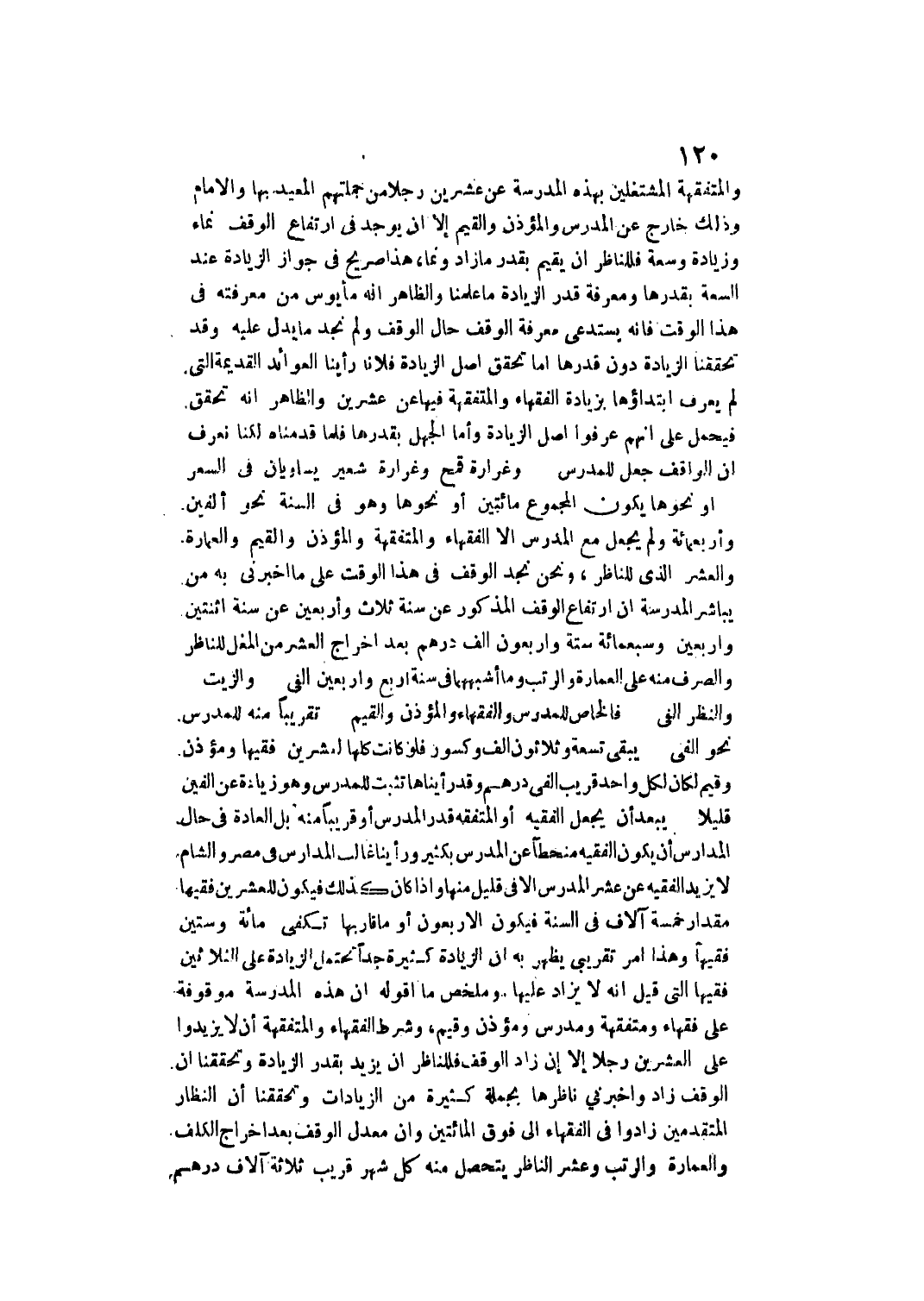 وَالْمُتَفَقِّهَةِ الْمُشْتَغِلِينَ بِهَذِهِ الْمَدْرَسَةِ عَنْ عِشْرِينَ رَجُلًا مِنْ جُمْلَتِهِمْ الْمُعِيدُ بِهَا وَالْإِمَامُ وَذَلِكَ خَارِجٌ عَنْ الْمُدَرِّسِ وَالْمُؤَذِّنِ وَالْقَيِّمِ إلَّا أَنْ يُوجَدَ فِي ارْتِفَاعِ الْوَقْفِ نَمَاءٌ وَزِيَادَةٌ وَسَعَةٌ فَلِلنَّاظِرِ أَنْ يُقَيِّمَ بِقَدْرِ مَا زَادَ وَنَمَا، هَذَا صَرِيحٌ فِي جَوَازِ الزِّيَادَةِ عِنْدَ السَّعَةِ بِقَدْرِهَا وَمَعْرِفَةِ قَدْرِ الزِّيَادَةِ مَا عَلِمْنَا وَالظَّاهِرُ أَنَّهُ مَأْيُوسٌ مِنْ مَعْرِفَتِهِ فِي هَذَا الْوَقْتِ فَإِنَّهُ يَسْتَدْعِي مَعْرِفَةَ الْوَقْفِ حَالَ الْوَقْفِ، وَلَمْ نَجِدْ مَا يَدُلُّ عَلَيْهِ وَقَدْ تَحَقَّقْنَا الزِّيَادَةَ دُونَ قَدْرِهَا أَمَّا تَحَقُّقُ أَصْلِ الزِّيَادَةِ فَلِأَنَّا رَأَيْنَا الْعَوَائِدَ الْقَدِيمَةَ الَّتِي لَمْ يُعْرَفْ ابْتِدَاؤُهَا بِزِيَادَةِ الْفُقَهَاءِ وَالْمُتَفَقِّهَةِ فِيهَا عَنْ عِشْرِينَ وَالظَّاهِرُ أَنَّهُ تَحَقَّقَ فَيُحْمَلُ عَلَى أَنَّهُمْ عَرَفُوا أَصْلَ الزِّيَادَةِ.
