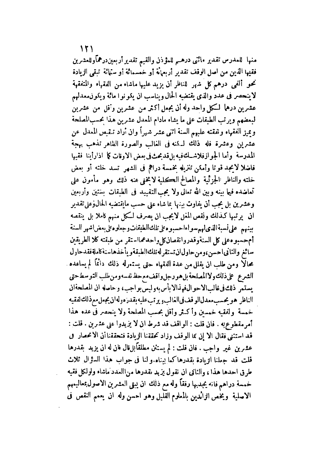 تَقْدِيرُ مِائَتَيْ دِرْهَمٍ لِلْمُؤَذِّنِ وَالْقَيِّمِ تَقْدِيرُ أَرْبَعِينَ دِرْهَمًا وَلِلْعِشْرِينِ فَقِيهًا الَّذِينَ مِنْ أَصْلِ الْوَقْفِ تَقْدِيرُ أَرْبَعِمِائَةٍ، أَوْ خَمْسِمِائَةٍ، أَوْ سِتِّمِائَةٍ تَبْقَى الزِّيَادَةُ نَحْوُ أَلْفَيْ دِرْهَمٍ كُلَّ شَهْرٍ لِلنَّاظِرِ أَنْ يَزِيدَ عَلَيْهَا مَا شَاءَ مِنْ الْفُقَهَاءِ وَالْمُتَفَقِّهَةِ لَا يَنْحَصِرُ فِي عَدَدٍ وَاَلَّذِي يَقْتَضِيهِ الْحَالُ وَيُنَاسِبُ أَنْ يَكُونُوا مِائَةً، وَيَكُونُ مُعَدَّلُهُمْ عِشْرِينَ دِرْهَمًا لِكُلِّ وَاحِدٍ وَلَهُ أَنْ يَجْعَلَ أَكْثَرَ مِنْ عِشْرِينَ وَأَقَلَّ مِنْ عِشْرِينَ لِبَعْضِهِمْ وَيُرَتِّبَ الطَّبَقَاتِ عَلَى مَا يَشَاءُ مَا دَامَ الْمُعَدَّلُ عِشْرِينَ هَذَا بِحَسَبِ الْمَصْلَحَةِ وَيُمَيِّزَ الْفُقَهَاءَ وَنَفَقَتَهُ عَلَيْهِمْ السَّنَةَ اثْنَيْ عَشَرَ شَهْرًا، وَإِنْ أَرَادَ تَنْقِيصَ الْمُعَدَّلِ عَنْ عِشْرِينَ وَعَشَرَةٍ فَلَهُ ذَلِكَ لَكِنَّهُ فِي الْغَالِبِ وَالصُّورَةُ الظَّاهِرَةُ تُذْهِبُ بَهْجَةَ الْمَدْرَسَةِ.