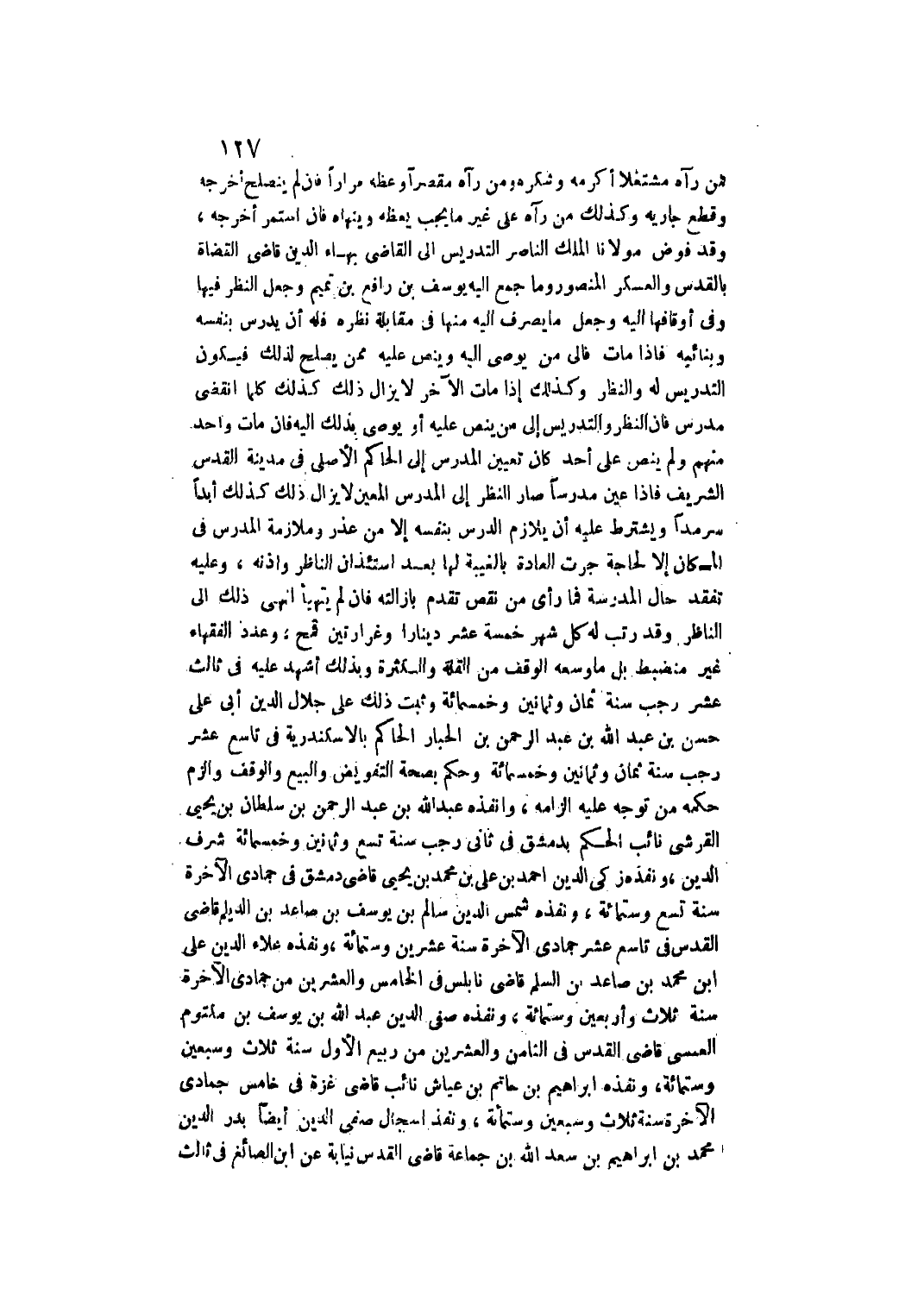 وَقَدْ فَوَّضَ مَوْلَانَا الْمَلِكُ النَّاصِرُ التَّدْرِيسَ إلَى الْقَاضِي بَهَاءِ الدِّينِ قَاضِي الْقُضَاةِ بِالْقُدْسِ وَالْعَسْكَرِ الْمَنْصُورِ، وَمَا جَمَعَ إلَيْهِ يُوسُفُ بْنُ رَافِعِ بْنِ تَمِيمٍ وَجَعَلَ النَّظَرَ فِيهَا، وَفِي أَوْقَافِهَا إلَيْهِ وَجَعَلَ مَا يُصْرَفُ مِنْهَا فِي مُقَابَلَةِ نَظَرِهِ فَلَهُ أَنْ يُدَرِّسَ بِنَفْسِهِ وَبِنَائِبِهِ، فَإِذَا مَاتَ فَإِلَى مَنْ يُوصِي إلَيْهِ وَيَنُصُّ عَلَيْهِ مِمَّنْ يَصْلُحُ لِذَلِكَ، فَيَكُونُ التَّدْرِيسُ لَهُ وَالنَّظَرُ، وَكَذَلِكَ إذَا مَاتَ الْآخَرُ لَا يَزَالُ ذَلِكَ كَذَلِكَ كُلَّمَا انْقَضَى مُدَرِّسٌ فَإِنَّ النَّظَرَ وَالتَّدْرِيسَ إلَى مَنْ يَنُصُّ عَلَيْهِ، أَوْ يُوصَى بِذَلِكَ إلَيْهِ، فَإِنْ مَاتَ وَاحِدٌ مِنْهُمْ، وَلَمْ يَنُصَّ عَلَى أَحَدٍ كَانَ تَعْيِينُ الْمُدَرِّسِ إلَى الْحَاكِمِ الْأَصْلِيِّ فِي مَدِينَةِ الْقُدْسِ الشَّرِيفِ، فَإِذَا عَيَّنَ مُدَرِّسًا صَارَ النَّظَرُ إلَى الْمُدَرِّسِ لِلْعَيْنِ لَا يَزَالَ ذَلِكَ كَذَلِكَ أَبَدًا سَرْمَدًا وَيَشْتَرِطُ عَلَيْهِ أَنْ يُلَازِمَ الدَّرْسَ بِنَفْسِهِ إلَّا مِنْ عُذْرٍ وَمُلَازَمَةُ الْمُدَرِّسِ فِي الْمَكَانِ إلَّا لِحَاجَةٍ جَرَتْ الْعَادَةُ بِالْغَيْبَةِ لَهَا بَعْدَ اسْتِئْذَانِ النَّاظِرِ وَإِذْنِهِ.
