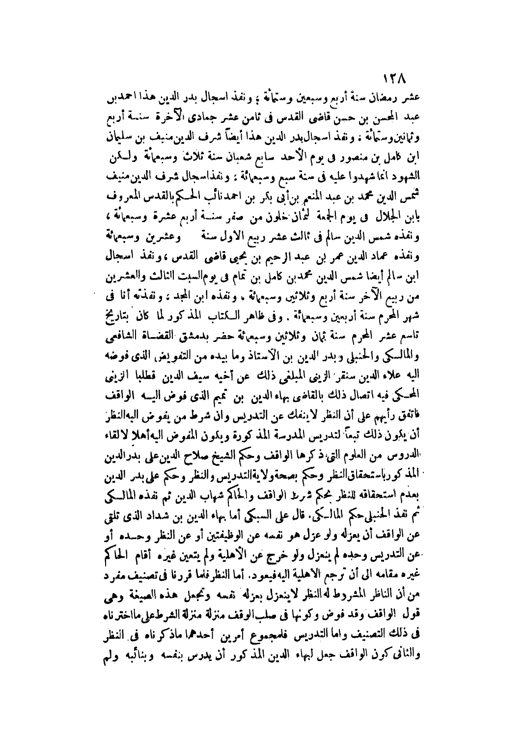 وَفِي ظَاهِرِ الْكِتَابِ الْمَذْكُورِ لِمَا كَانَ بِتَارِيخِ تَاسِعَ عَشَرَ مِنْ الْمُحَرَّمِ سَنَةَ ثَمَانٍ وَثَلَاثِينَ وَسَبْعِمِائَةٍ حَضَرَ بِدِمَشْقَ الْقُضَاةُ الشَّافِعِيُّ وَالْمَالِكِيُّ وَالْحَنْبَلِيُّ وَبَدْرُ الدِّينِ بْنُ الْأُسْتَاذِ، وَمَا بِيَدِهِ مِنْ التَّفْوِيضِ الَّذِي فَوَّضَهُ إلَيْهِ عَلَاءُ الدِّينِ سُنْقُرٌ الزَّيْنِيُّ الْمُبَلِّغِي ذَلِكَ عَنْ أَخِيهِ سَيْفِ الدِّينِ قُطْلُبٍ الزَّيْنِيِّ الْمَحْكِيِّ فِيهِ اتِّصَالُ ذَلِكَ بِالْقَاضِي الدِّينِ بْنِ تَمِيمٍ الَّذِي فَوَّضَ إلَيْهِ الْوَاقِفُ فَاتَّفَقَ رَأْيُهُمْ عَلَى أَنَّ النَّظَرَ لَا يَنْفَكُّ عَنْ التَّدْرِيسِ وَأَنَّ شَرْطَ مَنْ يُفَوَّضُ إلَيْهِ النَّظَرُ أَنْ يَكُونَ ذَلِكَ تَبَعًا لِتَدْرِيسِ الْمَدْرَسَةِ الْمَذْكُورَةِ، وَيَكُونَ الْمُفَوَّضُ إلَيْهِ أَهْلًا لِإِلْقَاءِ الدُّرُوسِ مِنْ الْعُلُومِ الَّتِي ذَكَرَهَا الْوَاقِفُ وَحَكَمَ الشَّيْخُ صَلَاحُ الدِّينِ عَلَى بَدْرِ الدِّينِ الْمَذْكُورِ بِاسْتِحْقَاقِ النَّظَرِ وَحَكَمَ بِصِحَّةِ وِلَايَةِ التَّدْرِيسِ وَالنَّظَرِ وَحَكَمَ عَلَى بَدْرِ الدِّينِ بِعَدَمِ اسْتِحْقَاقِهِ لِلنَّظَرِ بِحُكْمِ شَرْطِ الْوَاقِفِ وَالْحَاكِمِ شِهَابُ الدِّينِ ثُمَّ نَفَّذَهُ الْمَالِكِيُّ ثُمَّ نَفَّذَ الْحَنْبَلِيُّ حُكْمَ الْمَالِكِيِّ.