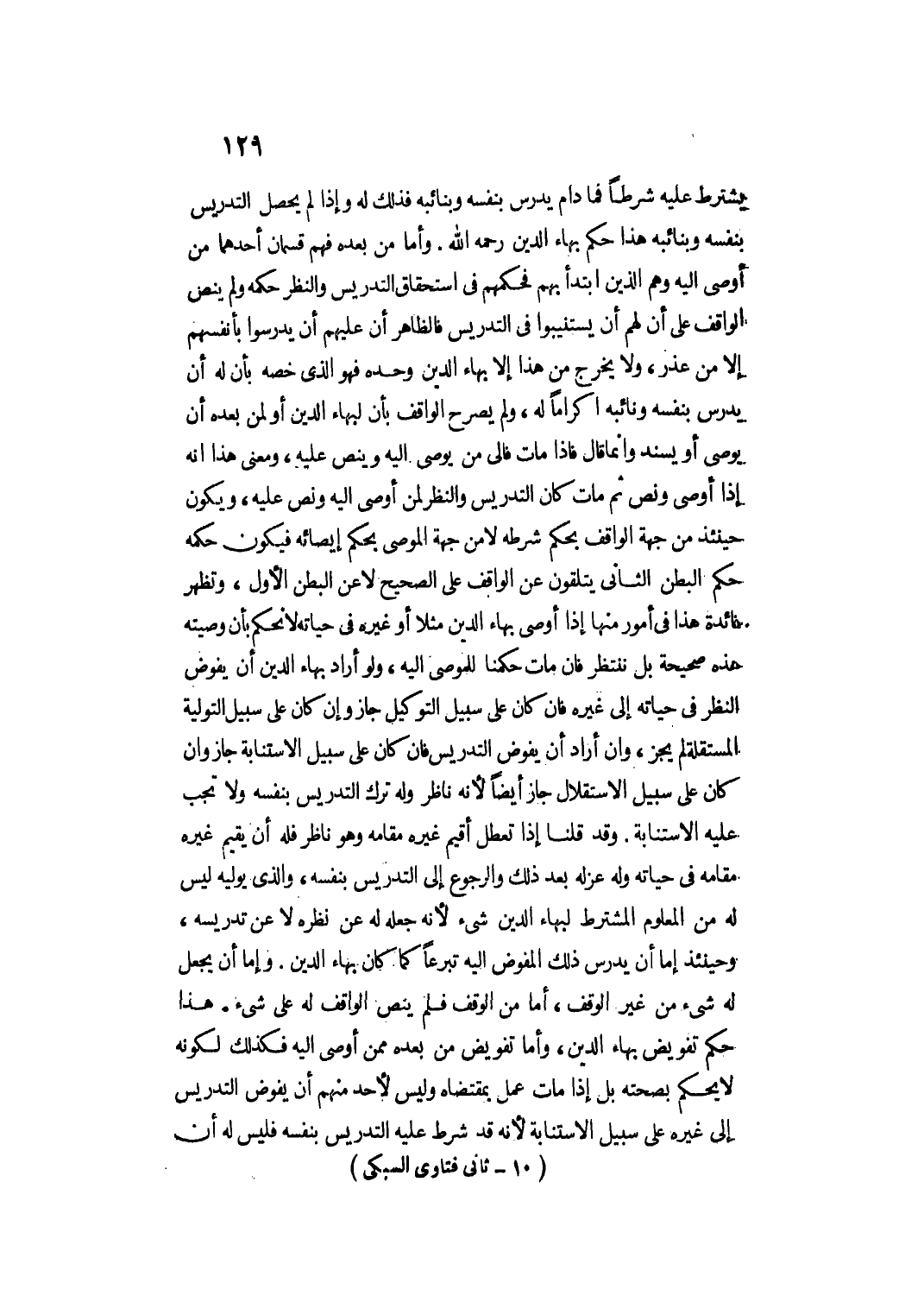 يَشْتَرِطْ عَلَيْهِ شَرْطًا مَا دَامَ يُدَرِّسُ بِنَفْسِهِ وَبِنَائِبِهِ فَذَلِكَ لَهُ، وَإِذَا لَمْ يُحَصِّلْ التَّدْرِيسَ بِنَفْسِهِ وَبِنَائِبِهِ هَذَا حُكْمُ بَهَاءِ الدِّينِ - رَحِمَهُ اللَّهُ -.