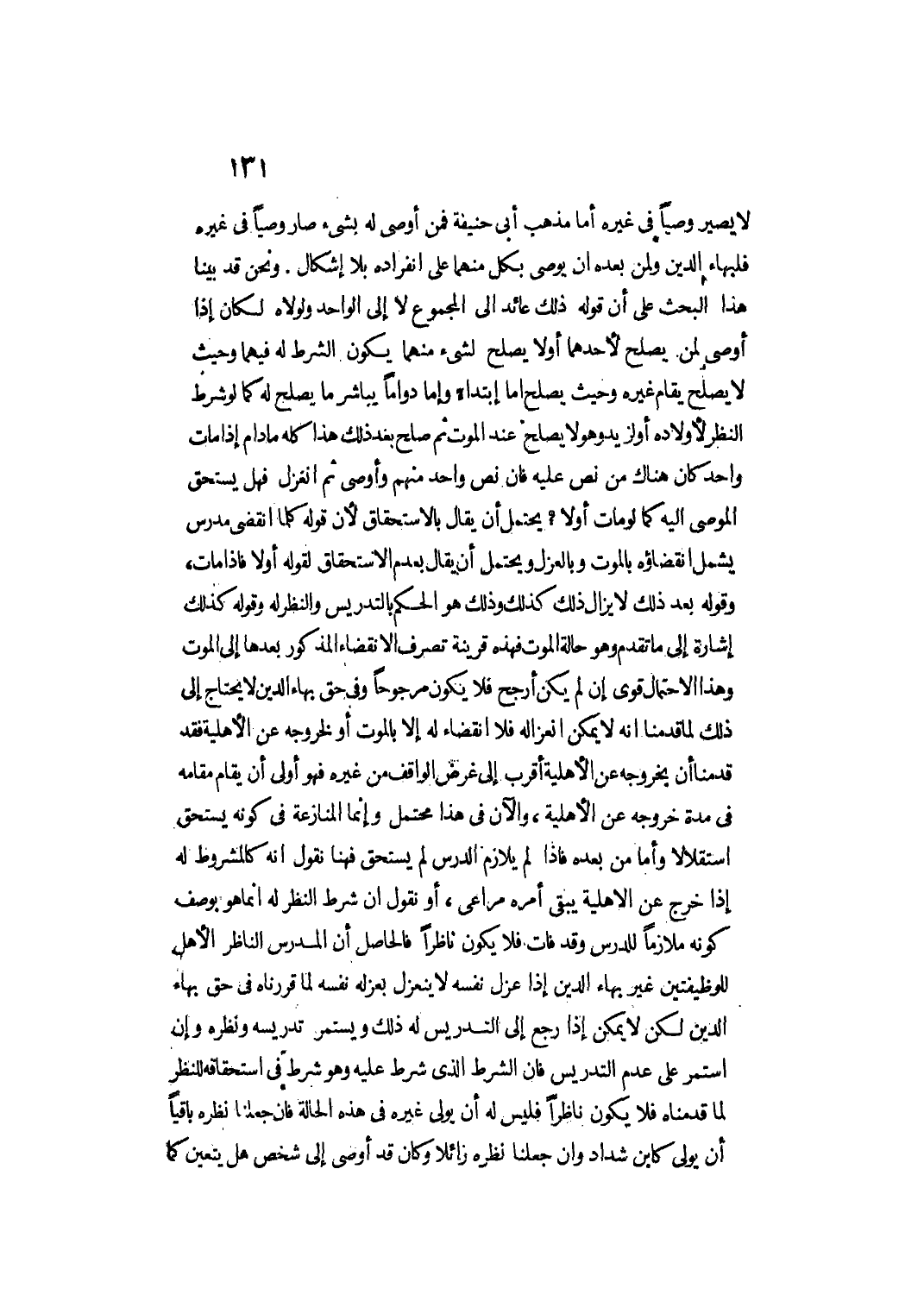 وَنَحْنُ قَدْ بَيَّنَّا هَذَا الْبَحْثَ عَلَى أَنَّ قَوْلَهُ ذَلِكَ عَائِدٌ إلَى الْمَجْمُوعِ لَا إلَى الْوَاحِدِ وَلَوْلَاهُ لَكَانَ إذَا أَوْصَى لِمَنْ يَصْلُحُ لِأَحَدِهِمَا، أَوْ لَا يَصْلُحُ لِشَيْءٍ مِنْهُمَا يَكُونُ الشَّرْطُ لَهُ فِيهِمَا وَحَيْثُ لَا يَصْلُحُ يُقَامُ غَيْرُهُ وَحَيْثُ يَصْلُحُ إمَّا ابْتِدَاءً وَإِمَّا دَوَامًا يُبَاشِرُ مَا يَصْلُحُ لَهُ كَمَا لَوْ شَرَطَ النَّظَرَ لِأَوْلَادِهِ، أَوْ لِزَيْدٍ، وَهُوَ لَا يَصْلُحُ عِنْدَ الْمَوْتِ ثُمَّ صَلَحَ بَعْدَ ذَلِكَ هَذَا كُلُّهُ مَا دَامَ إذَا مَاتَ وَاحِدٌ كَانَ هُنَاكَ مَنْ نَصَّ عَلَيْهِ، فَإِنْ نَصَّ وَاحِدٌ مِنْهُمْ وَأَوْصَى ثُمَّ انْعَزَلَ فَهَلْ يَسْتَحِقُّ الْمُوصَى إلَيْهِ كَمَا لَوْ مَاتَ أَوَّلًا؟ يُحْتَمَلُ أَنْ يُقَالَ بِالِاسْتِحْقَاقِ؛ لِأَنَّ قَوْلَهُ كُلَّمَا انْقَضَى مُدَرِّسٌ يَشْمَلُ انْقِضَاؤُهُ بِالْمَوْتِ وَبِالْعَزْلِ وَيُحْتَمَلُ أَنْ يُقَالَ بِعَدَمِ الِاسْتِحْقَاقِ لِقَوْلِهِ أَوَّلًا، فَإِذَا مَاتَ، وَقَوْلُهُ بَعْدَ ذَلِكَ لَا يَزَالُ ذَلِكَ كَذَلِكَ وَذَلِكَ هُوَ الْحُكْمُ بِالتَّدْرِيسِ وَالنَّظَرِ لَهُ وَقَوْلُهُ كَذَلِكَ إشَارَةٌ إلَى مَا تَقَدَّمَ، وَهُوَ حَالَةُ الْمَوْتِ فَهَذِهِ قَرِينَةٌ تَصْرِفُ الِانْقِضَاءَ الْمَذْكُورَ بَعْدَهَا إلَى الْمَوْتِ وَهَذَا الِاحْتِمَالُ قَوِيٌّ إنْ لَمْ يَكُنْ أَرْجَحَ فَلَا يَكُونُ مَرْجُوحًا، وَفِي حَقِّ بِهَاءِ الدِّينِ لَا يَحْتَاجُ إلَى ذَلِكَ لِمَا قَدَّمْنَا أَنَّهُ لَا يُمْكِنُ انْعِزَالُهُ فَلَا انْقِضَاءَ لَهُ إلَّا بِالْمَوْتِ، أَوْ لِخُرُوجِهِ عَنْ الْأَهْلِيَّةِ فَقَدْ قَدَّمْنَا أَنَّهُ بِخُرُوجِهِ عَنْ الْأَهْلِيَّةِ أَقْرَبُ إلَى غَرَضِ الْوَاقِفِ مِنْ غَيْرِهِ، فَهُوَ أَوْلَى أَنْ يُقَامَ مَقَامَهُ فِي مُدَّةِ خُرُوجِهِ عَنْ الْأَهْلِيَّةِ، وَالْآنُ فِي هَذَا مُحْتَمَلٌ، وَإِنَّمَا الْمُنَازَعَةُ فِي كَوْنِهِ يَسْتَحِقُّ اسْتِقْلَالًا، وَأَمَّا مَنْ بَعْدَهُ، فَإِذَا لَمْ يُلَازِمْ الدَّرْسَ لَمْ يَسْتَحِقَّ فَهُنَا نَقُولُ: إنَّهُ كَالْمَشْرُوطِ لَهُ إذَا خَرَجَ عَنْ الْأَهْلِيَّةِ يَبْقَى أَمْرُهُ مُرَاعًى، أَوْ نَقُولُ: إنَّ شَرْطَ النَّظَرِ لَهُ إنَّمَا هُوَ بِوَصْفِ كَوْنِهِ مُلَازِمًا لِلدَّرْسِ وَقَدْ فَاتَ فَلَا يَكُونُ نَاظِرًا فَالْحَاصِلُ أَنَّ الْمُدَرِّسَ النَّاظِرَ الْأَهْلَ لِلْوَظِيفَتَيْنِ غَيْرُ بَهَاءِ الدِّينِ إذَا عَزَلَ نَفْسَهُ لَا يَنْعَزِلُ بِعَزْلِهِ نَفْسَهُ لِمَا قَرَّرْنَاهُ فِي حَقِّ بَهَاءِ الدِّينِ لَكِنْ لَا يُمْكِنُ إذَا رَجَعَ إلَى التَّدْرِيسِ لَهُ ذَلِكَ وَيَسْتَمِرُّ تَدْرِيسُهُ وَنَظَرُهُ، وَإِنْ اسْتَمَرَّ عَلَى عَدَمِ التَّدْرِيسِ فَإِنَّ الشَّرْطَ الَّذِي شُرِطَ عَلَيْهِ، وَهُوَ شَرْطٌ فِي اسْتِحْقَاقِهِ لِلنَّظَرِ لِمَا قَدَّمْنَاهُ فَلَا يَكُونُ نَاظِرًا، فَلَيْسَ لَهُ أَنْ يُوَلِّيَ غَيْرَهُ فِي هَذِهِ الْحَالَةِ، فَإِنْ جَعَلْنَا نَظَرَهُ بَاقِيًا أَنْ يُوَلِّيَ كَابْنِ شَدَّادٍ، وَإِنْ جَعَلْنَا نَظَرَهُ زَائِلًا وَكَانَ قَدْ أَوْصَى إلَى شَخْصٍ هَلْ يَتَعَيَّنُ كَمَا