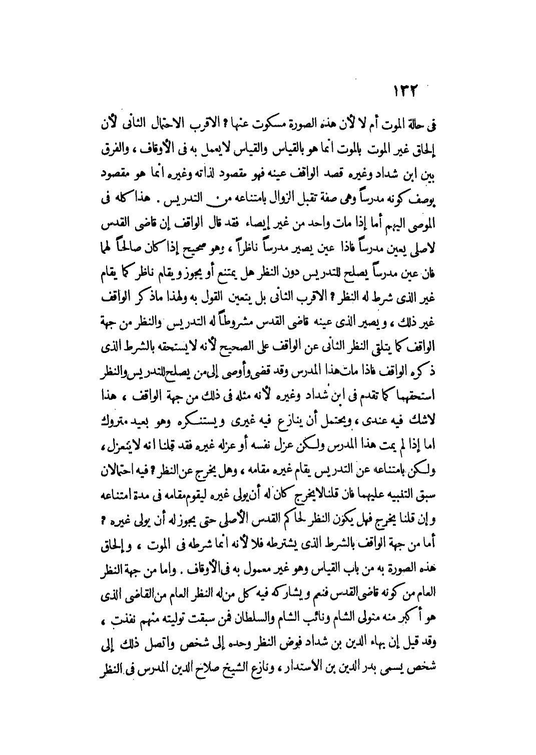 فِي حَالَةِ الْمَوْتِ أَمْ لَا؛ لِأَنَّ هَذِهِ الصُّورَةَ مَسْكُوتٌ عَنْهَا؟ الْأَقْرَبُ الِاحْتِمَالُ الثَّانِي؛ لِأَنَّ إلْحَاقَ غَيْرِ الْمَوْتِ بِالْمَوْتِ إنَّمَا هُوَ بِالْقِيَاسِ وَالْقِيَاسُ لَا يُعْمَلُ بِهِ فِي الْأَوْقَافِ، وَالْفَرْقُ بَيْنَ ابْنِ شَدَّادٍ وَغَيْرِهِ قَصْدُ الْوَاقِفِ عَيْنَهُ، فَهُوَ مَقْصُودٌ لِذَاتِهِ وَغَيْرُهُ إنَّمَا هُوَ مَقْصُودٌ بِوَصْفِ كَوْنِهِ مُدَرِّسًا وَهِيَ صِفَةٌ تَقْبَلُ الزَّوَالَ بِامْتِنَاعِهِ مِنْ التَّدْرِيسِ.