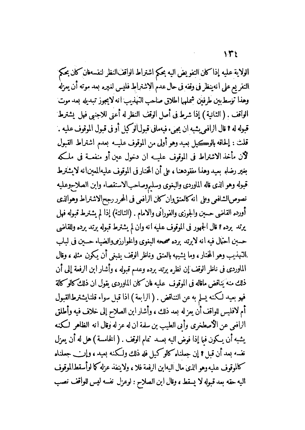 (الثَّالِثَةُ) إذَا لَمْ يُشْتَرَطْ قَبُولُهُ فَهَلْ يَرْتَدُّ بِرَدِّهِ؟ قَالَ الْجُمْهُورُ فِي الْمَوْقُوفِ عَلَيْهِ إنَّهُ، وَإِنْ لَمْ يُشْتَرَطْ قَبُولُهُ يَرْتَدُّ بِرَدِّهِ وَلِلْقَاضِي حُسَيْنٍ احْتِمَالٌ فِيهِ أَنَّهُ لَا يَرْتَدُّ بِرَدِّهِ صَحَّحَهُ الْبَغَوِيّ وَالْخُوَارِزْمِيّ وَالضِّيَاءُ حُسَيْنٌ فِي لُبَابِ التَّهْذِيبِ، وَهُوَ الْمُخْتَارُ، وَمَا يُشْبِهُهُ بِالْعِتْقِ وَنَاظِرُ الْوَقْفِ يَنْبَغِي أَنْ يَكُونَ مِثْلَهُ.