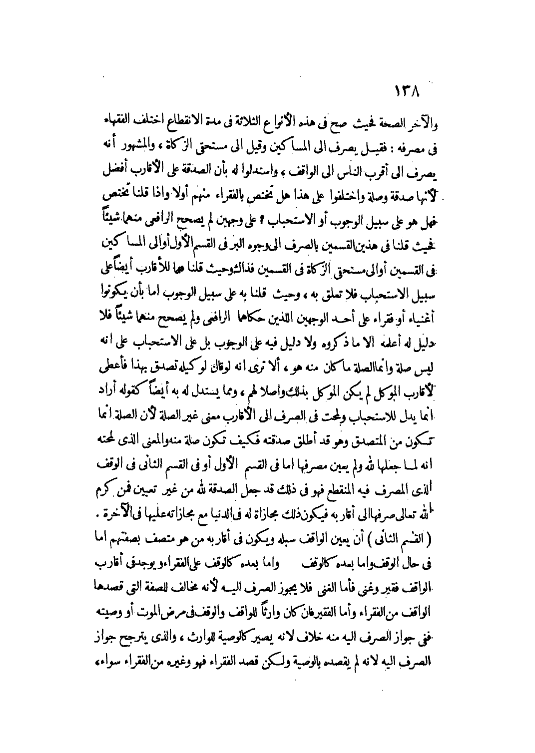 وَالْآخَرِ الصِّحَّةُ وَحَيْثُ صَحَّ فِي هَذِهِ الْأَنْوَاعِ الثَّلَاثَةِ فِي مُدَّةِ الِانْقِطَاعِ اخْتَلَفَ الْفُقَهَاءُ فِي مَصْرِفِهِ: فَقِيلَ: يُصْرَفُ إلَى الْمَسَاكِينِ وَقِيلَ إلَى مُسْتَحَقِّي الزَّكَاةِ وَالْمَشْهُورُ أَنَّهُ يُصْرَفُ إلَى أَقْرَبِ النَّاسِ إلَى الْوَاقِفِ، وَاسْتَدَلُّوا لَهُ بِأَنَّ الصَّدَقَةَ عَلَى الْأَقَارِبِ أَفْضَلُ؛ لِأَنَّهَا صَدَقَةٌ وَصِلَةٌ وَاخْتَلَفُوا عَلَى هَذَا هَلْ تَخْتَصُّ بِالْفُقَرَاءِ مِنْهُمْ، أَوْ لَا، وَإِذَا قُلْنَا: تَخْتَصُّ فَهَلْ هُوَ عَلَى سَبِيلِ الْوُجُوبِ، أَوْ الِاسْتِحْبَابِ؟ عَلَى وَجْهَيْنِ لَمْ يُصَحِّحْ الرَّافِعِيُّ مِنْهُمَا شَيْئًا فَحَيْثُ قُلْنَا: فِي هَذَيْنِ الْقِسْمَيْنِ بِالصَّرْفِ إلَى وُجُوهِ الْبِرِّ فِي الْقِسْمِ الْأَوَّلِ، أَوْ إلَى الْمَسَاكِينِ فِي الْقِسْمَيْنِ، أَوْ إلَى مُسْتَحِقِّي الزَّكَاةِ فِي الْقِسْمَيْنِ فَذَاكَ وَحَيْثُ قُلْنَا: هُمَا لِلْأَقَارِبِ أَيْضًا عَلَى سَبِيلِ الِاسْتِحْبَابِ فَلَا تَعَلُّقَ بِهِ، وَحَيْثُ قُلْنَا: بِهِ عَلَى سَبِيلِ الْوُجُوبِ أَمَّا بِأَنْ يَكُونُوا أَغْنِيَاءَ، أَوْ فُقَرَاءَ عَلَى أَحَدِ الْوَجْهَيْنِ اللَّذَيْنِ حَكَاهُمَا الرَّافِعِيُّ، وَلَمْ يُصَحِّحْ مِنْهُمَا شَيْئًا فَلَا دَلِيلَ لَهُ أَعْلَمُهُ إلَّا مَا ذَكَرُوهُ، وَلَا دَلِيلَ فِيهِ عَلَى الْوُجُوبِ بَلْ عَلَى الِاسْتِحْبَابِ عَلَى أَنَّهُ لَيْسَ صِلَةً، وَإِنَّمَا الصِّلَةُ مَا كَانَ مِنْهُ هُوَ، أَلَا تَرَى أَنَّهُ لَوْ قَالَ لِوَكِيلِهِ تَصَدَّقْ بِهَذَا فَأَعْطَى لِأَقَارِبِ الْمُوَكِّلِ لَمْ يَكُنْ الْمُوَكِّلُ بِذَلِكَ وَاصِلًا لَهُمْ، وَمِمَّا يُسْتَدَلُّ لَهُ بِهِ أَيْضًا كَقَوْلِهِ أَرَادَ إنَّمَا يَدُلُّ لِلِاسْتِحْبَابِ وَلَمَحْت فِي الصَّرْفِ إلَى الْأَقَارِبِ مَعْنًى غَيْرَ الصِّلَةِ؛ لِأَنَّ الصِّلَةَ إنَّمَا تَكُونُ مِنْ الْمُتَصَدِّقِ، وَهُوَ قَدْ أَطْلَقَ صَدَقَتَهُ فَكَيْفَ تَكُونُ صِلَةً مِنْهُ وَالْمَعْنَى الَّذِي لَمَحْته أَنَّهُ لَمَّا جَعَلَهَا لِلَّهِ وَلَمْ يُعَيِّنْ مَصْرِفَهَا إمَّا فِي الْقِسْمِ الْأَوَّلِ، أَوْ فِي الْقِسْمِ الثَّانِي فِي الْوَقْفِ الَّذِي الْمَصْرِفُ فِيهِ الْمُنْقَطِعُ، فَهُوَ فِي ذَلِكَ قَدْ جَعَلَ الصَّدَقَةَ لِلَّهِ مِنْ غَيْرِ تَعْيِينٍ فَمِنْ كَرَمِ اللَّهِ تَعَالَى صَرْفُهَا إلَى أَقَارِبِهِ، فَيَكُونُ ذَلِكَ مُجَازَاةً لَهُ فِي الدُّنْيَا مَعَ مُجَازَاتِهِ عَلَيْهَا فِي الْآخِرَةِ.