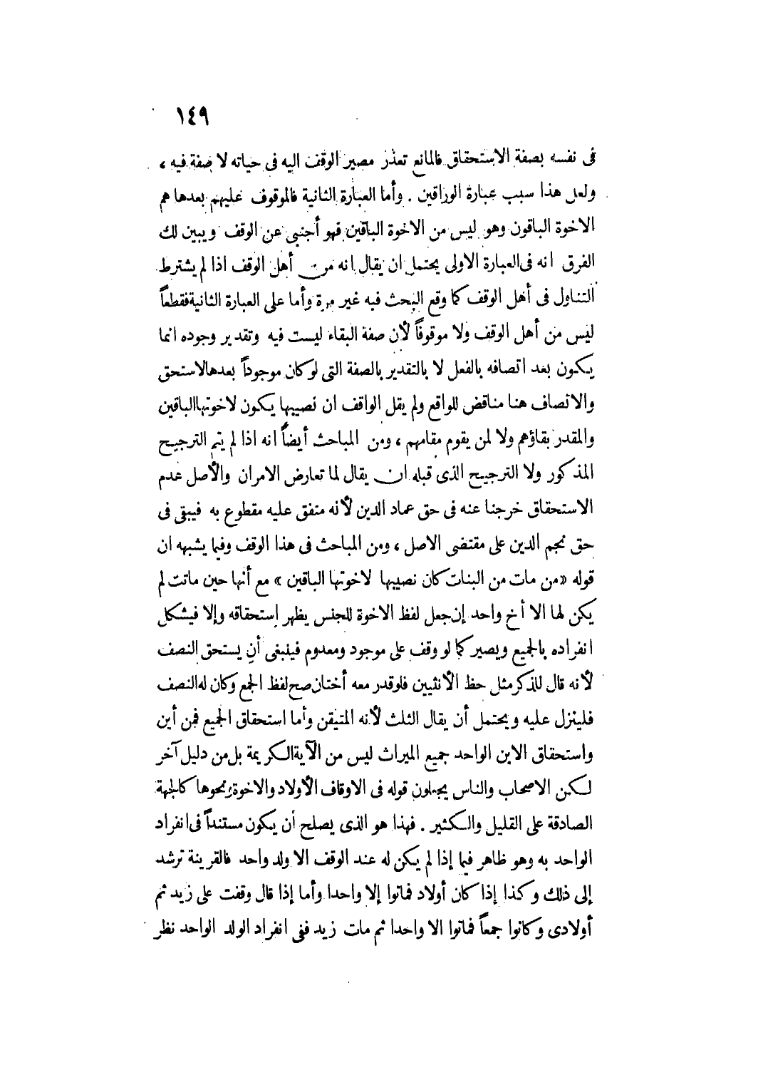 وَالْأَصْلُ عَدَمُ الِاسْتِحْقَاقِ خَرَجْنَا عَنْهُ فِي حَقِّ عِمَادِ الدِّينِ؛ لِأَنَّهُ مُتَّفَقٌ عَلَيْهِ مَقْطُوعٌ بِهِ فَيَبْقَى فِي حَقِّ نَجْمِ الدِّينِ عَلَى مُقْتَضَى الْأَصْلِ، وَمِنْ الْمَبَاحِثِ فِي هَذَا الْوَقْفِ، وَفِيمَا يُشْبِهُهُ أَنَّ قَوْلَهُ " مَنْ مَاتَ مِنْ الْبَنَاتِ كَانَ نَصِيبُهَا لِإِخْوَتِهَا الْبَاقِينَ " مَعَ أَنَّهَا حِينَ مَاتَتْ لَمْ يَكُنْ لَهَا إلَّا أَخٌ وَاحِدٌ إنْ جَعَلَ لَفْظَ الْأُخُوَّةِ لِلْجِنْسِ يَظْهَرُ اسْتِحْقَاقُهُ وَإِلَّا فَيُشْكِلُ انْفِرَادُهُ بِالْجَمِيعِ وَيَصِيرُ كَمَا لَوْ وَقَفَ عَلَى مَوْجُودٍ وَمَعْدُومٍ فَيَنْبَغِي أَنْ يَسْتَحِقَّ النِّصْفَ؛ لِأَنَّهُ قَالَ لِلذَّكَرِ مِثْلُ حَظِّ الْأُنْثَيَيْنِ، فَلَوْ قُدِّرَ مَعَهُ أُخْتَانِ صَحَّ لَفْظُ الْجَمْعِ وَكَانَ لَهُ النِّصْفُ فَلْيَنْزِلْ عَلَيْهِ وَيَحْتَمِلُ أَنْ يُقَالَ الثُّلُثُ؛ لِأَنَّهُ الْمُتَيَقَّنُ، وَأَمَّا اسْتِحْقَاقُ الْجَمِيعِ فَمِنْ أَيْنَ وَاسْتِحْقَاقُ الِابْنِ الْوَاحِدِ جَمِيعَ الْمِيرَاثِ لَيْسَ مِنْ الْآيَةِ الْكَرِيمَةِ، بَلْ مِنْ دَلِيلٍ آخَرَ لَكِنَّ الْأَصْحَابَ وَالنَّاسَ يَجْعَلُونَ قَوْلَهُ فِي الْأَوْقَافِ: الْأَوْلَادُ وَالْإِخْوَةُ وَنَحْوَهَا كَالْجِهَةِ الصَّادِقَةِ عَلَى الْقَلِيلِ وَالْكَثِيرِ.