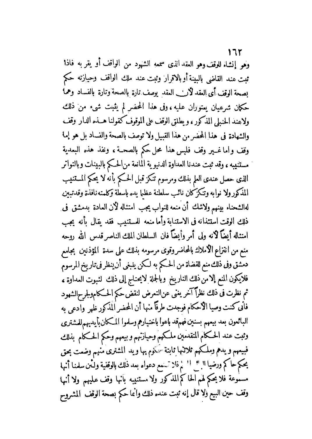 وَفِي هَذَا الْمَحْضَرِ لَمْ يَثْبُتْ شَيْءٌ مِنْ ذَلِكَ وَلَا عِنْدَ الْحَنْبَلِيِّ الْمَذْكُورِ، وَيُطْلَقُ الْوَقْفُ عَلَى الْمَوْقُوفِ كَقَوْلِنَا هَذِهِ الدَّارُ وَقْفٌ وَالشَّهَادَةُ فِي هَذَا الْمَحْضَرِ مِنْ هَذَا الْقَبِيلِ وَلَا تُوصَفُ بِالصِّحَّةِ وَالْفَسَادِ بَلْ هُوَ إمَّا وَقْفٌ وَإِمَّا غَيْرُ وَقْفٍ فَلَيْسَ هَذَا مَحَلُّ حُكْمٍ بِالصِّحَّةِ، وَنَفَّذَ هَذِهِ الْبَعْدِيَّةَ مُسْتَنِيبُهُ، وَقَدْ ثَبَتَ عِنْدَنَا الْعَدَاوَةُ الدُّنْيَوِيَّةُ الْمَانِعَةُ مِنْ الْحُكْمِ بِالْبَيِّنَاتِ وَبِالتَّوَاتُرِ الَّذِي حَصَلَ عِنْدِي الْعِلْمُ بِذَلِكَ وَمَرْسُومُ تَنْكُزُ قَبْلَ الْحُكْمِ بِأَنَّهُ لَا يَحْكُمُ الْمُسْتَنِيبُ الْمَذْكُورُ وَلَا نُوَّابُهُ وَتَنْكُزُ كَانَ نَائِبَ سَلْطَنَةٍ عَظِيمًا يَدُهُ بَاسِطَةٌ وَكَلِمَتُهُ نَافِذَةٌ وَقَدْ تَبَيَّنَ لَهُ الشَّحْنَاءُ بَيْنَهُمْ وَلَا شَكَّ أَنَّ مَنْعَهُ لِلنُّوَّابِ يَجِبُ امْتِثَالُهُ؛ لِأَنَّ الْعَادَةَ بِدِمَشْقَ فِي ذَلِكَ الْوَقْتِ اسْتِئْذَانُهُ فِي الِاسْتِنَابَةِ وَأَمَّا مَنْعُهُ لِلْمُسْتَنِيبِ فَقَدْ يُقَالُ بِأَنَّهُ يَجِبُ امْتِثَالُهُ أَيْضًا؛ لِأَنَّهُ وَلِيُّ أَمْرٍ وَأَيْضًا فَإِنَّ السُّلْطَانَ الْمَلِكَ النَّاصِرَ قَدَّسَ اللَّهُ رُوحَهُ مَنَعَ مِنْ انْتِزَاعِ الْأَمْلَاكِ بِالْمَحَاضِرِ وَقَوَّى مَرْسُومَهُ بِذَلِكَ عَلَى سُدَّةِ الْمُؤَذِّنِينَ بِجَامِعِ دِمَشْقَ وَفِي ذَلِكَ مَنْعٌ لِلْقُضَاةِ مِنْ الْحُكْمِ بِهِ لَكِنْ يَنْبَغِي أَنْ يَنْظُرَ فِي تَارِيخِ الْمَرْسُومِ فَلَا يَكُونُ الْمَنْعُ إلَّا مِنْ ذَلِكَ التَّارِيخِ وَبِالْجُمْلَةِ لَا يَحْتَاجُ إلَى ذَلِكَ لِثُبُوتِ الْعَدَاوَةِ، ثُمَّ نَظَرْت فِي ذَلِكَ نَظَرًا آخَرَ يُغْنِي عَنْ التَّعَرُّضِ لِنَقْضِ حُكْمِ الْحُكَّامِ وَلِجَرْحِ الشُّهُودِ فَإِنِّي كُنْت وَصِيًّا عَلَى الْأَحْكَامِ فَوَجَدْتُ طَرَفًا مِنْهَا أَنَّ الْمَحْضَرَ الْمَذْكُورَ ظَهَرَ وَادَّعَى بِهِ الْبَائِعُونَ بَعْدَ بَيْعِهِمْ بِسِنِينَ فَهُمْ قَدْ بَاعُوا بِاخْتِيَارِهِمْ وَسَلَّمُوا الْمَكَانَ بِأَيْدِيهِمْ لِلْمُشْتَرِي وَثَبَتَ عِنْدَ الْحُكَّامِ الْمُتَقَدِّمِينَ مُلْكُهُمْ وَحِيَازَتُهُمْ وَبَيْعُهُمْ، وَحَكَمَ الْحُكَّامُ بِذَلِكَ فَبَيْعُهُمْ وَيَدُهُمْ وَمِلْكُهُمْ ثَلَاثَتُهَا ثَابِتَةٌ مَحْكُومٌ بِهَا وَيَدُ الْمُشْتَرِي مِنْهُمْ وُضِعَتْ بِحَقٍّ بِحُكْمِ حَاكِمٍ وَرَضِيَ الْبَائِعُ الْمُسْلِمُ فَلَا تُسْمَعُ دَعْوَاهُ بَعْدَ ذَلِكَ بِالْوَقْفِيَّةِ وَلَئِنْ سَلَّمْنَا أَنَّهَا مَسْمُوعَةٌ فَلَا يَحْكُمُ لَهُمْ الْحَاكِمُ الْمَذْكُورُ وَلَا مُسْتَنِيبُهُ بِأَنَّهَا وَقْفٌ عَلَيْهِمْ وَلَا أَنَّهَا وَقْفٌ حِينَ الْبَيْعِ وَلَا قَالَ إنَّهُ ثَبَتَ عِنْدَهُ ذَلِكَ وَإِنَّمَا حَكَمَ بِصِحَّةِ الْوَقْفِ الْمَشْرُوحِ