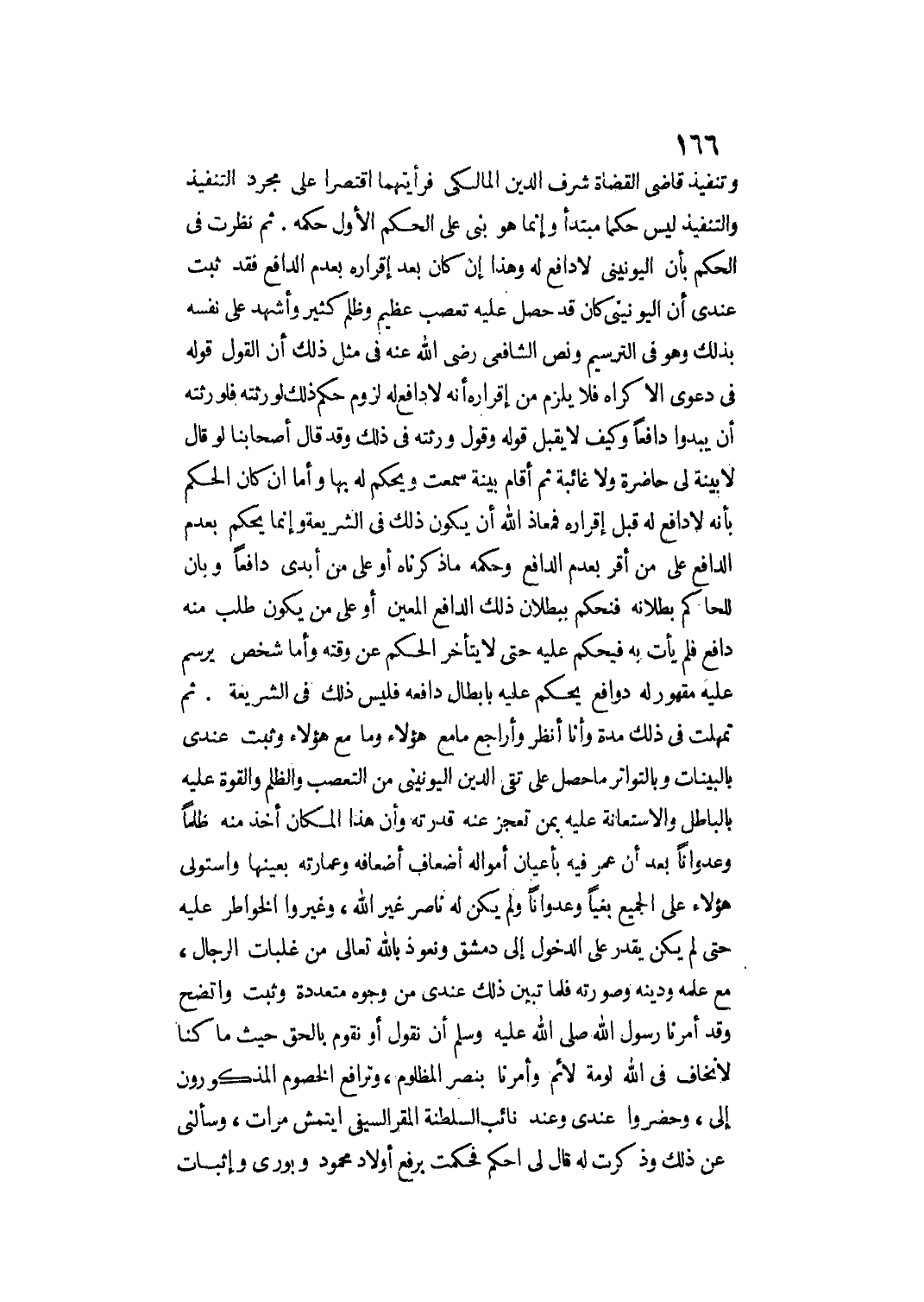 ثُمَّ تَمَهَّلْت فِي ذَلِكَ مُدَّةً وَأَنَا أَنْظُرُ وَأُرَاجِعُ مَا مَعَ هَؤُلَاءِ وَمَا مَعَ هَؤُلَاءِ وَثَبَتَ عِنْدِي بِالْبَيِّنَاتِ وَبِالتَّوَاتُرِ مَا حَصَلَ عَلَى تَقِيِّ الدِّينِ الْيُونِينِيّ مِنْ التَّعَصُّبِ وَالظُّلْمِ وَالْقُوَّةِ عَلَيْهِ بِالْبَاطِلِ وَالِاسْتِعَانَةِ عَلَيْهِ بِمَنْ تَعْجِزُ عَنْهُ قُدْرَتُهُ وَأَنَّ هَذَا الْمَكَانَ أُخِذَ مِنْهُ ظُلْمًا وَعُدْوَانًا بَعْدَ أَنْ عَمَّرَ فِيهِ بِأَعْيَانِ أَمْوَالِهِ أَضْعَافَ أَضْعَافِهِ وَعِمَارَتُهُ بِعَيْنِهَا وَاسْتَوْلَى هَؤُلَاءِ عَلَى الْجَمِيعِ بَغْيًا وَعُدْوَانًا وَلَمْ يَكُنْ لَهُ نَاصِرٌ غَيْرَ اللَّهِ، وَغَيَّرُوا الْخَوَاطِرَ عَلَيْهِ حَتَّى لَمْ يَكُنْ يَقْدِرُ عَلَى الدُّخُولِ إلَى دِمَشْقَ وَنَعُوذُ بِاَللَّهِ تَعَالَى مِنْ غَلَبَاتِ الرِّجَالِ، مَعَ عِلْمِهِ وَدِينِهِ وَصُورَتِهِ فَلَمَّا تَبَيَّنَ ذَلِكَ عِنْدِي مِنْ وُجُوهٍ مُتَعَدِّدَةٍ وَثَبَتَ وَاتَّضَحَ وَقَدْ أَمَرَنَا رَسُولُ اللَّهِ - صَلَّى اللَّهُ عَلَيْهِ وَسَلَّمَ - أَنْ نَقُولَ أَوْ نَقُومَ بِالْحَقِّ حَيْثُ مَا كُنَّا لَا نَخَافُ فِي اللَّهِ لَوْمَةَ لَائِمٍ وَأَمَرَنَا بِنَصْرِ الْمَظْلُومِ، وَتَرَافَعَ الْخُصُومُ الْمَذْكُورُونَ إلَيَّ، وَحَضَرُوا عِنْدِي وَعِنْدَ نَائِبِ السَّلْطَنَةِ الْمُقِرُّ السَّيْفِيُّ ايتمش مرات، وَسَأَلَنِي عَنْ ذَلِكَ وَذَكَرْت لَهُ قَالَ لِي اُحْكُمْ فَحَكَمْت بِرَفْعِ أَوْلَادِ مَحْمُودٍ وَبُورِي وَإِثْبَاتِ