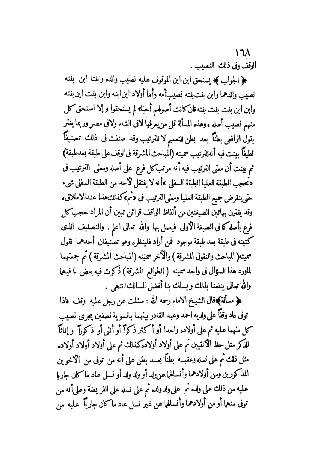 (الْجَوَابُ) يَسْتَحِقُّ ابْنُ ابْنِ الْمَوْقُوفِ عَلَيْهِ نَصِيبَ وَالِدِهِ، وَبِنْتَا ابْنِ بِنْتِهِ نَصِيبَ وَالِدِهِمَا، وَابْنُ بِنْتِ بِنْتِهِ نَصِيبَ أُمِّهِ وَأَمَّا أَوْلَادُ ابْنِ ابْنِهِ وَابْنِ بِنْتِ ابْنِ بِنْتِهِ وَابْنِ ابْنِ بِنْتِ بِنْتِ بِنْتِهِ فَإِنْ كَانَتْ أُصُولُهُمْ أَحْيَاءً لَمْ يَسْتَحِقُّوا وَإِلَّا اسْتَحَقَّ كُلٌّ مِنْهُمْ نَصِيبَ أَصْلِهِ، وَهَذِهِ الْمَسْأَلَةُ قَلَّ مَنْ يَعْرِفُهَا لَا فِي الشَّامِ وَلَا فِي مِصْرَ وَرُبَّمَا يُغْتَرُّ بِقَوْلِ الرَّافِعِيِّ بَطْنًا بَعْدَ بَطْنٍ لِلتَّعْمِيمِ لَا لِلتَّرْتِيبِ وَقَدْ صَنَّفْت فِي ذَلِكَ تَصْنِيفًا لَطِيفًا بَيَّنْت فِيهِ أَنَّهُ لِلتَّرْتِيبِ سَمَّيْته (الْمَبَاحِثَ الْمُشْرِقَةَ فِي الْوَقْفِ عَلَى طَبَقَةٍ بَعْدَ طَبَقَةٍ) ثُمَّ بَيَّنْت أَنَّ مَعْنَى التَّرْتِيبِ فِيهِ أَنَّهُ مُرَتَّبٌ كُلُّ فَرْعٍ عَلَى أَصْلِهِ وَمَعْنَى التَّرْتِيبِ فِي " تَحْجُبُ الطَّبَقَةُ الْعُلْيَا الطَّبَقَةَ السُّفْلَى " أَنَّهُ لَا يَنْتَقِلُ لِأَحَدٍ مِنْ الطَّبَقَةِ السُّفْلَى شَيْءٌ حَتَّى يَنْقَرِضَ جَمِيعُ الطَّبَقَةِ الْعُلْيَا وَمَعْنَى التَّرْتِيبِ فِي " ثُمَّ " كَذَلِكَ هَذَا عِنْدَ الْإِطْلَاقِ، وَقَدْ يَقْتَرِنُ بِهَاتَيْنِ الصِّيغَتَيْنِ مِنْ أَلْفَاظِ الْوَاقِفِ قَرَائِنُ تُبَيِّنُ أَنَّ الْمُرَادَ حَجْبُ كُلِّ فَرْعٍ بِأَصْلِهِ كَمَا فِي الصِّيغَةِ الْأُولَى فَيُعْمَلُ بِهَا وَاَللَّهُ تَعَالَى أَعْلَمُ.