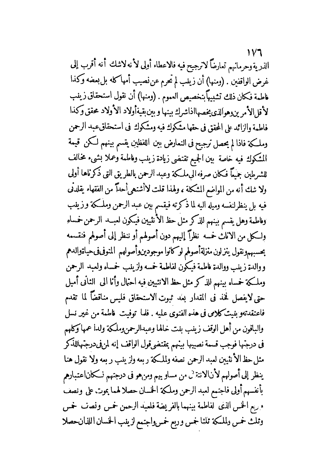 (وَمِنْهَا) أَنْ نَقُولَ اسْتِحْقَاقُ زَيْنَبَ لِأَقَلِّ الْأَمْرَيْنِ وَهُوَ الَّذِي يَخُصُّهَا إذَا شَرَّكَ بَيْنَهَا وَبَيْنَ بَقِيَّةِ أَوْلَادِ الْأَوْلَادِ مُحَقَّقٌ وَكَذَا فَاطِمَةُ وَالزَّائِدُ عَلَى الْمُحَقَّقِ فِي حَقِّهَا مَشْكُوكٌ فِيهِ وَمَشْكُوكٌ فِي اسْتِحْقَاقِ عَبْدِ الرَّحْمَنِ وَمَلَكَةَ فَإِذَا لَمْ يَحْصُلْ تَرْجِيحٌ فِي التَّعَارُضِ بَيْنَ اللَّفْظَيْنِ يُقَسَّمُ بَيْنَهُمْ لَكِنَّ قِيمَةَ الْمَشْكُوكِ فِيهِ خَاصَّةٌ بَيْنَ الْجَمِيعِ تَقْتَضِي زِيَادَةَ زَيْنَبَ وَفَاطِمَةَ وَعَمَلًا بِشَيْءٍ مُخَالِفٍ لِلشَّرْطَيْنِ جَمِيعًا فَكَانَ صَرْفُهُ إلَى مَلَكَةَ وَعَبْدِ الرَّحْمَنِ بِالطَّرِيقِ الَّتِي ذَكَرْنَاهَا أَوْلَى وَلَا شَكَّ أَنَّهُ مِنْ الْمَوَاضِعِ الْمُشْكِلَةِ، وَلِهَذَا قُلْت لَا أَشْتَهِي أَحَدًا مِنْ الْفُقَهَاءِ يُقَلِّدُنِي فِيهِ بَلْ يَنْظُرُ لِنَفْسِهِ وَمَيْلِهِ إلَيْهِ لِمَا ذَكَرْته فَيُقَسِّمُ بَيْنَ عَبْدِ الرَّحْمَنِ وَمَلَكَةَ وَزَيْنَبَ وَفَاطِمَةَ وَهَلْ يُقَسِّمُ بَيْنَهُمْ لِلذَّكَرِ مِثْلُ حَظِّ الْأُنْثَيَيْنِ فَيَكُونُ لِعَبْدِ الرَّحْمَنِ خُمُسَاهُ وَلِكُلٍّ مِنْ الْإِنَاثِ خُمُسُهُ نَظَرًا إلَيْهِمْ دُونَ أُصُولِهِمْ أَوْ نَنْظُرُ إلَى أُصُولِهِمْ فَنُقَسِّمُهُ بِحَسَبِهِمْ وَنَقُولُ يَنْزِلُونَ مَنْزِلَةَ أُصُولِهِمْ لَوْ كَانُوا مَوْجُودِينَ وَأُصُولُهُمْ الْمُتَوَفَّى فِي حَيَاةِ وَالِدِهِمْ وَوَالِدَةِ زَيْنَبَ وَوَالِدَةِ فَاطِمَةَ فَيَكُونُ لِفَاطِمَةَ خُمُسُهُ وَلِزَيْنَبِ خُمُسَاهُ وَلِعَبْدِ الرَّحْمَنِ وَمَلَكَةَ خُمُسَاهُ بَيْنَهُمْ لِلذَّكَرِ مِثْلُ حَظِّ الْأُنْثَيَيْنِ فِيهِ احْتِمَالٌ وَأَنَا إلَى الثَّانِي أَمِيلُ حَتَّى لَا يَفْصِلَ فَخُذْ فِي الْمِقْدَارِ بَعْدَ ثُبُوتِ الِاسْتِحْقَاقِ فَلَيْسَ مُنَاقِضًا لِمَا تَقَدَّمَ فَاعْتَقَدْته وَبَنَيْت كَلَامِي فِي هَذِهِ الْفَتْوَى عَلَيْهِ.