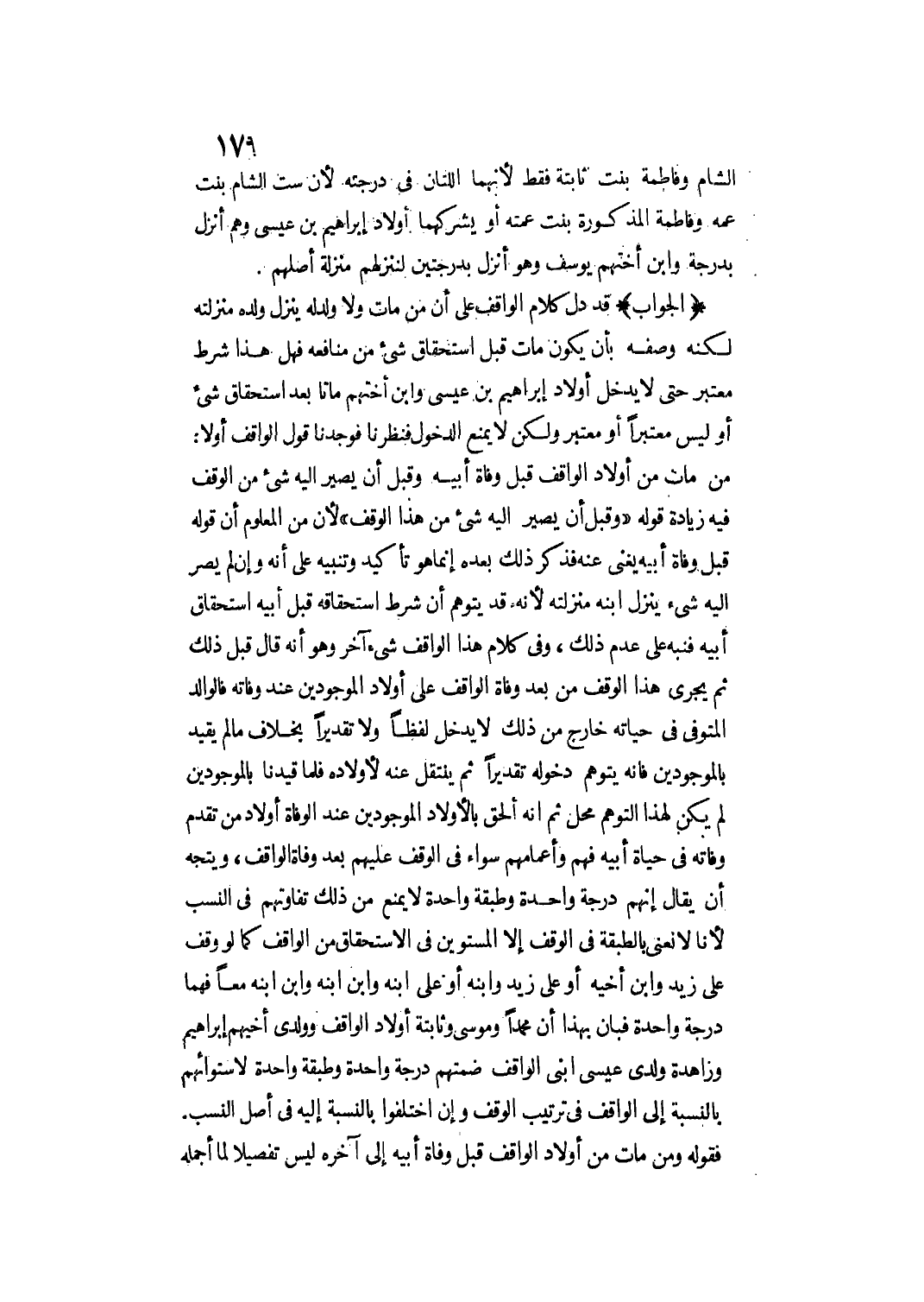 (الْجَوَابُ) قَدْ دَلَّ كَلَامُ الْوَاقِفِ عَلَى أَنَّ مَنْ مَاتَ وَلَا وَلَدَ لَهُ يَنْزِلُ وَلَدُهُ مَنْزِلَتَهُ لَكِنَّهُ وَصَفَهُ بِأَنْ يَكُونَ مَاتَ قَبْلَ اسْتِحْقَاقِ شَيْءٍ مِنْ مَنَافِعِهِ فَهَلْ هَذَا شَرْطٌ مُعْتَبَرٌ حَتَّى لَا يَدْخُلَ أَوْلَادُ إبْرَاهِيمَ بْنِ عِيسَى وَابْنُ أُخْتِهِمْ مَاتَا بَعْدَ اسْتِحْقَاقِ شَيْءٍ أَوْ لَيْسَ مُعْتَبَرًا أَوْ مُعْتَبَرٌ وَلَكِنْ لَا يَمْنَعُ الدُّخُولَ فَنَظَرْنَا فَوَجَدْنَا قَوْلَ الْوَاقِفِ أَوَّلًا: مَنْ مَاتَ مِنْ أَوْلَادِ الْوَاقِفِ قَبْلَ وَفَاةِ أَبِيهِ وَقَبْلَ أَنْ يَصِيرَ إلَيْهِ شَيْءٌ مِنْ الْوَقْفِ فِيهِ زِيَادَةٌ قَوْلُهُ " وَقَبْلَ أَنْ يَصِيرَ إلَيْهِ شَيْءٌ مِنْ هَذَا الْوَقْفِ "؛ لِأَنَّ مِنْ الْمَعْلُومِ أَنَّ قَوْلَهُ قَبْلَ وَفَاةِ أَبِيهِ يُغْنِي عَنْهُ فَذِكْرُ ذَلِكَ بَعْدَهُ إنَّمَا هُوَ تَأْكِيدٌ وَتَنْبِيهٌ عَلَى أَنَّهُ وَإِنْ لَمْ يَصِرْ إلَيْهِ شَيْءٌ يَنْزِلْ ابْنُهُ مَنْزِلَتَهُ؛ لِأَنَّهُ قَدْ يُتَوَهَّمُ أَنَّ شَرْطَ اسْتِحْقَاقِهِ قَبْلَ أَبِيهِ اسْتِحْقَاقُ أَبِيهِ فَنُبِّهَ عَلَى عَدَمِ ذَلِكَ، وَفِي كَلَامِ هَذَا الْوَاقِفِ شَيْءٌ آخَرُ وَهُوَ أَنَّهُ قَالَ قَبْلَ ذَلِكَ ثُمَّ يَجْرِي هَذَا الْوَقْفُ مِنْ بَعْدِ وَفَاةِ الْوَاقِفِ عَلَى أَوْلَادِ الْمَوْجُودِينَ عِنْدَ وَفَاتِهِ فَالْوَالِدُ الْمُتَوَفَّى فِي حَيَاتِهِ خَارِجٌ مِنْ ذَلِكَ لَا يَدْخُلُ لَفْظًا وَلَا تَقْدِيرًا بِخِلَافِ مَا لَمْ يُقَيَّدْ بِالْمَوْجُودِينَ فَإِنَّهُ يُتَوَهَّمُ دُخُولُهُ تَقْدِيرًا ثُمَّ يَنْتَقِلُ عَنْهُ لِأَوْلَادِهِ فَلَمَّا قَيَّدْنَا بِالْمَوْجُودِينَ لَمْ يَكُنْ لِهَذَا التَّوَهُّمِ مَحَلٌّ ثُمَّ إنَّهُ أُلْحِقَ بِالْأَوْلَادِ الْمَوْجُودِينَ عِنْدَ الْوَفَاةِ أَوْلَادُ مَنْ تَقَدَّمَ وَفَاتُهُ فِي حَيَاةِ أَبِيهِ فَهُمْ وَأَعْمَامُهُمْ سَوَاءٌ فِي الْوَقْفِ عَلَيْهِمْ بَعْدَ وَفَاةِ الْوَاقِفِ، وَيُتَّجَهُ أَنْ يُقَالَ إنَّهُمْ دَرَجَةٌ وَاحِدَةٌ وَطَبَقَةٌ وَاحِدَةٌ لَا يَمْنَعُ مِنْ ذَلِكَ تَفَاوُتُهُمْ فِي النَّسَبِ لِأَنَّا لَا نَعْنِي بِالطَّبَقَةِ فِي الْوَقْفِ إلَّا الْمُسْتَوِينَ فِي الِاسْتِحْقَاقِ مِنْ الْوَاقِفِ كَمَا لَوْ وَقَفَ عَلَى زَيْدٍ وَابْنِ أَخِيهِ أَوْ عَلَى زَيْدٍ وَابْنِهِ أَوْ عَلَى ابْنِهِ وَابْنِ ابْنِهِ وَابْنِ ابْنِهِ مَعًا فَهُمَا دَرَجَةٌ وَاحِدَةٌ فَبَانَ بِهَذَا أَنَّ مُحَمَّدًا وَمُوسَى وَثَابِتَةَ أَوْلَادَ الْوَاقِفِ وَوَلَدَيْ أَخِيهِمْ إبْرَاهِيمَ وَزَاهِدَةَ وَلَدَيْ عِيسَى ابْنَيْ الْوَاقِفِ ضَمَّتْهُمْ دَرَجَةٌ وَاحِدَةٌ وَطَبَقَةٌ وَاحِدَةٌ لِاسْتِوَائِهِمْ بِالنِّسْبَةِ إلَى الْوَاقِفِ فِي تَرْتِيبِ الْوَقْفِ وَإِنْ اخْتَلَفُوا بِالنِّسْبَةِ إلَيْهِ فِي أَصْلِ النَّسَبِ.