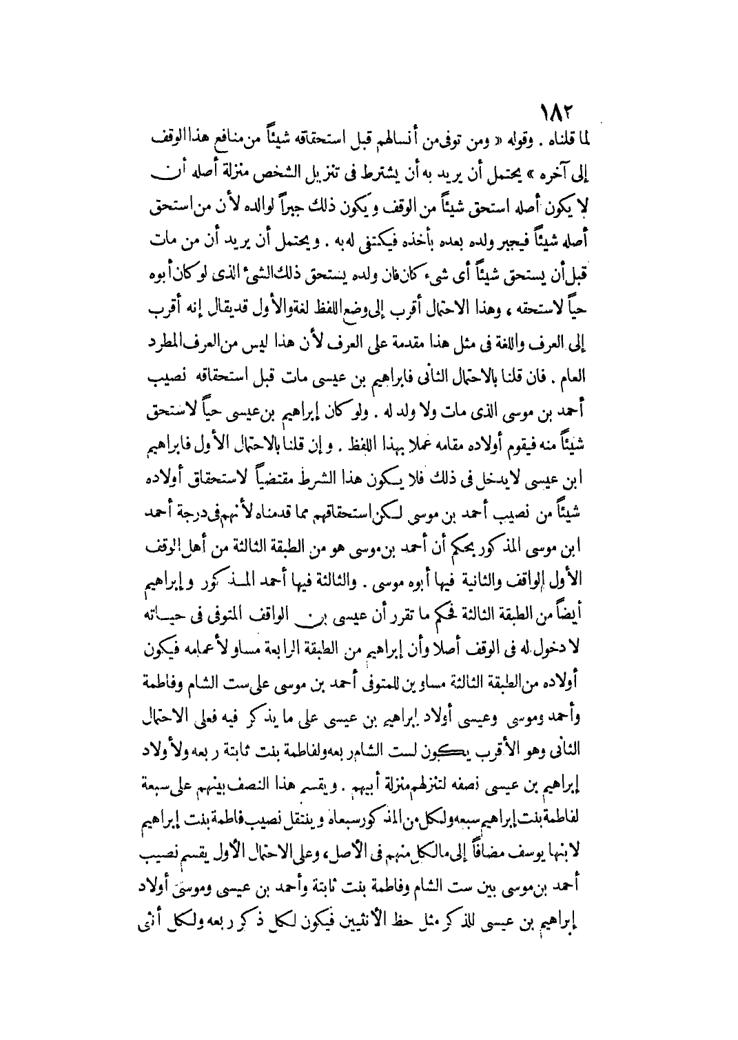 وَإِنْ قُلْنَا بِالِاحْتِمَالِ الْأَوَّلِ فَإِبْرَاهِيمُ ابْنُ عِيسَى لَا يَدْخُلُ فِي ذَلِكَ فَلَا يَكُونُ هَذَا الشَّرْطُ مُقْتَضِيًا لِاسْتِحْقَاقِ أَوْلَادِهِ شَيْئًا مِنْ نَصِيبِ أَحْمَدَ بْنِ مُوسَى لَكِنَّ اسْتِحْقَاقَهُمْ مِمَّا قَدَّمْنَاهُ؛ لِأَنَّهُمْ فِي دَرَجَةِ أَحْمَدَ ابْنِ مُوسَى الْمَذْكُورِ بِحُكْمِ أَنَّ أَحْمَدَ بْنَ مُوسَى هُوَ مِنْ الطَّبَقَةِ الثَّالِثَةِ مِنْ أَهْلِ الْوَقْفِ الْأَوَّلِ الْوَاقِفِ وَالثَّانِيَةُ فِيهَا أَبُوهُ مُوسَى.