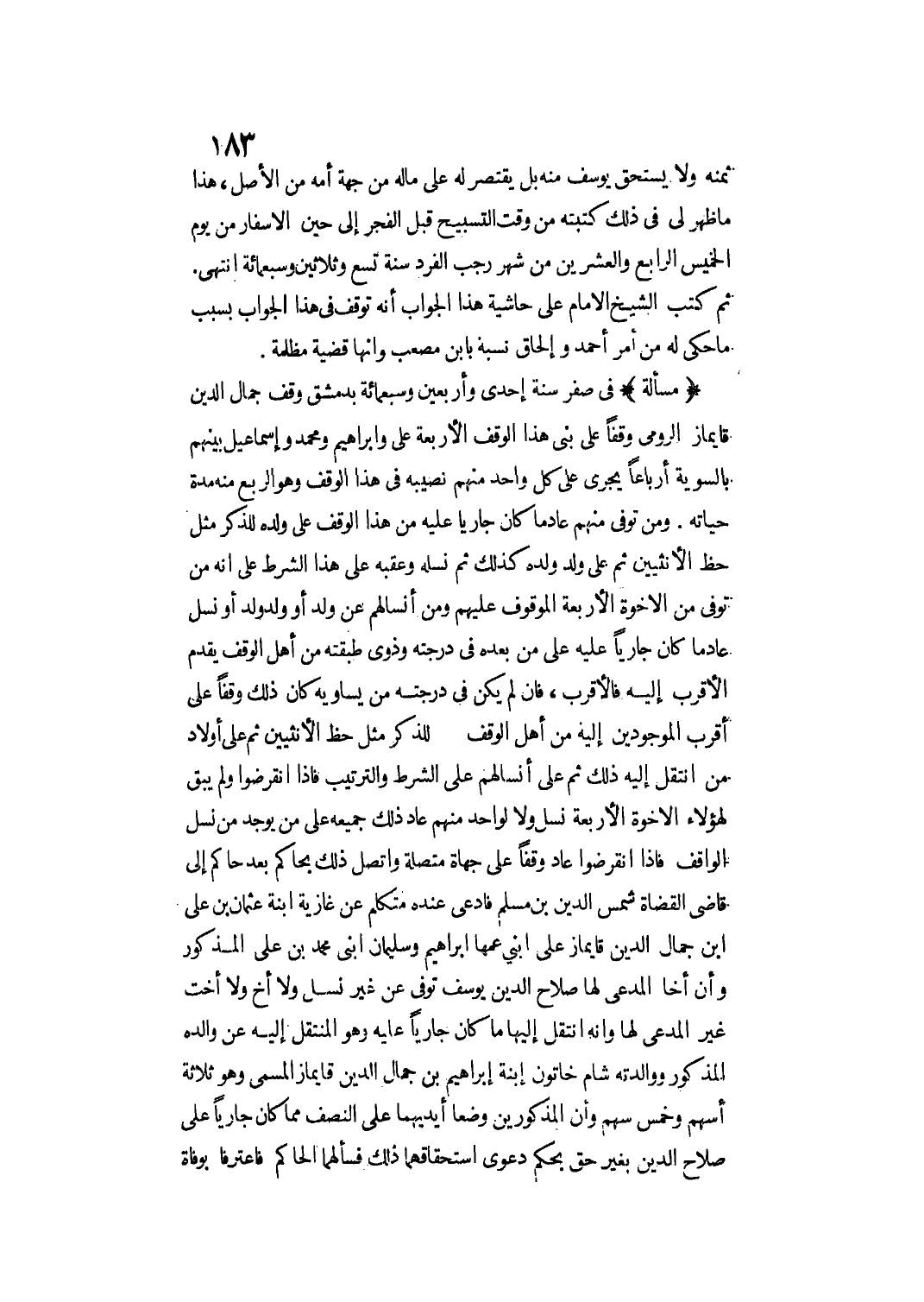(مَسْأَلَةٌ) فِي صَفَرٍ سَنَةَ إحْدَى وَأَرْبَعِينَ وَسَبْعِمِائَةٍ بِدِمَشْقَ وَقَفَ جَمَالُ الدِّينِ قَايْمَازُ الرُّومِيِّ وَقْفًا عَلَى بَنِي هَذَا الْوَقْفِ الْأَرْبَعَةِ عَلِيٌّ وَإِبْرَاهِيمُ وَمُحَمَّدٌ وَإِسْمَاعِيلُ بَيْنَهُمْ بِالسَّوِيَّةِ أَرْبَاعًا يَجْرِي عَلَى كُلِّ وَاحِدٍ مِنْهُمْ نَصِيبُهُ فِي هَذَا الْوَقْفِ وَهُوَ الرُّبُعُ مِنْهُ مُدَّةَ حَيَاتِهِ.
