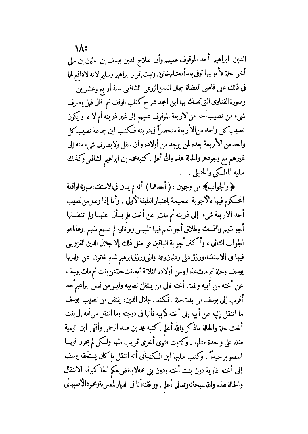 وَهَذَا هُوَ الْجَوَابُ الثَّانِي، وَأَكْثَرُ أَجْوِبَةِ الْبَاقِينَ عَلَى مِثْلِ ذَلِكَ إلَّا جَلَالَ الدِّينِ الْقَزْوِينِيَّ فِيهَا فِي الِاسْتِفْتَاءِ وَرُزِقَ عَلِيٌّ وَعُثْمَانُ وَمُحَمَّدٌ وَاَلَّتِي رُزِقَ إبْرَاهِيمُ شَامْ خَاتُونَ عَنْ وَلَدَيْهَا يُوسُفَ وَحُلَّةَ ثُمَّ مَاتَ عَنْهَا وَعَنْ أَوْلَادِهِ الثَّلَاثَةِ ثُمَّ مَاتَتْ حُلَّةُ عَنْ بِنْتٍ ثُمَّ مَاتَ يُوسُفُ عَنْ أُخْتِهِ مِنْ أَبِيهِ وَبِنْتِ أُخْتِهِ فَإِلَى مَنْ يَنْتَقِلُ نَصِيبُهُ وَلَيْسَ مِنْ نَسْلِ إبْرَاهِيمَ أَحَدٌ أَقْرَبُ إلَى يُوسُفَ مِنْ بِنْتِ حُلَّةَ.