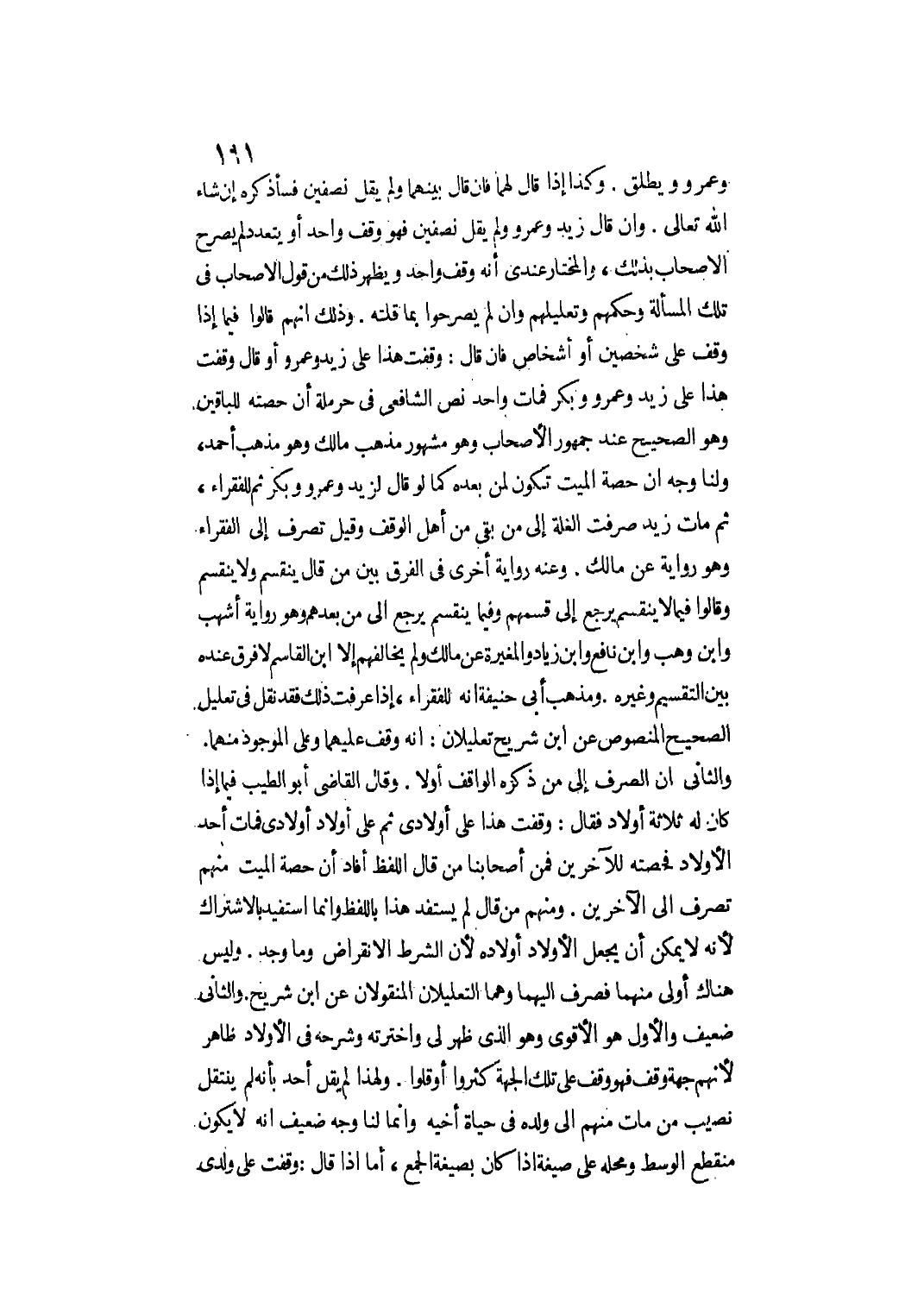 وَذَلِكَ أَنَّهُمْ قَالُوا فِيمَا إذَا وَقَفَ عَلَى شَخْصَيْنِ أَوْ أَشْخَاصٍ فَإِنْ قَالَ: وَقَفْت هَذَا عَلَى زَيْدٍ وَعَمْرٍو أَوْ قَالَ وَقَفْت هَذَا عَلَى زَيْدٍ وَعَمْرٍو وَبَكْرٍ فَمَاتَ وَاحِدٌ نَصَّ الشَّافِعِيُّ فِي حَرْمَلَةَ أَنَّ حِصَّتَهُ لِلْبَاقِينَ وَهُوَ الصَّحِيحُ عِنْدَ جُمْهُورِ الْأَصْحَابِ وَهُوَ مَشْهُورُ مَذْهَبِ مَالِكٍ وَهُوَ مَذْهَبُ أَحْمَدَ، وَلَنَا وَجْهٌ أَنَّ حِصَّةَ الْمَيِّتِ تَكُونُ لِمَنْ بَعْدَهُ كَمَا لَوْ قَالَ لِزَيْدٍ وَعَمْرٍو وَبَكْرٍ ثُمَّ لِلْفُقَرَاءِ، ثُمَّ مَاتَ زَيْدٌ صُرِفَتْ الْغَلَّةُ إلَى مَنْ بَقِيَ مِنْ أَهْلِ الْوَقْفِ وَقِيلَ تُصْرَفُ إلَى الْفُقَرَاءِ وَهُوَ رِوَايَةٌ عَنْ مَالِكٍ.