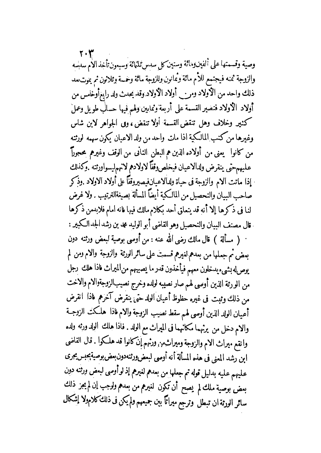وَلَا غَرَضَ لَنَا فِي ذِكْرِهَا إلَّا أَنَّهُ قَدْ يَتَعَلَّقُ أَحَدٌ بِكَلَامِ مَالِكٍ فِيهَا فَإِنَّهُ إمَامٌ فَلَا بُدَّ مِنْ ذِكْرِهَا قَالَ مُصَنِّفُ الْبَيَانِ وَالتَّحْصِيلِ وَهُوَ الْقَاضِي أَبُو الْوَلِيدِ مُحَمَّدُ بْنُ رُشْدٍ الْجَدُّ الْكَبِيرُ: