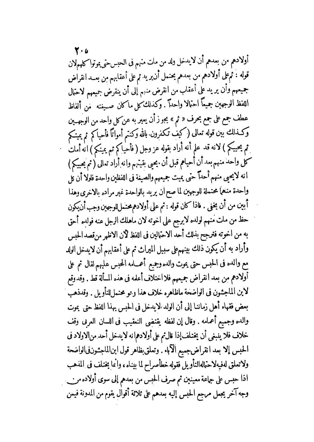 أَوْلَادِهِمْ مِنْ بَعْدِهِمْ أَنْ لَا يَدْخُلَ وَلَدُ مَنْ مَاتَ مِنْهُمْ فِي الْحَبْسِ حَتَّى يَمُوتُوا كُلُّهُمْ؛ لِأَنَّ قَوْلَهُ: ثُمَّ عَلَى أَوْلَادِهِمْ مِنْ بَعْدِهِمْ يَحْتَمِلُ أَنْ يُرِيدَ ثُمَّ عَلَى أَعْقَابِهِمْ مِنْ بَعْدِ انْقِرَاضِ جَمِيعِهِمْ وَأَنْ يُرِيدَ عَلَى أَعْقَابِ مَنْ انْقَرَضَ مِنْهُمْ إلَى أَنْ يَنْقَرِضَ جَمِيعُهُمْ لِاحْتِمَالِ اللَّفْظِ الْوَجْهَيْنِ جَمِيعًا احْتِمَالًا وَاحِدًا.
