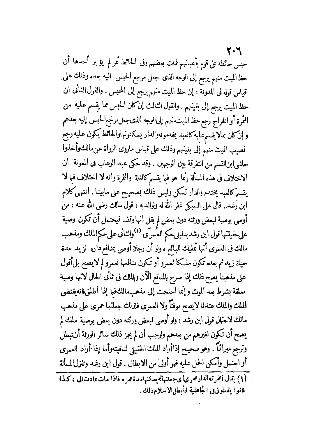وَقَدْ حَكَى عَبْدُ الْوَهَّابِ فِي الْمَعُونَةِ أَنَّ الِاخْتِلَافَ فِي هَذِهِ الْمَسْأَلَةِ إنَّمَا هُوَ فِيمَا يُقَسَّمُ كَالْغَلَّةِ وَالثَّمَرَةِ وَأَنَّهُ لَا اخْتِلَافَ فِيمَا لَا يُقَسَّمُ كَالْعَبْدِ يَخْتَدِمُ وَالدَّارِ تُسْكَنُ وَلَيْسَ ذَلِكَ بِصَحِيحٍ عَلَى مَا بَيَّنَّا انْتَهَى كَلَامُ ابْنِ رُشْدٍ.