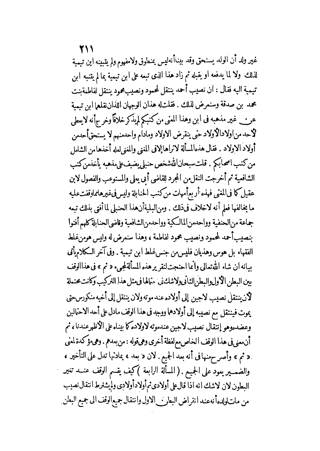 وَمِنْ الْبَلِيَّةِ أَنَّ هَذَا الْحَنْبَلِيَّ لَمَّا أَفْتَى بِذَلِكَ تَبِعَهُ جَمَاعَةٌ مِنْ الْحَنَفِيَّةِ وَوَاحِدٌ مِنْ الْمَالِكِيَّةِ وَوَاحِدٌ مِنْ الشَّافِعِيَّةِ وَقَاضِي الْحَنَابِلَةِ كُلُّهُمْ أَفْتَوْا بِنَصِيبِ أَحْمَدَ لِمَحْمُودٍ وَنَصِيبِ مَحْمُودٍ لِفَاطِمَةَ، وَهَذَا سَنَعْرِضُ لَهُ وَلَيْسَ هُوَ مِنْ غَلَطِ الْفُقَهَاءِ بَلْ هَوَسٌ وَهَذَيَانٌ فَلَيْسَ مِنْ جِنْسِ غَلَطِ ابْنِ تَيْمِيَّةَ.