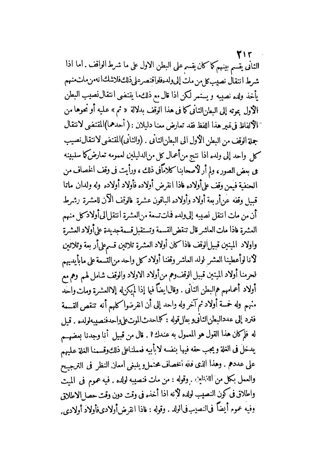 (وَالثَّانِي) الْمُقْتَضِي لِانْتِقَالِ نَصِيبِ كُلِّ وَاحِدٍ إلَى وَلَدِهِ إذَا نَتَجَ مِنْ أَعْمَالِ كُلٍّ مِنْ الدَّلِيلَيْنِ لِعُمُومِهِ تَعَارُضٌ كَمَا سَنُبَيِّنُهُ فِي بَعْضِ الصُّوَرِ، وَلَمْ أَرَ لِأَصْحَابِنَا كَلَامًا فِي ذَلِكَ، وَرَأَيْت فِي وَقْفِ الْخَصَّافِ مِنْ الْحَنَفِيَّةِ فِيمَنْ وَقَفَ عَلَى أَوْلَادِهِ فَإِذَا انْقَرَضَ أَوْلَادُهُ فَأَوْلَادِ أَوْلَادِهِ وَلَهُ وَلَدَانِ مَاتَا قُبَيْلَ وَقْفِهِ عَنْ أَرْبَعَةِ أَوْلَادٍ وَأَوْلَادُهُ الْبَاقُونَ عَشَرَةٌ فَالْوَقْفُ الْآنَ لِلْعَشَرَةِ وَشَرَطَ أَنَّ مَنْ مَاتَ انْتَقَلَ نَصِيبُهُ إلَى وَلَدِهِ فَمَاتَ تِسْعَةٌ مِنْ الْعَشَرَةِ انْتَقَلَ إلَى أَوْلَادِ كُلٍّ مِنْهُمْ الْعَشَرَةِ فَإِذَا مَاتَ الْعَاشِرُ قَالَ تُنْقَضُ الْقِسْمَةُ وَتُسْتَقْبَلُ قِسْمَةٌ جَدِيدَةٌ عَلَى أَوْلَادِ الْعَشَرَةِ وَأَوْلَادِ الْمَيِّتِينَ قُبَيْلَ الْوَقْفِ فَإِذَا كَانَ أَوْلَادُ الْعَشَرَةِ ثَلَاثِينَ قُسِّمَ عَلَى أَرْبَعَةٍ وَثَلَاثِينَ؛ لِأَنَّا لَوْ أَعْطَيْنَا الْعَشَرَ لِوَلَدِ الْعَاشِرِ وَوَقَفْنَا أَوْلَادَ كُلِّ وَاحِدٍ مِنْ التِّسْعَةِ عَلَى مَا بِأَيْدِيهِمْ لَحَرَمْنَا أَوْلَادَ الْمَيِّتِينَ قُبَيْلَ الْوَقْفِ وَهُمْ مِنْ أَوْلَادِ الْأَوْلَادِ وَالْوَقْفُ شَامِلٌ لَهُمْ وَهُمْ مَعَ أَوْلَادِ أَعْمَامِهِمْ هُمْ الْبَطْنُ الثَّانِي.