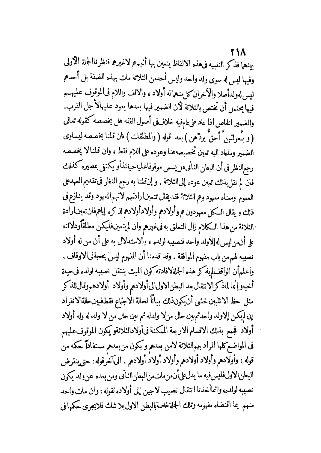 بَيْنَهُمَا فَذِكْرُ التَّنْبِيهِ فِي هَذِهِ الْأَلْفَاظِ يَتَعَيَّنُ بِهَا أَنَّهُمْ هُمْ لَا غَيْرُهُمْ فَنَظَرْنَا الْجُمْلَةَ الْأُولَى وَفِيهَا لَيْسَ لَهُ سِوَى وَلَدٍ وَاحِدٍ وَلَيْسَ أَحَدٌ مِنْ الثَّلَاثَةِ مَاتَ بِهَذِهِ الصِّفَةِ بَلْ أَحَدُهُمْ لَيْسَ لَهُ وَلَدٌ أَصْلًا وَالْآخَرَانِ كُلٌّ مِنْهُمَا لَهُ أَوْلَادٌ، وَالْأَلِفُ وَاللَّامُ فِي الْمَوْقُوفِ عَلَيْهِمْ فِيهَا يَحْتَمِلُ أَنْ تَخْتَصَّ بِالثَّلَاثَةِ؛ لِأَنَّ الضَّمِيرَ فِيهَا بَعْدَهَا يَعُودُ عَلَيْهَا لِأَجْلِ الْقُرْبِ.