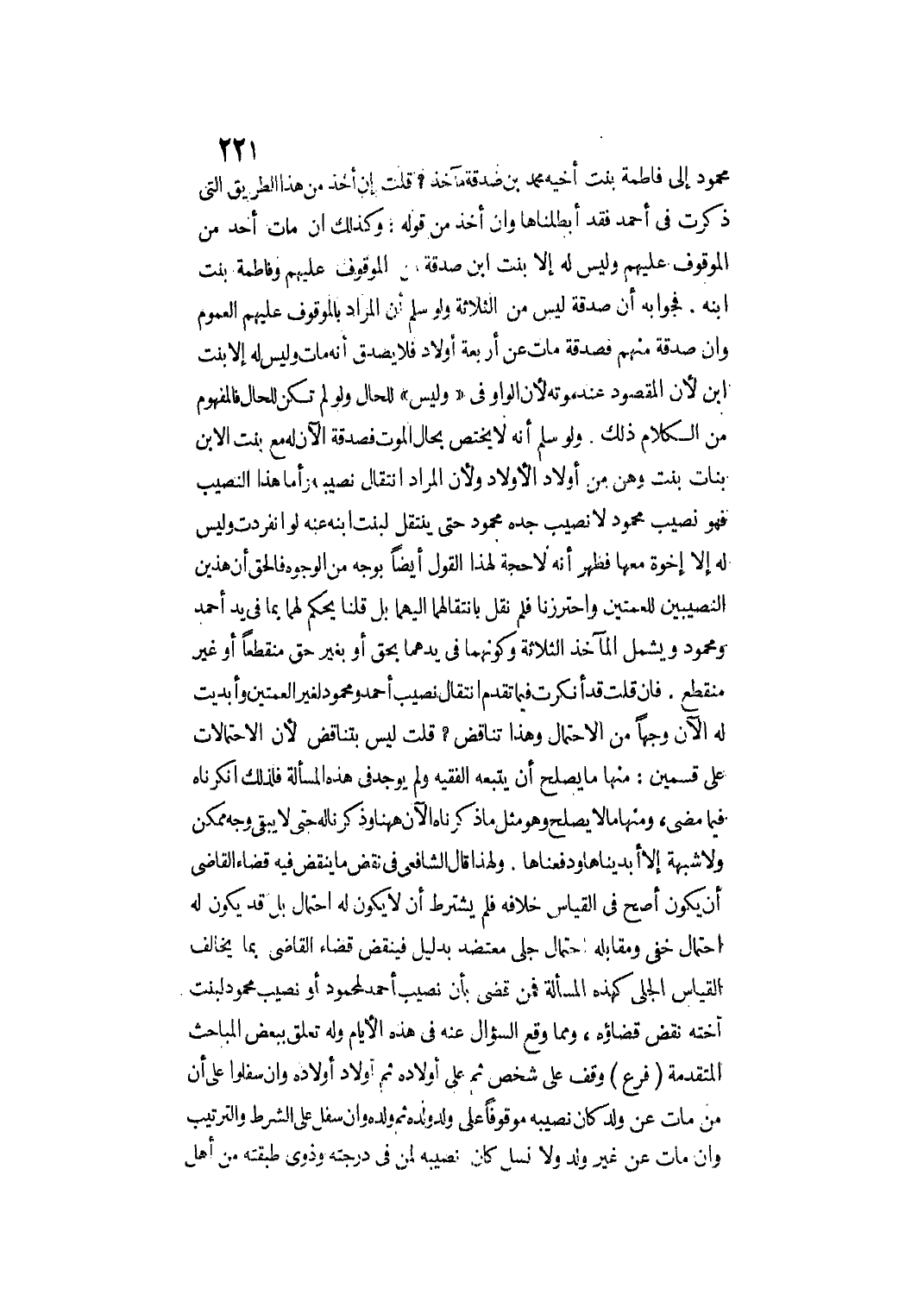 وَلِهَذَا قَالَ الشَّافِعِيُّ فِي نَقْضِ مَا يُنْقَضُ فَبِهِ قَضَاءُ الْقَاضِي أَنْ يَكُونَ أَصَحَّ فِي الْقِيَاسِ خِلَافُهُ فَلَمْ يُشْتَرَطْ أَنْ لَا يَكُونَ لَهُ احْتِمَالٌ بَلْ قَدْ يَكُونُ لَهُ احْتِمَالٌ خَفِيٌّ وَمُقَابِلُهُ احْتِمَالٌ جَلِيٌّ مُعْتَضِدٌ بِدَلِيلٍ فَيُنْقَضُ قَضَاءُ الْقَاضِي بِمَا يُخَالِفُ الْقِيَاسَ الْجَلِيَّ كَهَذِهِ الْمَسْأَلَةِ فَمَنْ قَضَى بِأَنَّ نَصِيبَ أَحْمَدَ لِمَحْمُودٍ أَوْ نَصِيبَ مَحْمُودٍ لِبِنْتِ أُخْتِهِ نُقِضَ قَضَاؤُهُ، وَمِمَّا وَقَعَ السُّؤَالُ عَنْهُ فِي هَذِهِ الْأَيَّامِ وَلَهُ تَعَلُّقٌ بِبَعْضِ الْمَبَاحِثِ الْمُتَقَدِّمَةِ.