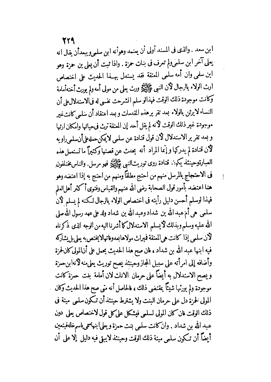 وَالنَّاسُ مُخْتَلِفُونَ فِي الِاحْتِجَاجِ بِالْمُرْسَلِ مِنْهُمْ مَنْ احْتَجَّ مُطْلَقًا وَمِنْهُمْ مَنْ احْتَجَّ بِهِ إذَا اعْتَضَدَ وَهُوَ هُنَا اعْتَضَدَ بِأُمُورٍ: قَوْلِ الصَّحَابَةِ - رَضِيَ اللَّهُ عَنْهُمْ - وَالْقِيَاسِ، وَفَتْوَى أَكْثَرِ أَهْلِ الْعِلْمِ فَهَذَا لَوْ سَلِمَ أَحْسَنُ دَلِيلٍ رَأَيْته فِي اخْتِصَاصِ الْوَلَاءِ بِالرِّجَالِ لَكِنَّهُ لَمْ يَسْلَمْ؛ لِأَنَّ سَلْمَى هِيَ أُمُّ عَبْدِ اللَّهِ بْنِ شَدَّادٍ وَعَبْدُ اللَّهِ بْنُ شَدَّادٍ وُلِدَ عَلَى عَهْدِ رَسُولِ اللَّهِ - صَلَّى اللَّهُ عَلَيْهِ وَسَلَّمَ - وَبِذَلِكَ لَا يَسْلَمُ الِاسْتِدْلَال كَمَا أَشَرْنَا إلَيْهِ مِنْ الْوَجْهِ الَّذِي ذَكَرْنَاهُ؛ لِأَنَّ سَلْمَى إذَا كَانَتْ هِيَ الْمُعْتِقَةُ فَمِيرَاثُ مَوْلَاهَا بَعْدَ وَفَاتِهَا لَا يَخْتَصُّ بِهِ يَعْلَى بَلْ يُشَارِكُهُ فِيهِ ابْنُهَا عَبْدُ اللَّهِ بْنُ شَدَّادٍ، فَإِنْ صَحَّ هَذَا الْحَدِيثُ يُحْمَلُ عَلَى أَنَّ الْمَوْلَى كَانَ لِحَمْزَةَ وَأَضَافَهُ إلَى امْرَأَتِهِ عَلَى سَبِيلِ الْمَجَازِ وَحِينَئِذٍ يَصِحُّ تَوْرِيثُ يَعْلَى مِنْهُ؛ لِأَنَّهُ ابْنُ حَمْزَةَ وَيَصِحُّ الِاسْتِدْلَال بِهِ أَيْضًا عَلَى حِرْمَانِ الْإِنَاثِ؛ لِأَنَّ أُمَامَةَ بِنْتَ حَمْزَةَ كَانَتْ مَوْجُودَةً وَلَمْ يُوَرِّثْهَا شَيْئًا بِمُقْتَضَى ذَلِكَ، فَالْحَاصِلُ أَنَّهُ مَتَى صَحَّ هَذَا الْحَدِيثُ وَكَانَ الْمَوْلَى لِحَمْزَةَ عَلَى حِرْمَانِ الْبِنْتِ وَلَا يُشْتَرَطُ حِينَئِذٍ أَنْ تَكُونَ سَلْمَى مَيِّتَةً فِي ذَلِكَ الْوَقْتِ فَإِنْ كَانَ الْمَوْلَى لِسَلْمَى فَيُشْكِلُ عَلَى كُلِّ قَوْلٍ لِاخْتِصَاصِ يَعْلَى دُونَ عَبْدِ اللَّهِ بْنِ شَدَّادٍ.